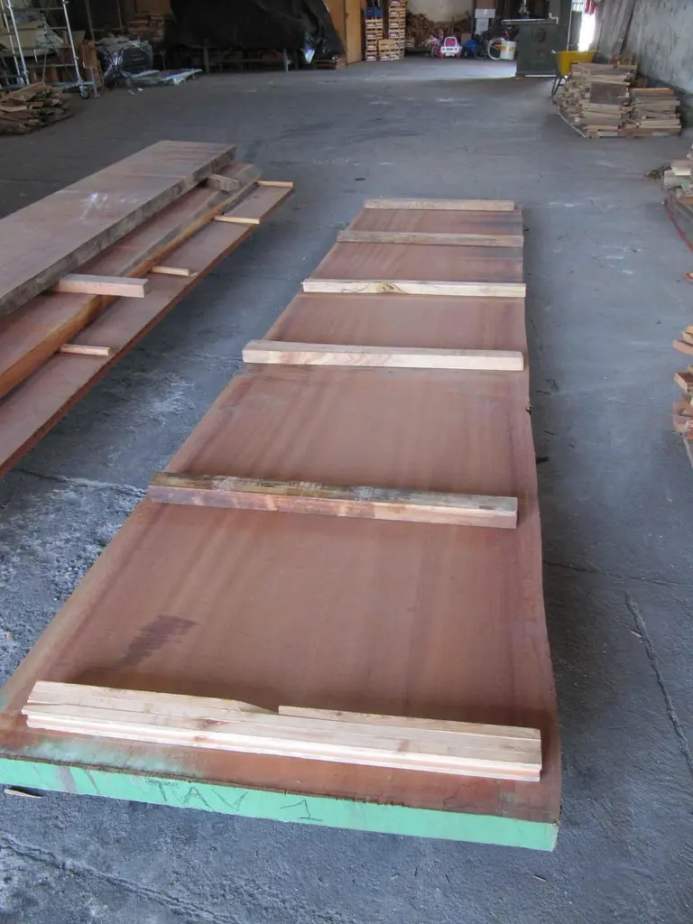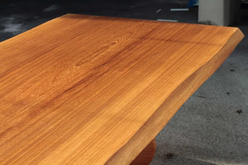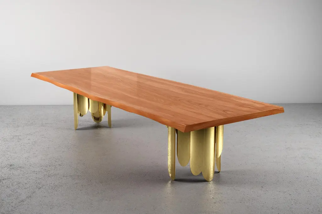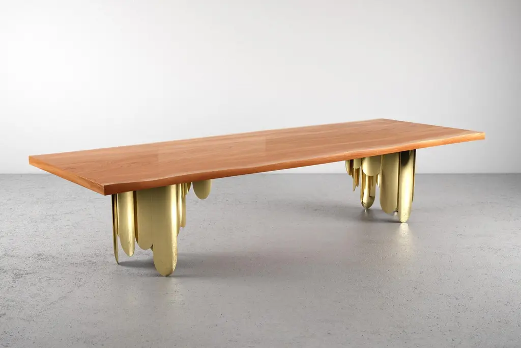 Large Dining Table Live Edge Slab Solid Wood Iroko, Steel Mirror Gold Structure
