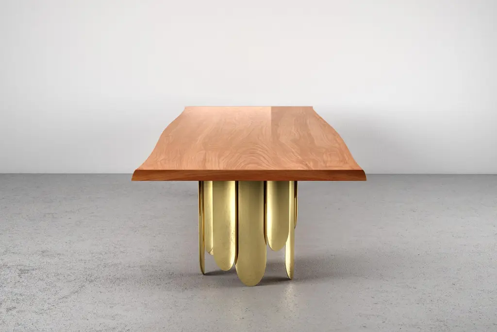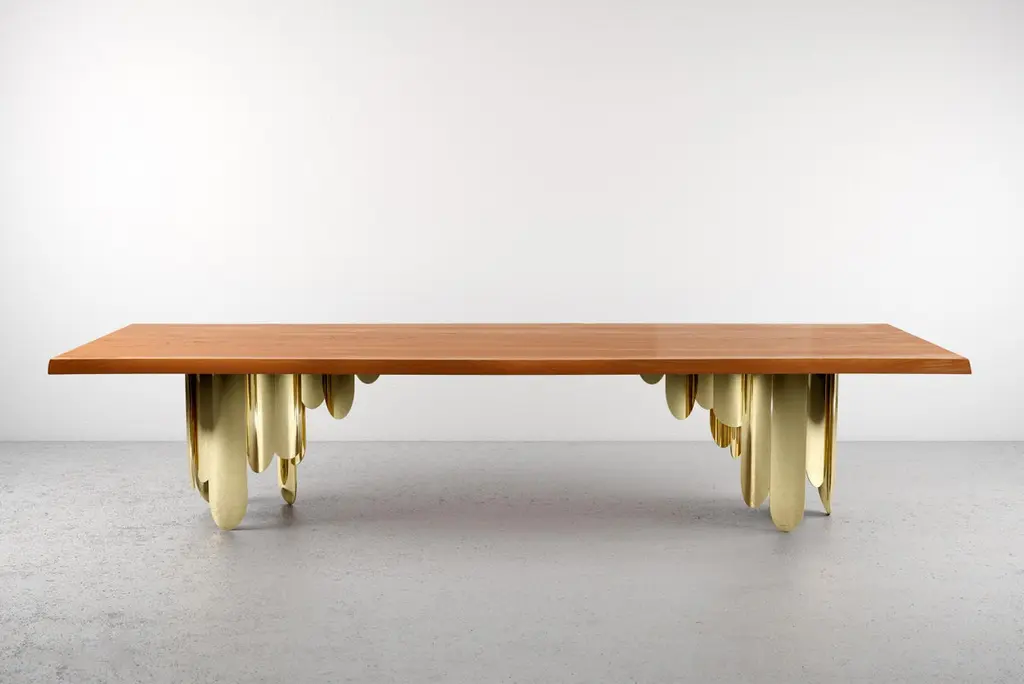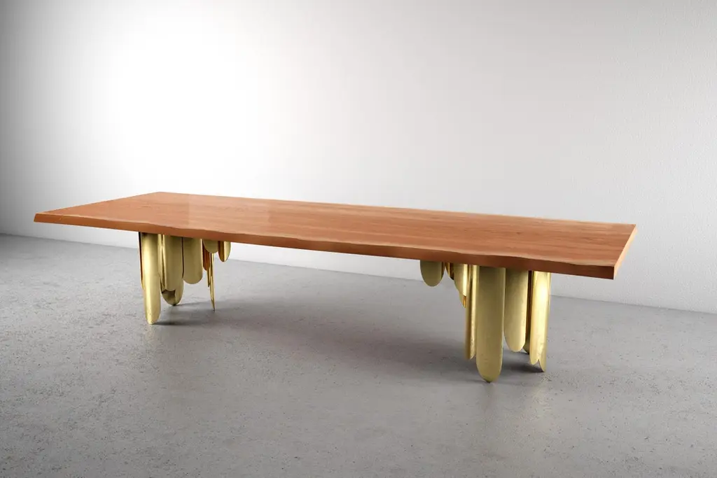 The large "Armadillo" sculptural dining table was designed and created by Atelier Barberini & Gunnell, Italy.The table can accommodate up to 12 people and the structure is made of mirror-polished stainless steel and plated in 24kt gold. Also available in the stainless steel version without gold plating. The feature that makes this table truly special is the live-edge slab in solid Iroko wood. Atelier Barberini & Gunnell collected various slabs of solid Iroko or Mahogany wood essences over the years. These large unique live-edge slabs with very long dimensions are now unobtainable and therefore a great rarity.Table dimension: L 350 x W 125 x H 76 cm. Limited Edition of 10.Each table is hand signed and numbered by the artists (engraved), 100% handmade in Italy and comes with a “Certificate of Authenticity”.The artworks by Barberini & Gunnell are regularly shown at international art fairs, such as PAD London, PAD Genève, PAD Monaco, Salon Art and Design New York, Art Miami.IMPORTANT INFORMATION REGARDING SHIPPING:Please contact us for an independent shipping quote as we provide high quality shipping at competitive prices due to our frequency of shipping, relations with international shipping companies and the possibility to organize directly from Italy.We take care of the entire customs procedure and paperwork. On request we organize a white glove delivery and installation of the artwork inside of the property of the client. All shipments are ALL-RISK insured.We carefully pack all artworks in strong wooden crates to ensure safe transport. This service is done directly in our atelier and is complimentary. All of our artworks travel with a shock watch system in order to monitorate rough handling by shippers and movers.