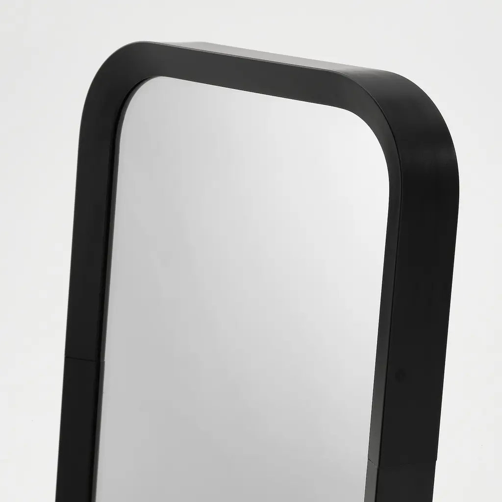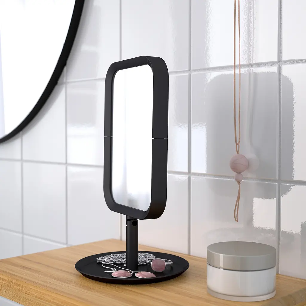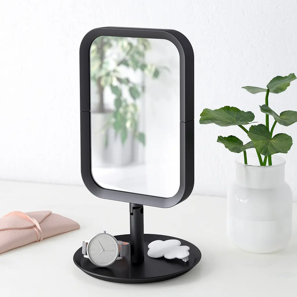 LINDBYN Table mirror - black 5 1/2x10 5/8 ". One side with magnifying mirror glass. Can be used anywhere you like at home – in the bathroom, hallway and bedroom. Provided with safety film - reduces damage if glass is broken. One side of the mirror magnifies approx. 2.5 times.