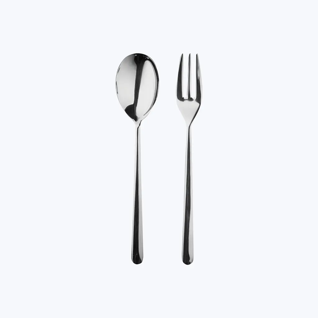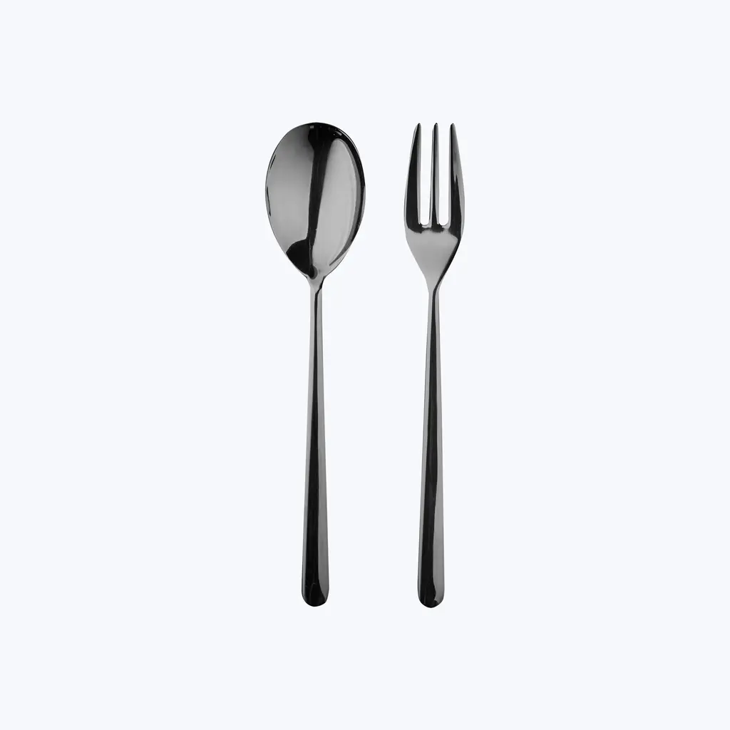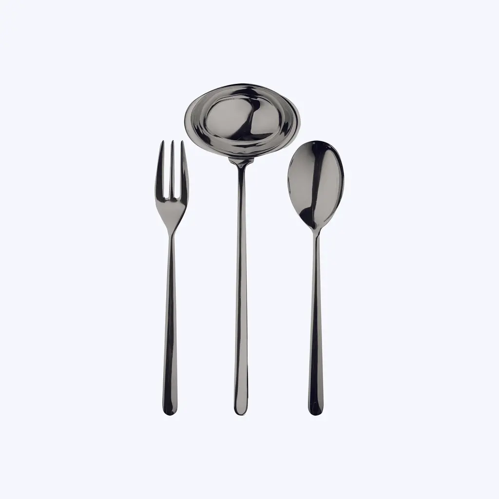 Linea Serveware is made of the highest quality 18/10 steel, 4 mm thick, very durable, and incredibly ergonomic for dinner parties and everyday use. Enhance your dining experience with this beautiful Italian flatware! Dishwasher and food safe. Created in 1947, Mepra is a family-owned and operated company with a worldwide presence in flatware, cookware, and stainless-steel products. Today, Mepra flatware and kitchenware appear on the tables of the most prestigious hotels, award-winning restaurants, and artisanal-centered homes. Bring the magic of three generations worth of Italian traditions, designs, and lifestyles into your kitchen and dining room today. Stainless Steel plating features a special vintage process that gives it a rustic, warm, and elegant appearance while still being durable and inoxidizable coating. Winners of the 2020 Good Design Award, the Bronzo, Oro Nero, Champagne, Oro, and Ice Oro Collections are perfect for the most refined and stylish homes with their pure lines and harmoniously light forms. Ice Champagne, Ice Bronze, Ice, and Ice Oro Nero are coated with a PVD Titanium Coating that is tested and guaranteed for more than 3000 washes in a commercial dishwasher. The special Titanium Plating was originally developed by NASA, resulting in a durable and inoxidizable coating like non-other. 7 Piece Full Serving Set includes (1) Serving Fork, (1) Serving Spoon, (1) Salad Serving Fork, (1) Salad Serving Spoon, (1) Soup Ladle, (1) Gravy Ladle, and (1) Cake Server