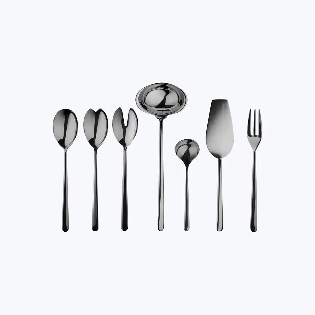 Linea Serveware is made of the highest quality 18/10 steel, 4 mm thick, very durable, and incredibly ergonomic for dinner parties and everyday use. Enhance your dining experience with this beautiful Italian flatware! Dishwasher and food safe. Created in 1947, Mepra is a family-owned and operated company with a worldwide presence in flatware, cookware, and stainless-steel products. Today, Mepra flatware and kitchenware appear on the tables of the most prestigious hotels, award-winning restaurants, and artisanal-centered homes. Bring the magic of three generations worth of Italian traditions, designs, and lifestyles into your kitchen and dining room today. Stainless Steel plating features a special vintage process that gives it a rustic, warm, and elegant appearance while still being durable and inoxidizable coating. Winners of the 2020 Good Design Award, the Bronzo, Oro Nero, Champagne, Oro, and Ice Oro Collections are perfect for the most refined and stylish homes with their pure lines and harmoniously light forms. Ice Champagne, Ice Bronze, Ice, and Ice Oro Nero are coated with a PVD Titanium Coating that is tested and guaranteed for more than 3000 washes in a commercial dishwasher. The special Titanium Plating was originally developed by NASA, resulting in a durable and inoxidizable coating like non-other. 7 Piece Full Serving Set includes (1) Serving Fork, (1) Serving Spoon, (1) Salad Serving Fork, (1) Salad Serving Spoon, (1) Soup Ladle, (1) Gravy Ladle, and (1) Cake Server