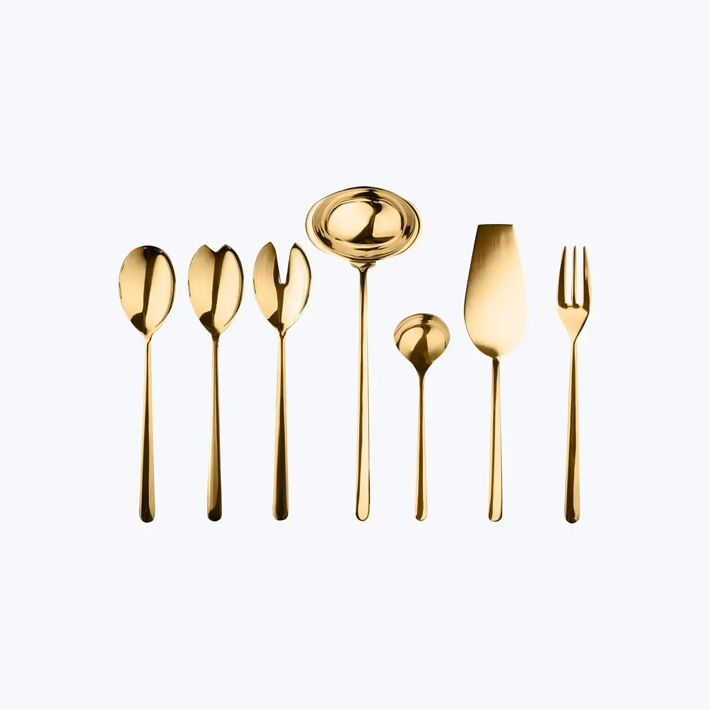 Linea Serveware is made of the highest quality 18/10 steel, 4 mm thick, very durable, and incredibly ergonomic for dinner parties and everyday use. Enhance your dining experience with this beautiful Italian flatware! Dishwasher and food safe. Created in 1947, Mepra is a family-owned and operated company with a worldwide presence in flatware, cookware, and stainless-steel products. Today, Mepra flatware and kitchenware appear on the tables of the most prestigious hotels, award-winning restaurants, and artisanal-centered homes. Bring the magic of three generations worth of Italian traditions, designs, and lifestyles into your kitchen and dining room today. Stainless Steel plating features a special vintage process that gives it a rustic, warm, and elegant appearance while still being durable and inoxidizable coating. Winners of the 2020 Good Design Award, the Bronzo, Oro Nero, Champagne, Oro, and Ice Oro Collections are perfect for the most refined and stylish homes with their pure lines and harmoniously light forms. Ice Champagne, Ice Bronze, Ice, and Ice Oro Nero are coated with a PVD Titanium Coating that is tested and guaranteed for more than 3000 washes in a commercial dishwasher. The special Titanium Plating was originally developed by NASA, resulting in a durable and inoxidizable coating like non-other. 7 Piece Full Serving Set includes (1) Serving Fork, (1) Serving Spoon, (1) Salad Serving Fork, (1) Salad Serving Spoon, (1) Soup Ladle, (1) Gravy Ladle, and (1) Cake Server