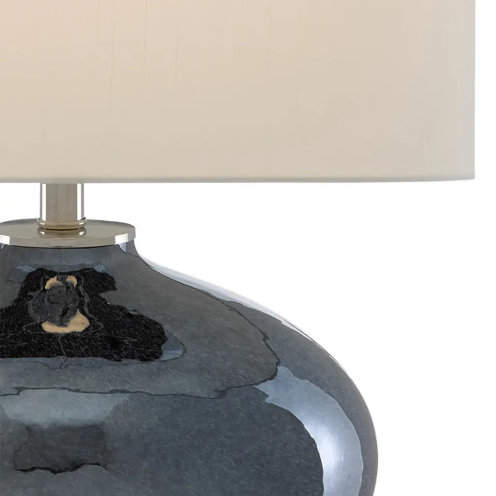 In the tried-and-true tradition of radiant mercury glass, our table lamp shines like few materials can. The rotund body made of luminous plated glass effervesces when light wafts from under the off-white shantung shade, held in place by hardware and a round finial in a polished nickel finish. This is one of our products that illustrates the skill of our glassblowers and finishers.