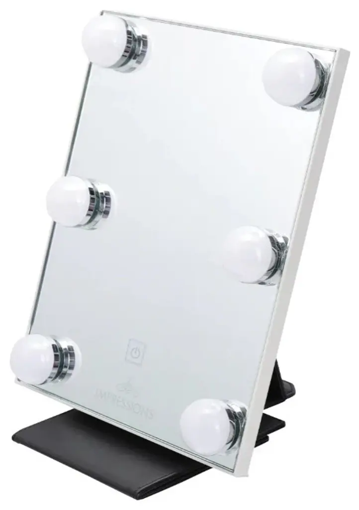 Impressions Vanity Touch Infinity XL LED Makeup Mirror with illuminated light and portable feature. This lighted makeup mirror has energy saving bright LED strip lights, which are activated and dimmable via a touch power sensor. The base includes a storage section to store your earrings, makeup brushes, and other smaller accessories. Powered by batteries so you can take it anywhere with you. The mirror tilts 360 degree and swivels from 180 degree tall to wide for a better mirror viewing angle. Flip the power switch on the back to prevent accidentally turning lights on during travel or when in storage the base includes a catchall tray to store earrings, makeup brushes, and other smaller accessories. Rechargeable so you can take it anywhere with you!Features:PORTABLE DESIGN: This light up mirror for makeup has a detachable and foldable faux crocodile leather cover, which converts into a mirror stand. This personal mirror will surely ease the mess on your travel vanitiesLIGHTED VANITY MIRROR: The lighted vanity mirror for the table help you see every detail of your makeup application and other facial touch-ups. Easily put on your makeup and groom your eyebrows with this lighted makeup mirrorCOMFORTABLE DESIGN: The desk vanity mirror with lights will be your next favorite travel mirror, as it has the perfect size of Width of 11.81 inches, Depth of 1 inch, and height of 16.14 inchesDURABLE MATERIALS: The smart lighted mirror has an aluminum frame with a durable anodized finish and faux crocodile leather cover. So no worries, this LED mirror for makeup can withstand your tough journies and regular use