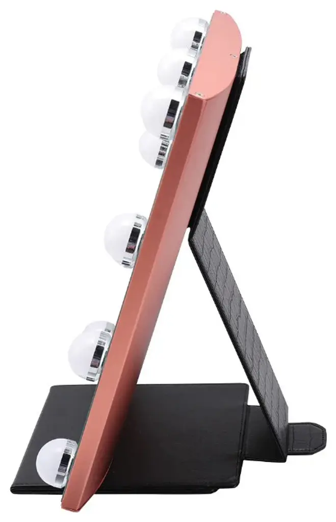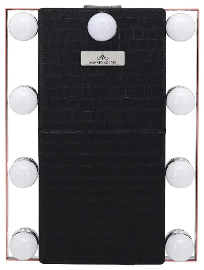 Impressions Vanity Lumiere Touch Pad Pro tabletop lighted makeup mirror with LED Lights. A travel friendly lighted makeup mirror with a premium and stylish faux crocodile leather cover thats detachable and foldable converting into a mirror stand. This rose gold vanity mirror with lights is equipped with a tough aluminum frame and a durable anodized finish. So this makeup mirror for vanity doesnt slow you down on your travel. You can turn your hotel bathroom into your personal beauty studio with this personal light up makeup mirror. This small rectangular mirror includes LED strip lights and a crystal clear view of your entire face and hair, giving you ideal viewing for makeup and other integrated activities. You can dimmer this multi functional smart mirror with a touch sensor switch to adjust the lights brightness. so that you can create the correct makeup looks depending on where you will be going next.Features:PORTABLE DESIGN: This light up mirror for makeup has a detachable and foldable faux crocodile leather cover, which converts into a mirror stand. This personal mirror will surely ease the mess on your travel vanitiesLIGHTED VANITY MIRROR: The lighted vanity mirror for the table helps you see every detail of your makeup application and other facial touch ups. Easily put on your makeup and groom your eyebrows with this lighted makeup mirrorCOMFORTABLE DESIGN: The desk vanity mirror with lights will be your next favorite travel mirror, as it has the perfect size of Width of 11.81 inches, Depth of 1 inch, and height of 16.14 inchesDURABLE MATERIALS: The smart lighted mirror has an aluminum frame with a durable anodized finish and faux crocodile leather cover. So no worries, this LED mirror for makeup can withstand your tough journies and regular use