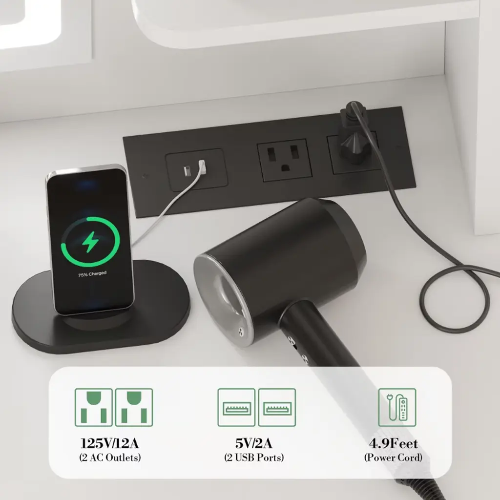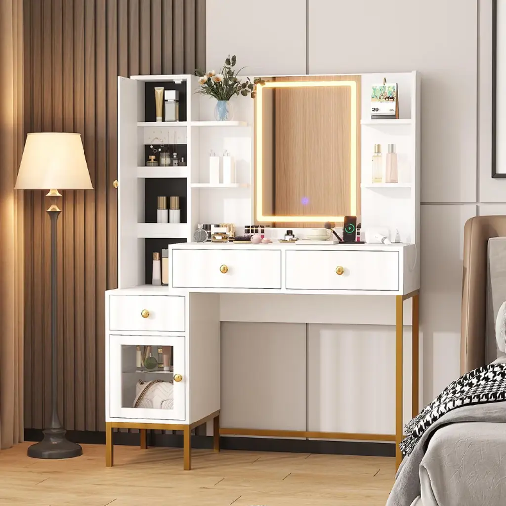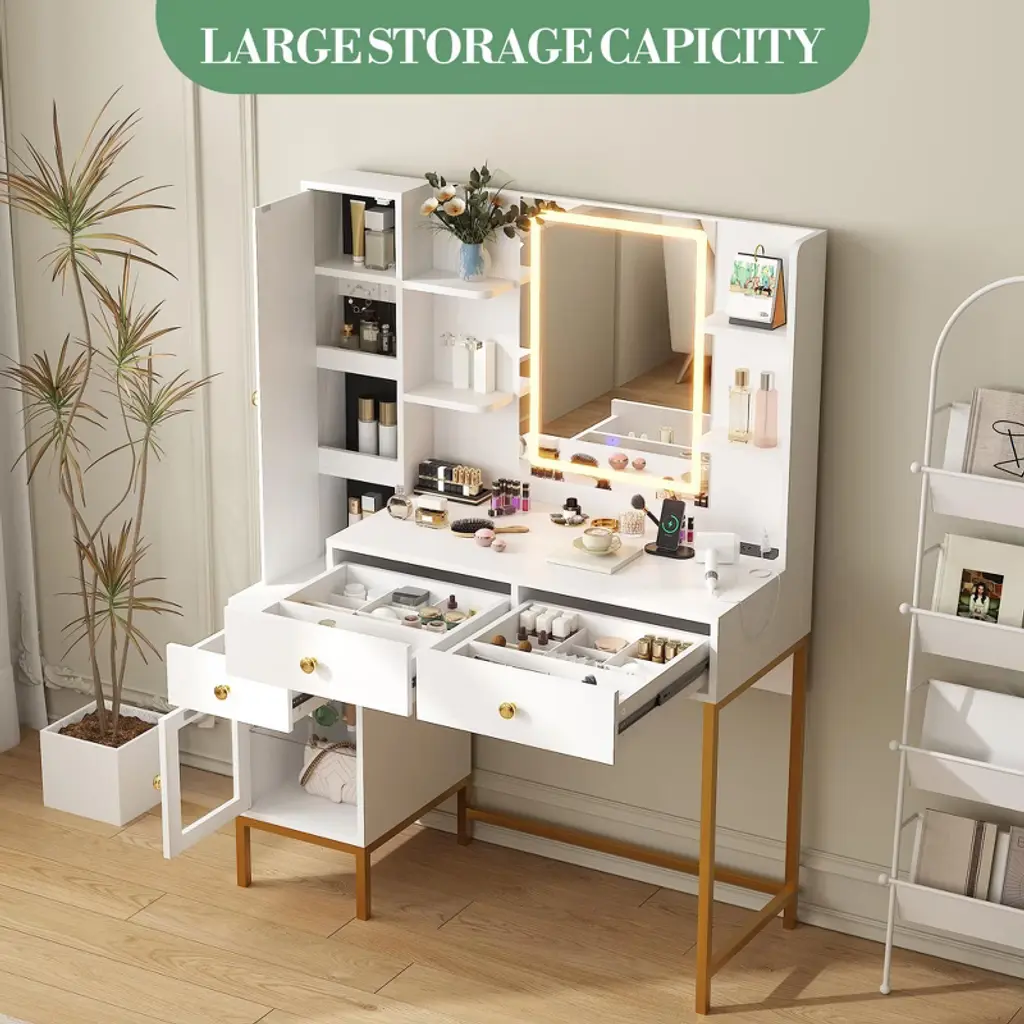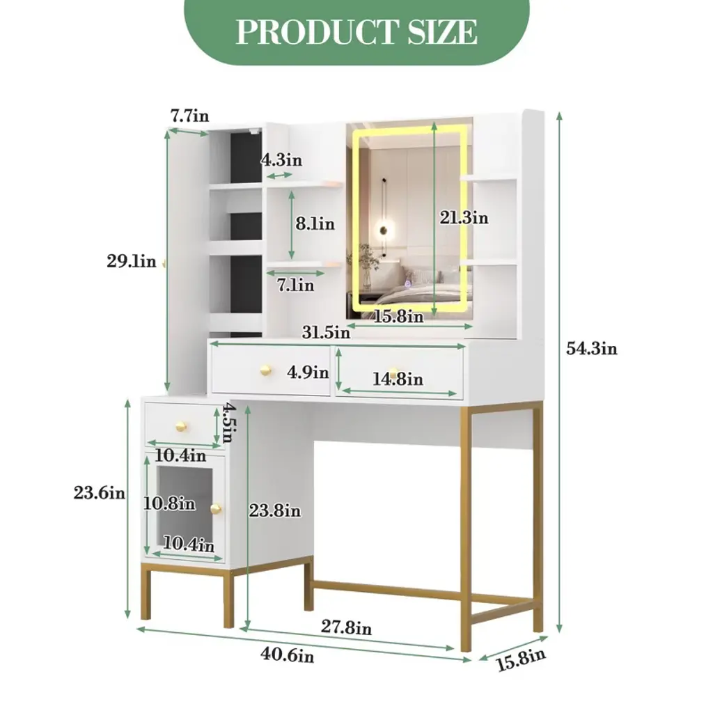Transform your beauty routine with the modern vanity desk featuring a lighted mirror, adjustable lighting modes, ample storage, and a comfortable cushioned stool—perfect for every makeup lover!Specifications:Color: WhiteDimensions: 15.8"D x 40.6"W x 54.3"HMaterial: MDF+MetalHighlights at a Glance:Stylish vanity desk with a lighted mirror and 3 adjustable lighting modes.Ample storage with 3 drawers and open shelves for all your beauty essentials.Convenient charging station with USB ports and AC outlets for easy device access.Comfortable soft cushioned stool perfect for long grooming sessions.Modern design ideal for bedroom makeup tables, perfect for girls and women.Packing List:1x Vanity Desk1x Stool1x Accessory Kit1x Instruction ManualThe Package is divided into two boxesNote:Carefully follow the installation instructions when assembling. Before beginning the installation process, ensure that you have all the parts and tools you need.Before making a purchase, consider factors like height, width, and depth to ensure the size of the item you are considering fits your need.