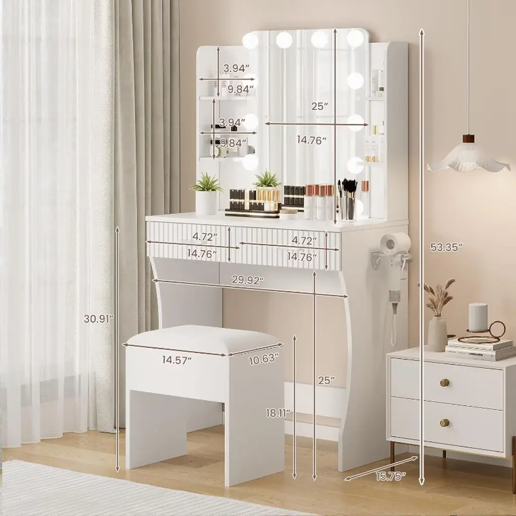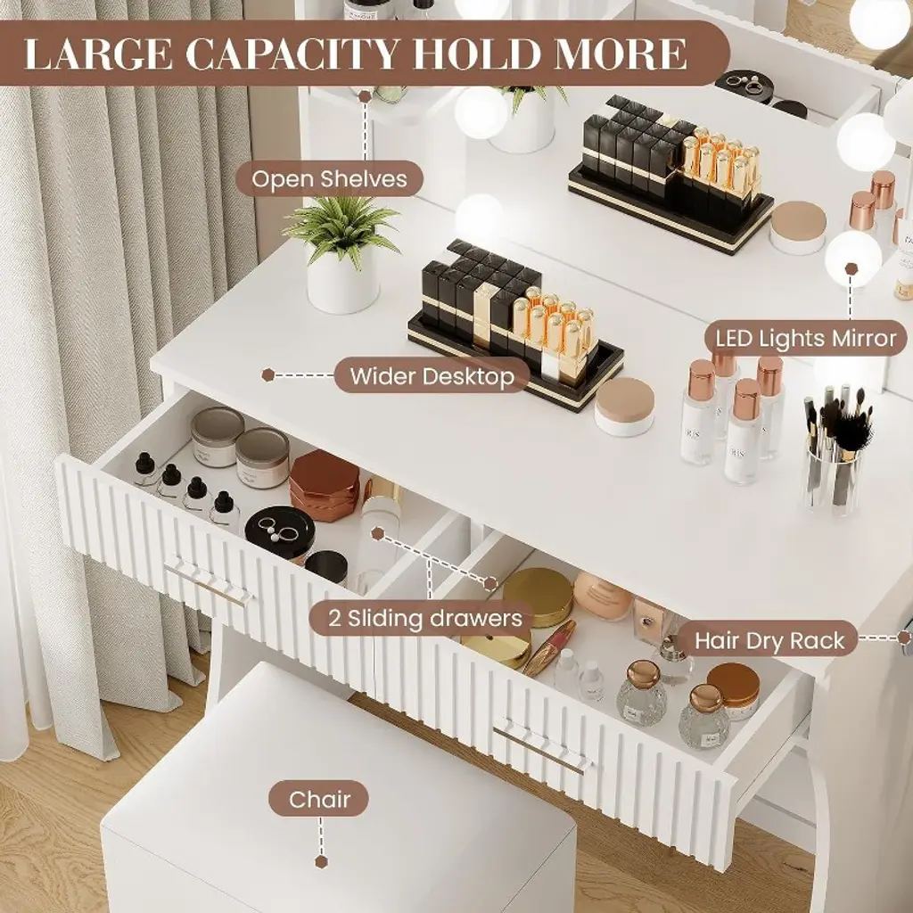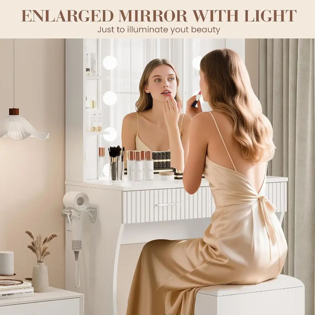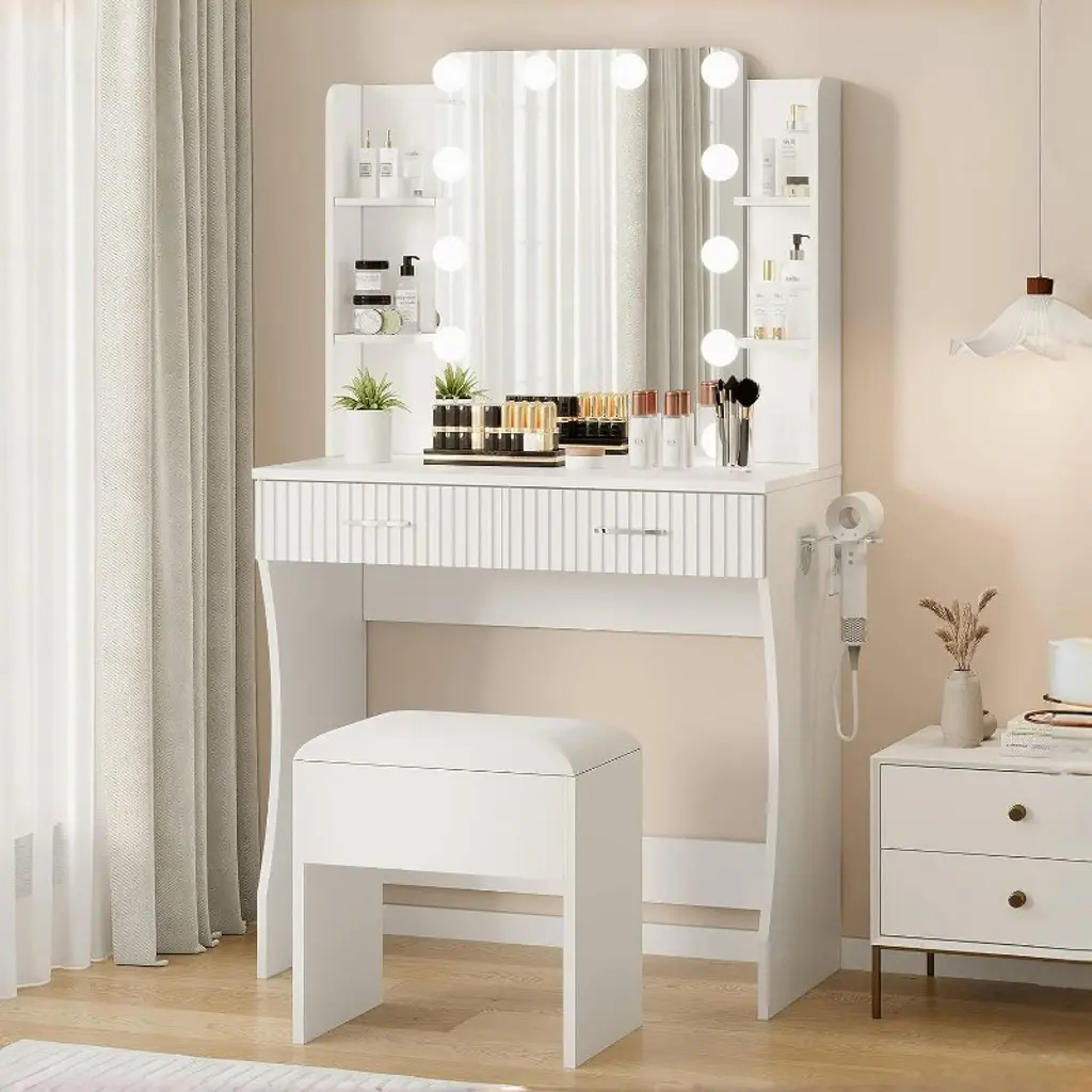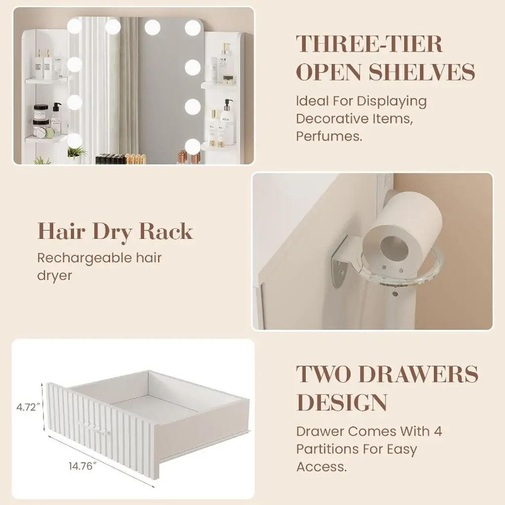 Makeup Vanity Desk with Mirror This white vanity dressing table features stylish wave-textured drawers that blend modern design with elegance. Whether placed in your bedroom or dressing room, this vanity desk enhances your home décor beautifully. Ample Storage Space Designed as a functional makeup vanity, this desk features 2 spacious drawers and 6 open shelves to neatly store cosmetics, skincare, and accessories. The smart layout keeps your makeup table clutter-free for a smoother daily routine. Matching Comfortable Chair A comfortable stool is included with this vanity desk, providing a full and relaxing makeup experience. Its lightweight design makes it easy to move, offering both convenience and comfort. Built-in Power Outlet & Hair Dryer Holder Equipped with 2 AC outlets, 1 USB port, and 1 Type-C port, this vanity with lights allows you to power beauty tools and charge your phone at the same time. A side hair dryer rack adds extra convenience to your makeup vanity desk with lights. Multi-Functional for Any Room This makeup vanity desk with lights is not only perfect for daily beauty routines but can also serve as a dressing table, study desk, or writing desk. A versatile choice for bedrooms, dressing rooms, women or girls’ rooms.