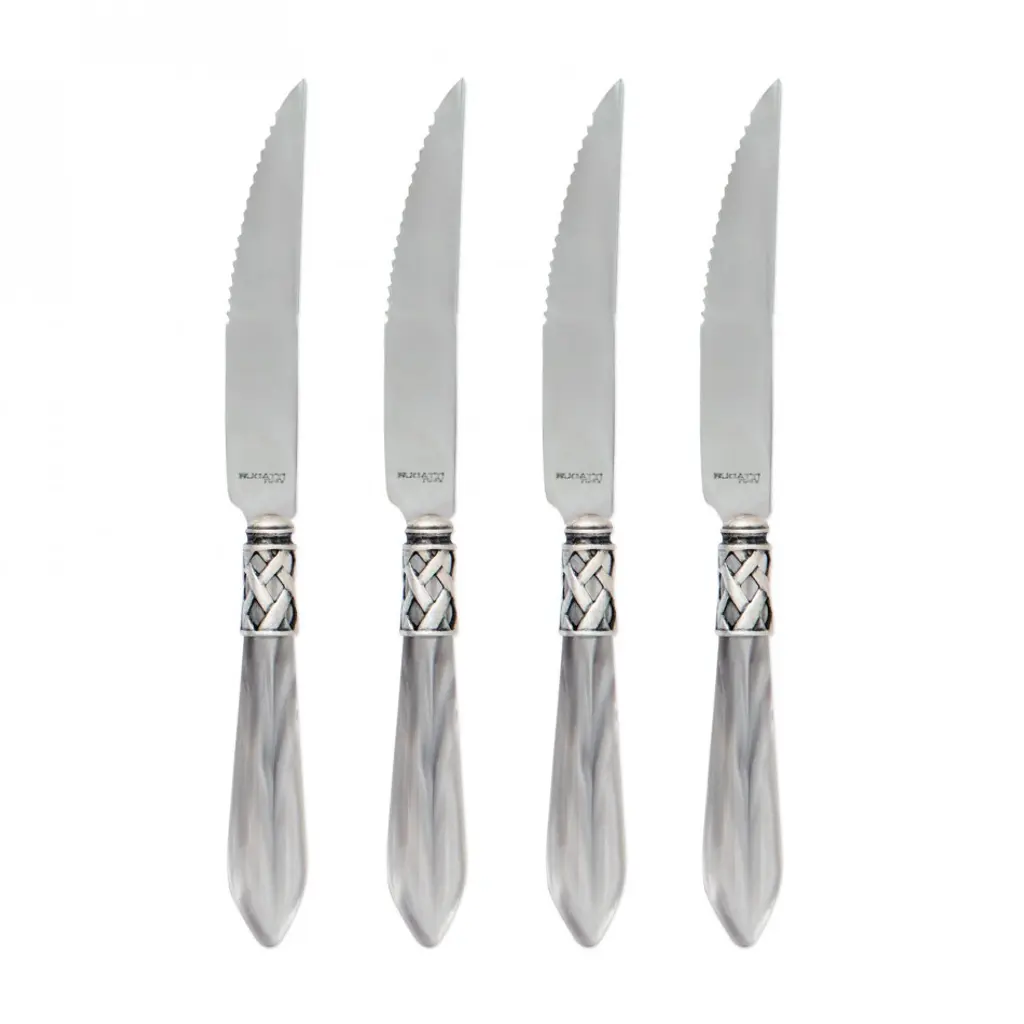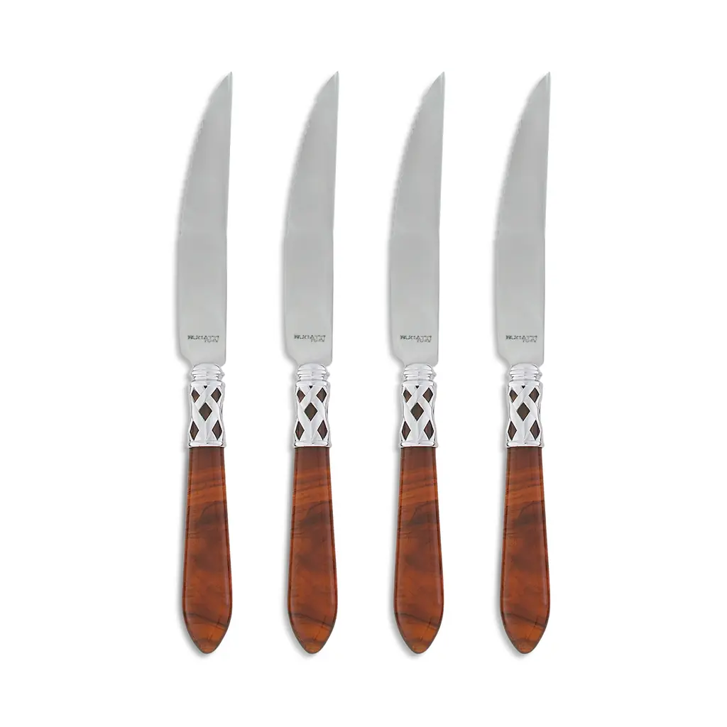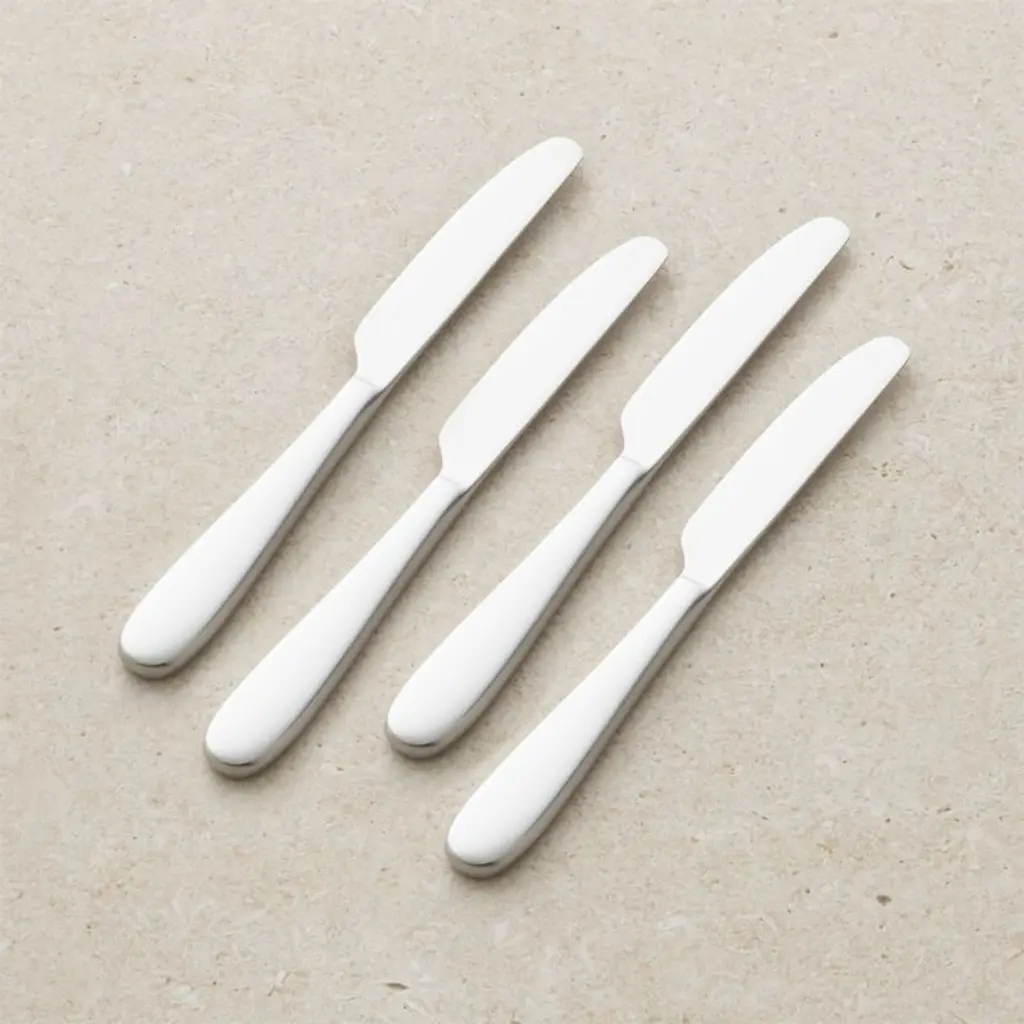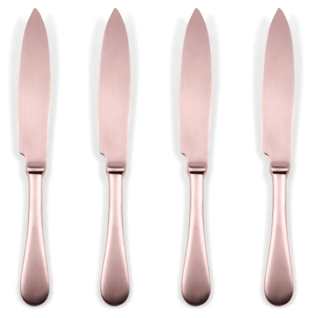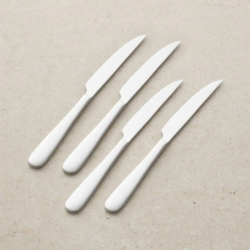 Clean, sophisticated design sets a fashionable table. Simple and striking, these polished steak knives are compatible with a wide variety of dinnerware. Well-balanced and comfortable in the hand, with a smooth, bright mirror finish.