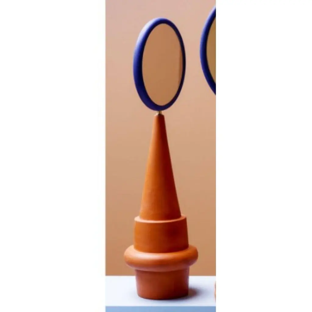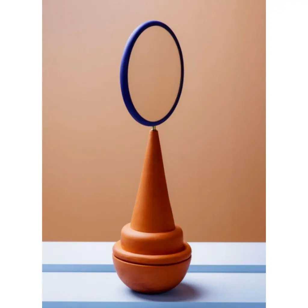 Marrakesh medium table mirror by Tero KuitunenMaterial: slip cast terracotta, Mdf, chalk paint, mirror, brass.Dimensions: D20 x H53 cmEdition of 8Also Available : different colours (Blue,Brown) and different dimensions.Inspired by the contrast of deep blue and terracotta of the Garden Majorelle in Marrakesh.The matt finish of the hand-made ceramic invites to feel the velvety surface, as you take a look through the turning mirror.Designer Tero Kuitunen, b. 1986, is inspired by the interface of design and art, the unprejudiced apposition of things, floating sceneries, and the meaning of humor and touch in design. Alongside product design, Tero is known for concept and space planning as well as memorable projects of contemporary art and design. He has graduated as a designer from the Applied Arts MA program at the Aalto University School of Art, Design and Architecture. Tero works as a product, concept and interior designer in projects for clients such as Supercell, Absolut Vodka, Hakola and many more. Currently Tero is working as a freelance designer with a vast experience in the design and art field. He has participated in international exhibitions and fairs in e.g. Beirut, Stockholm, Japan and Italy. 2019-2020 he curated and created the concept for Wild at Heart exhibition that toured to Vienna, Budapest, Stockholm, Tokyo and Helsinki. In 2021 Tero was invited to create together with Karoliina Hellberg and Raimo Saarinen a new exhibition at the prominent Amos Rex Museum. Tero has received a one-year working grant from the Finnish Cultural Foundation in 2017 and projects grands from Arts Promotion Centre Finland and City of Kotka.Throughout his work, Tero wants to find something that moves and touches people. Materials and colours are often his biggest inspiration when starting a new design project.