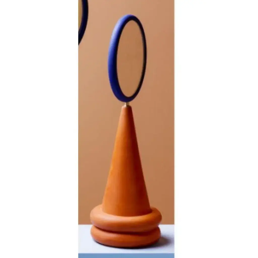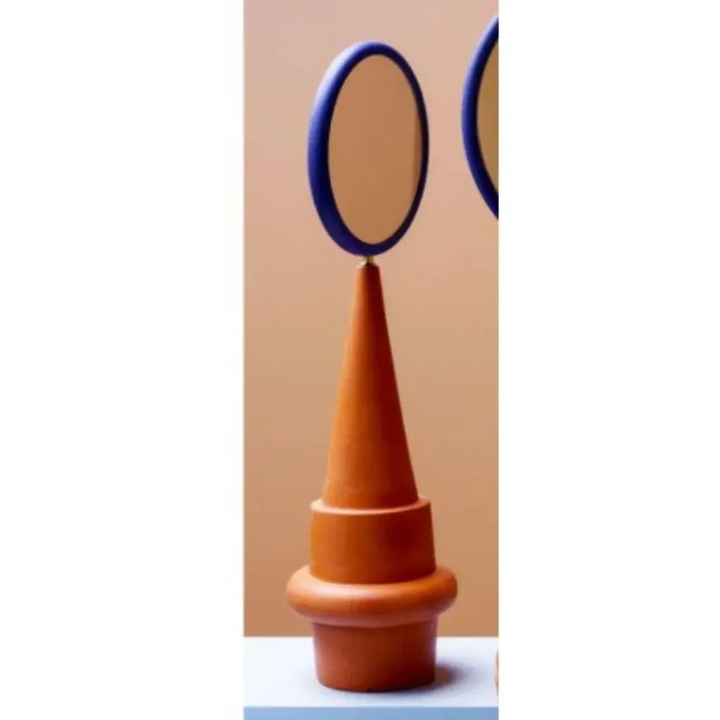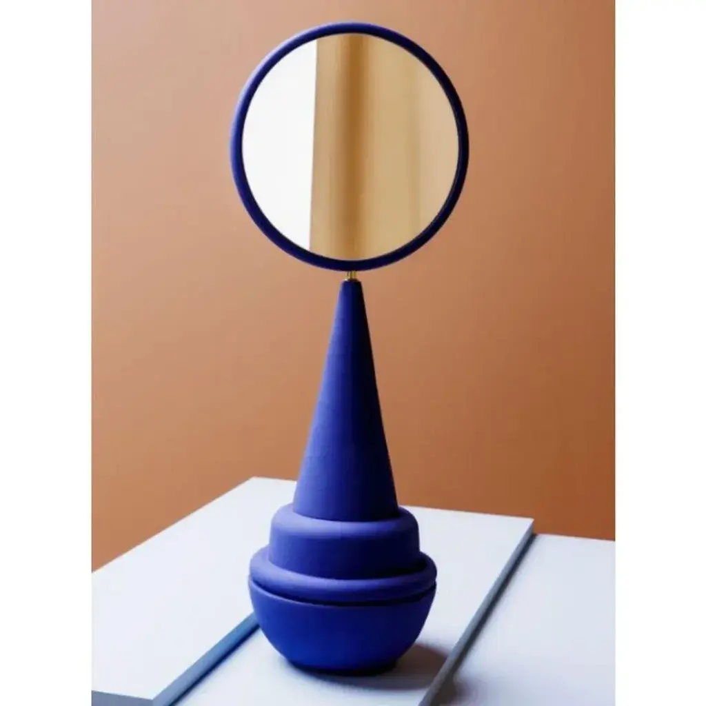 Marrakesh medium table mirror by Tero Kuitunen Material: slip cast terracotta, Mdf, chalk paint, mirror, brass. Dimensions: D20 x H53 cm Edition of 8 Also Available : different colours (Blue,Brown) and different dimensions. Inspired by the contrast of deep blue and terracotta of the Garden Majorelle in Marrakesh. The matt finish of the hand-made ceramic invites to feel the velvety surface, as you take a look through the turning mirror.