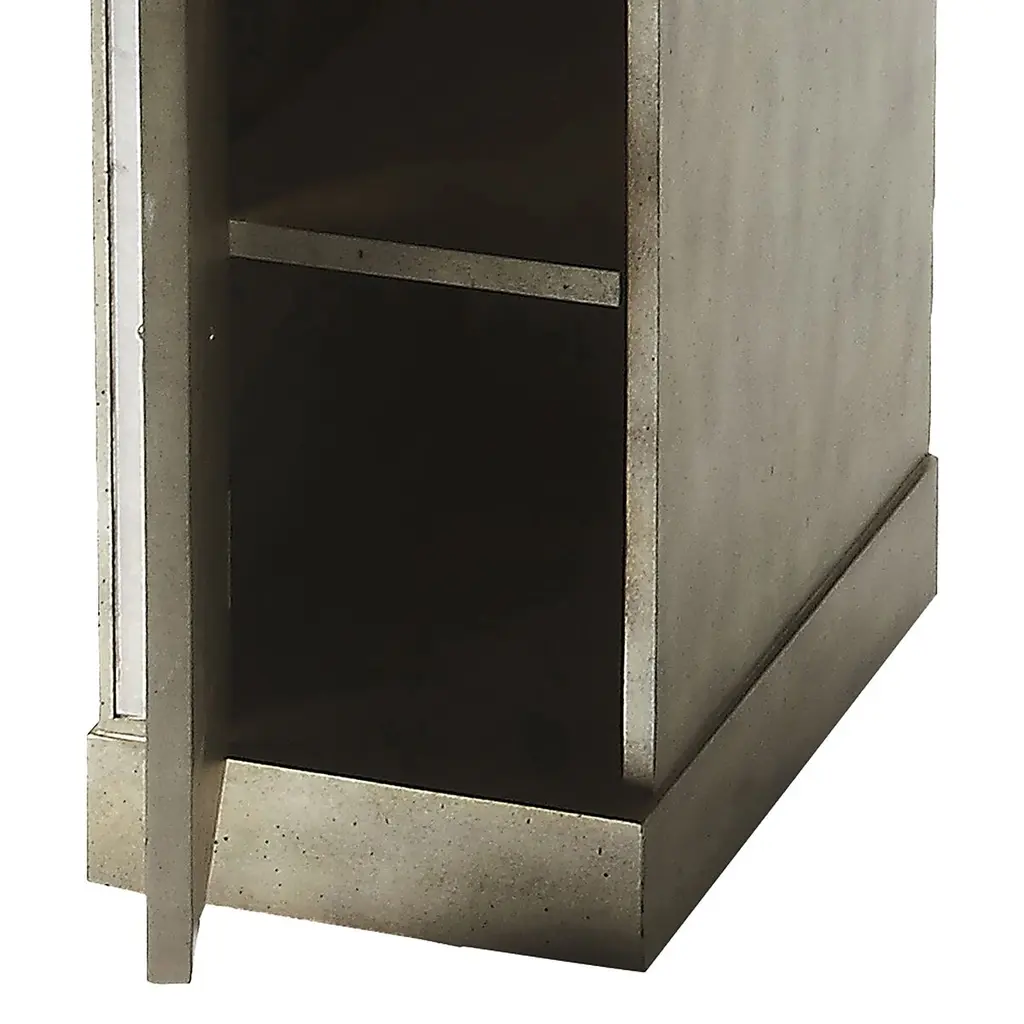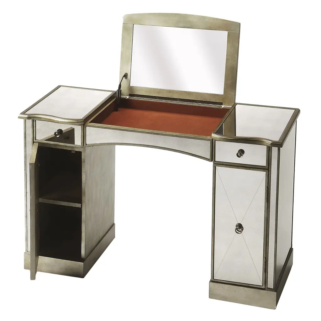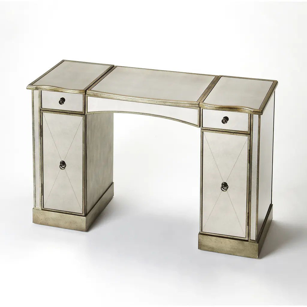 This glitzy vanity is a romantic blend of elegance and functionality, featuring an antiqued mirrored top, front, and sides that shimmer with timeless allure. The complementary pewter trim adds a touch of sophistication, making a bold style statement in any setting. With its abundant storage options, including adjustable shelves behind two doors, two drawers, and a storage compartment beneath the hinged center lid, this vanity is as practical as it is beautiful. The hardware, finished in sophisticated antique brass, completes the look with a classic touch. Let this enchanting piece transform your space into a haven of glamour and grace.