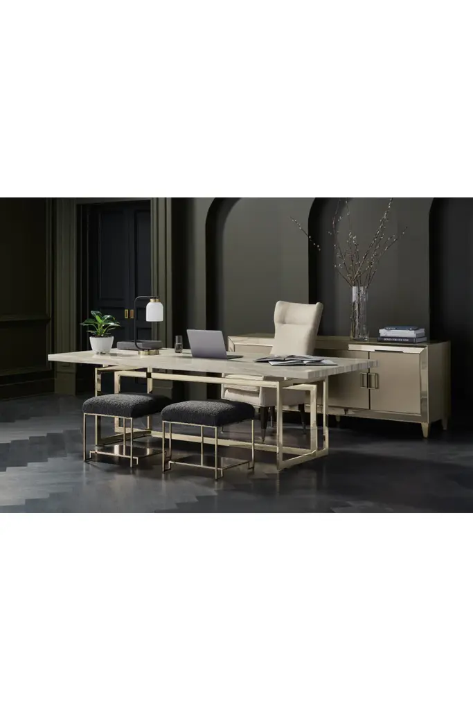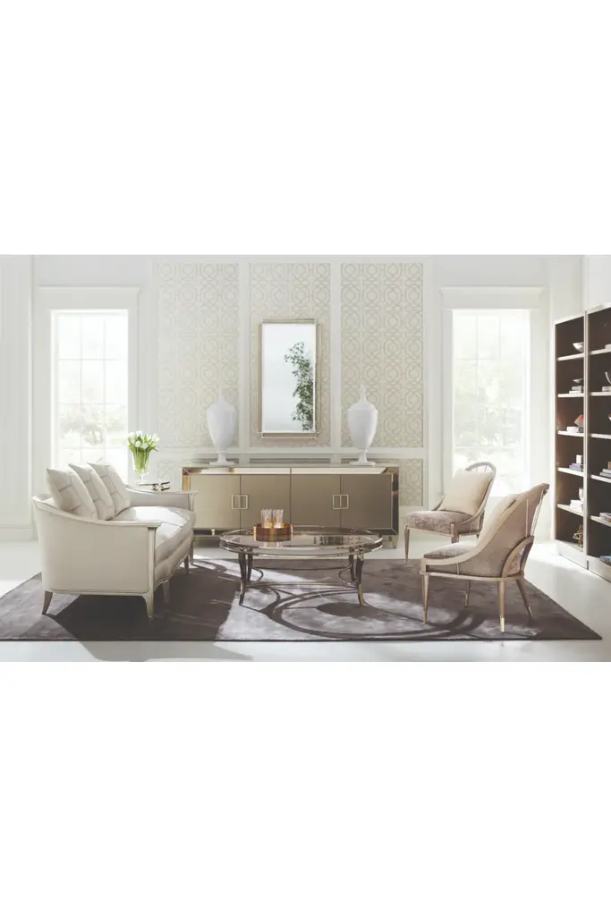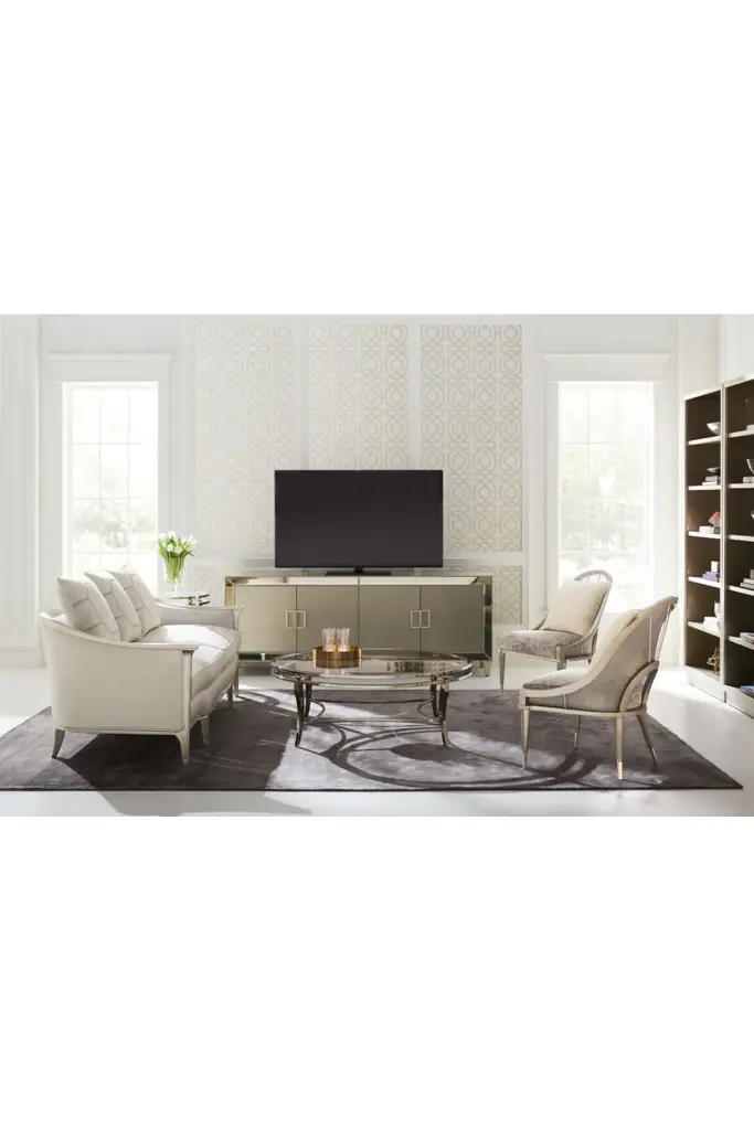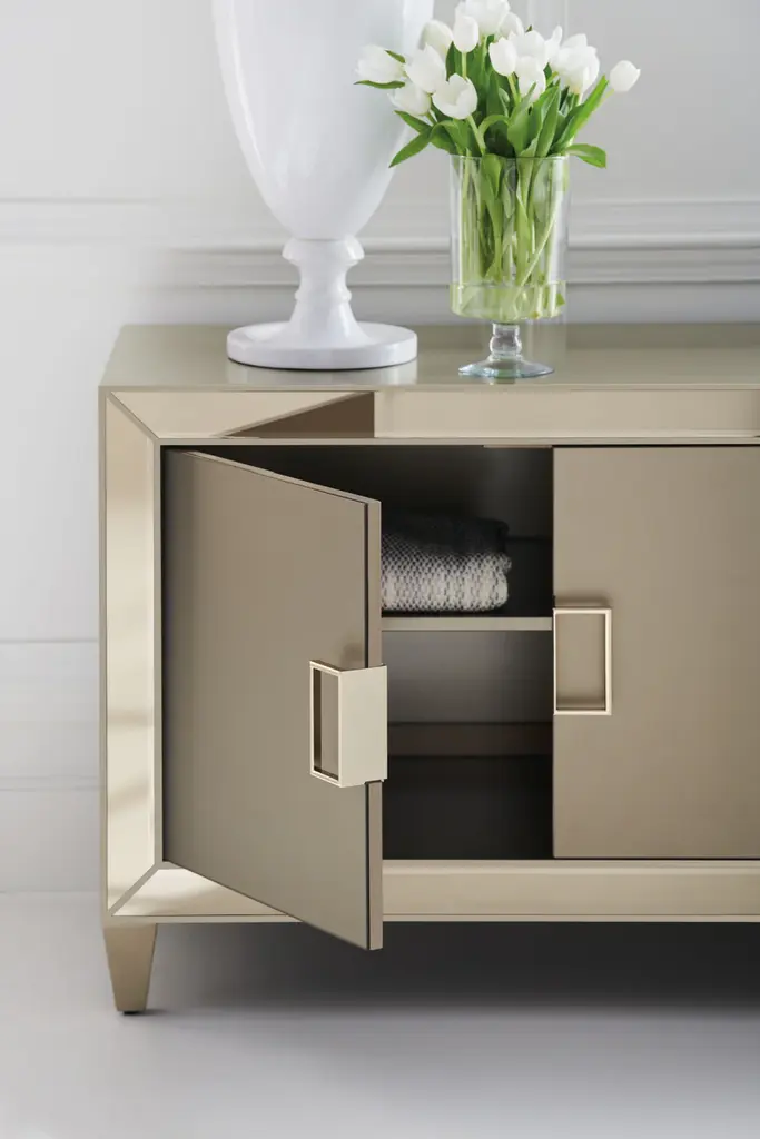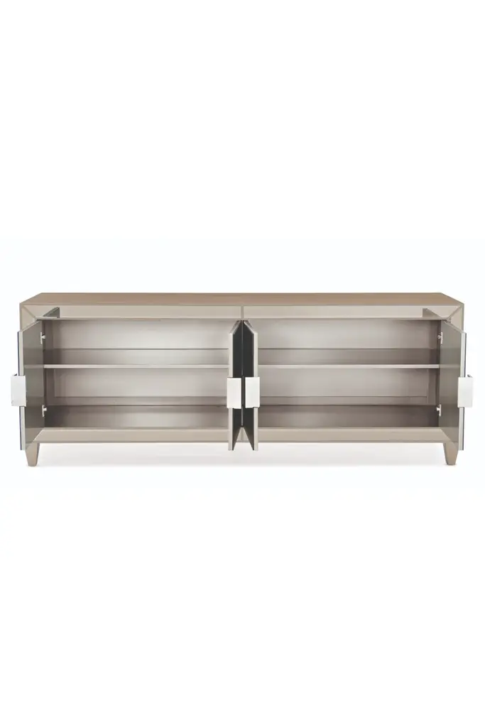 Styled to perfection, this glamorous console commands attention. Its clean silhouette features a rich mix of materials that captures the inherent opulence of gold, bronze, and mirrored finishes. The console is framed in a glistening mirrored border that stretches around its face while each of its four doors boasts a frosted Bronze mirrored panel punctuated by geometric hardware. Inside, you’ll find adjustable shelves and cord management holes designed to facilitate housing your media and components. Sophisticated yet modern in its outlook, this versatile piece is charismatic enough to build a room around.