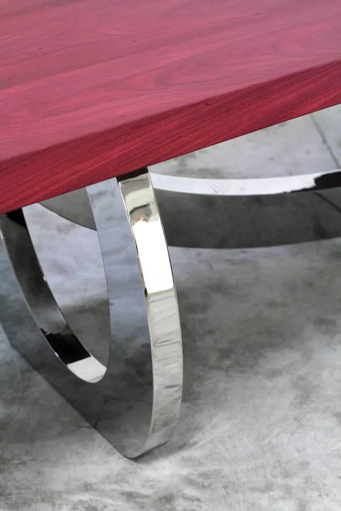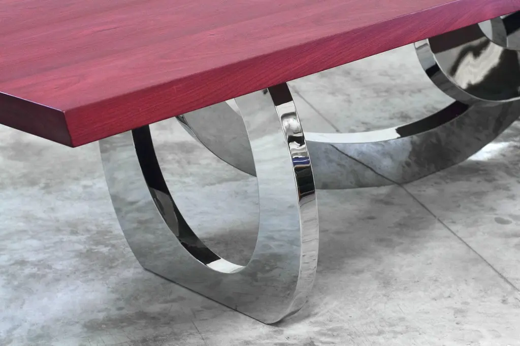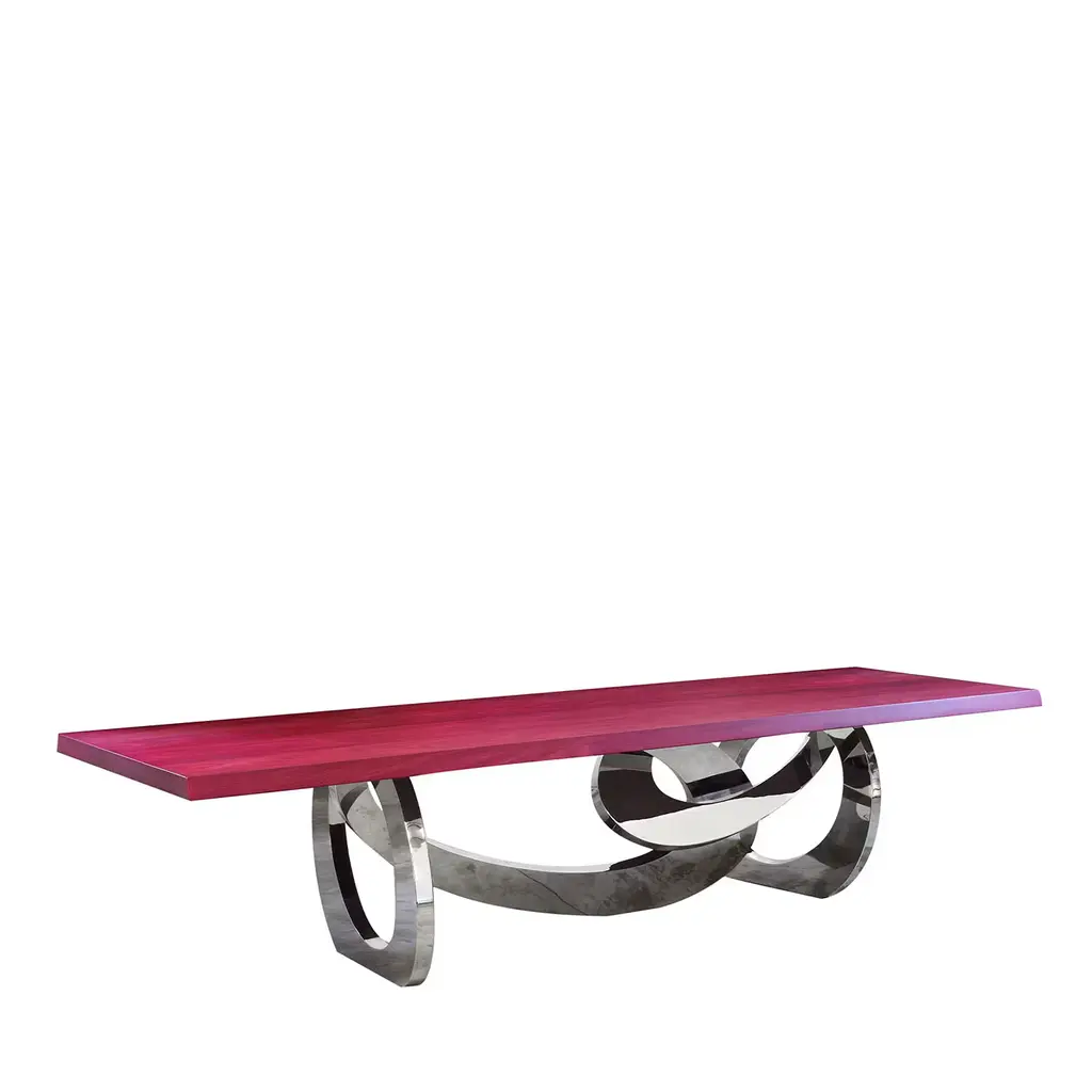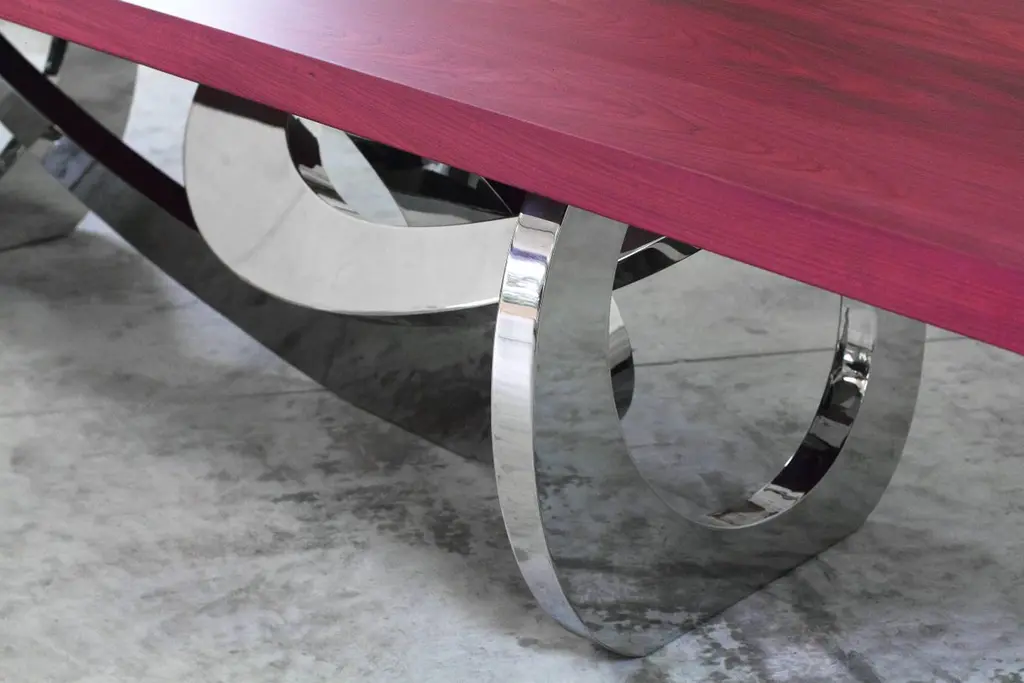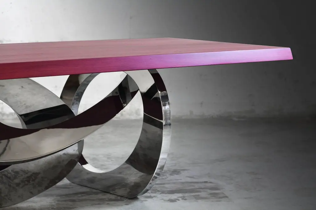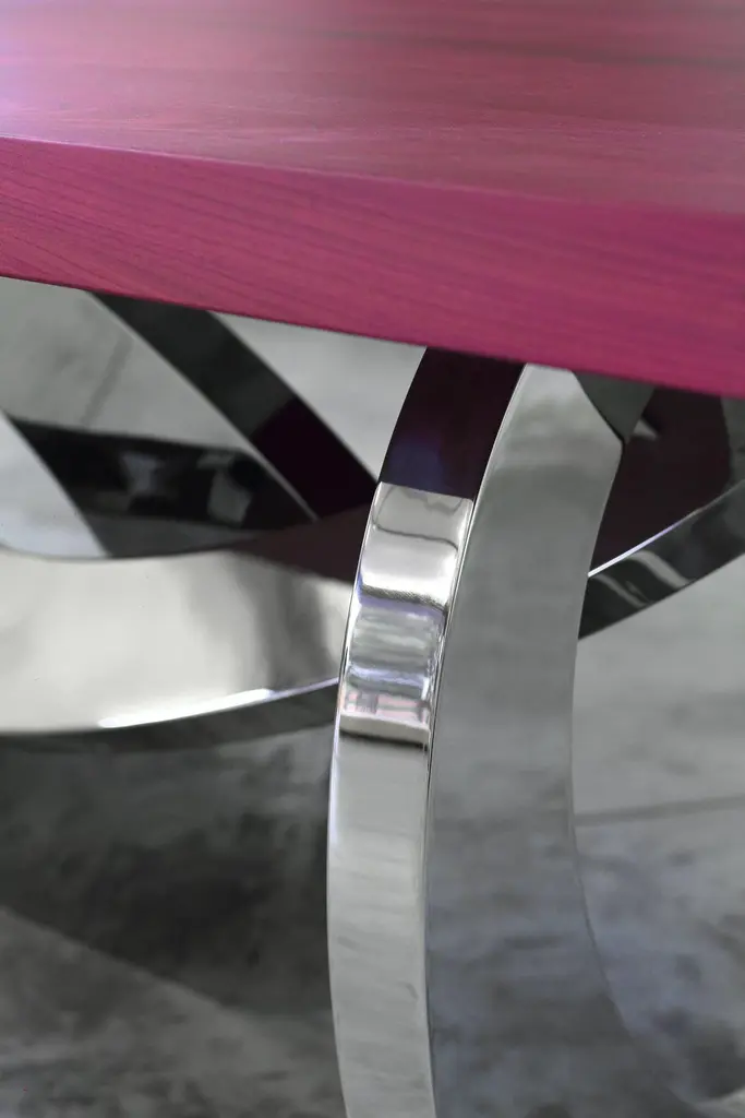 Modern Dining Table Mirror Steel Rings Base Solid Wood Magenta Top Made In Italy