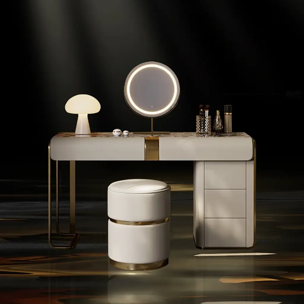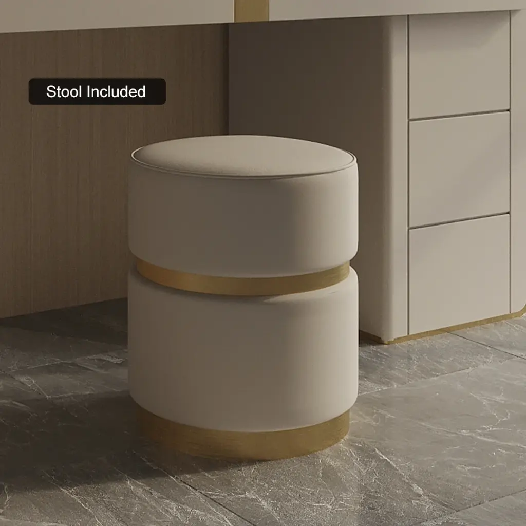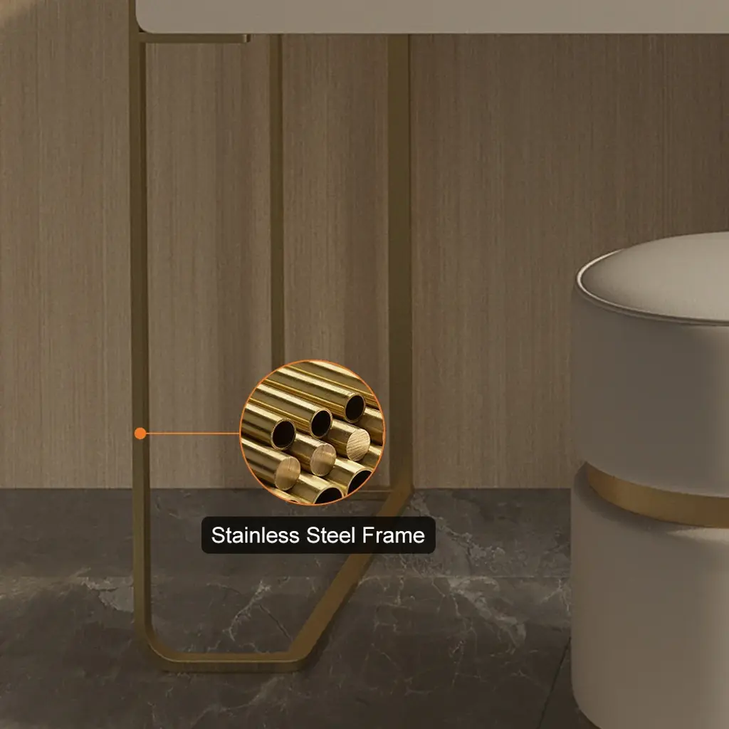 Indulge in the opulent luxury of our makeup vanity set, exquisitely crafted with stunning PU leather upholstery that exudes a sense of refined elegance. The sumptuous texture of the leather adds a touch of sophistication to the set, while its durable and easy-to-clean properties ensure that it retains its pristine appearance for years to come. Enhancing the luxurious look of the vanity set is the lustrous gold finish that adorns the legs and handles. The gold accents perfectly complement the rich brown hue of the PU leather upholstery, creating a harmonious and cohesive look that adds a touch of glamour to your space. With its impeccable attention to detail and unparalleled quality, this makeup vanity set is a masterpiece that will effortlessly transform any room into a luxurious oasis. Whether you're getting ready for a night out or simply pampering yourself, this vanity set will make you feel like a true queen. Experience the ultimate in luxury and style with our makeup vanity set, and indulge in a truly unforgettable beauty experience that will leave you feeling like royalty.