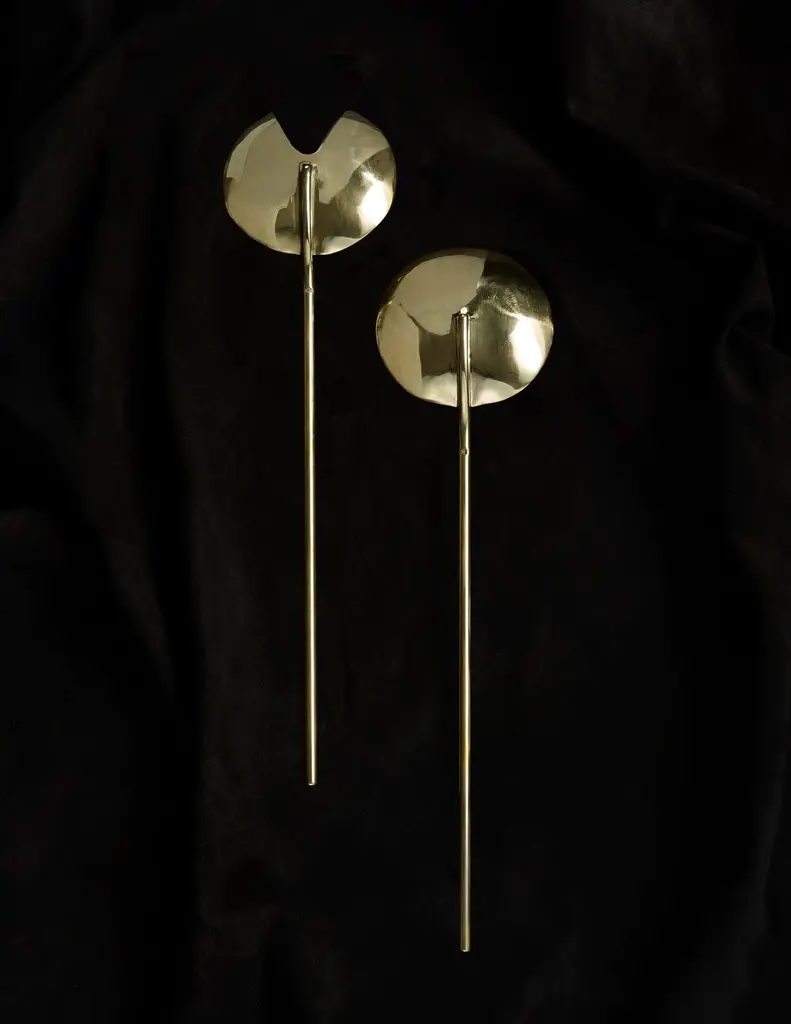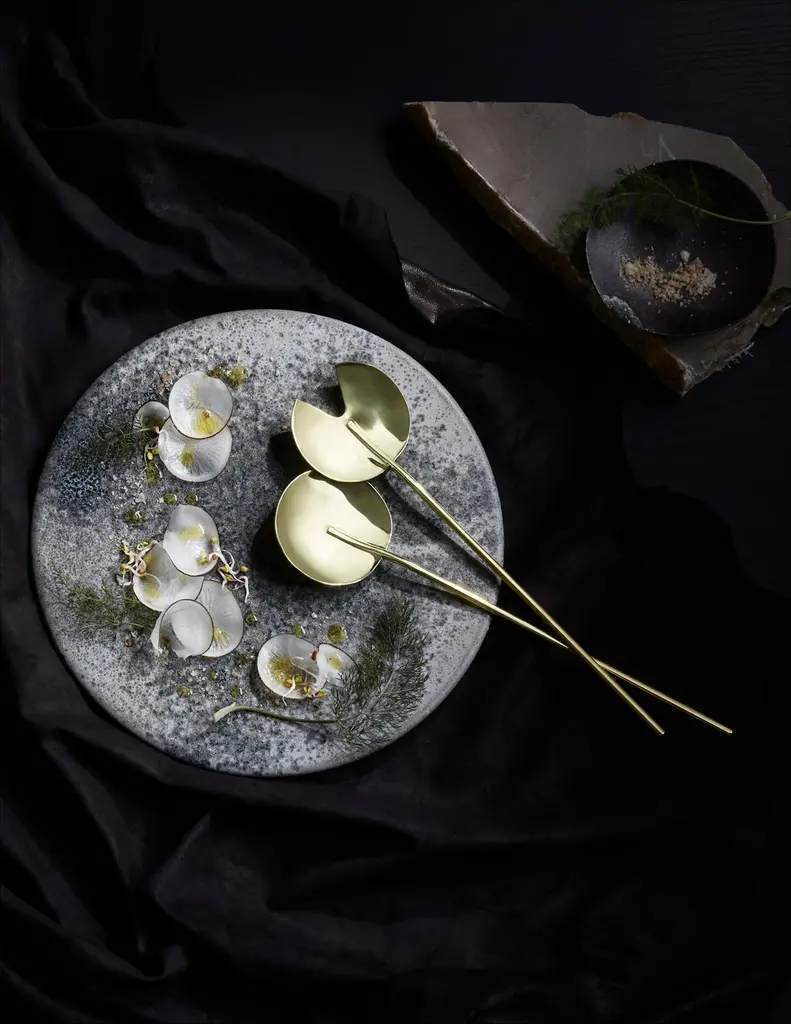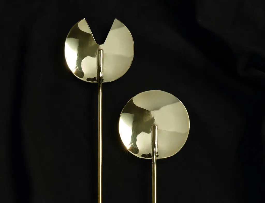 Handcrafted in Brooklyn by Heath Wagoner of HW. Studio, these modern high-polish brass salad servers are a stunning addition to any table setting. With a sleek and contemporary design, these salad servers are perfect for both casual and formal occasions.Each set of salad servers is carefully handmade by Heath Wagoner using traditional metalworking techniques. The brass is polished to a high shine, creating a luxurious and elegant look that is sure to impress your guests. These salad servers are not only beautiful but also functional, with an ergonomic design that makes them easy to use.Whether you're hosting a dinner party or simply enjoying a middle-of-the-week salad, these handmade brass salad servers are sure to elevate your dining experience. They are a testament to the skill and craftsmanship of Heath Wagoner, and are sure to become treasured heirlooms for years to come.HW. Studio's work is meant to re-invigorate modern dining while employing jewelry techniques and craft to create objects that are jewelry for dining and for the table.