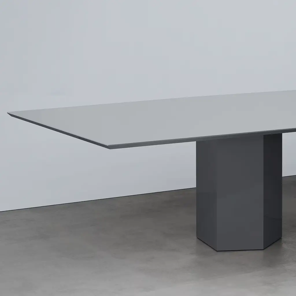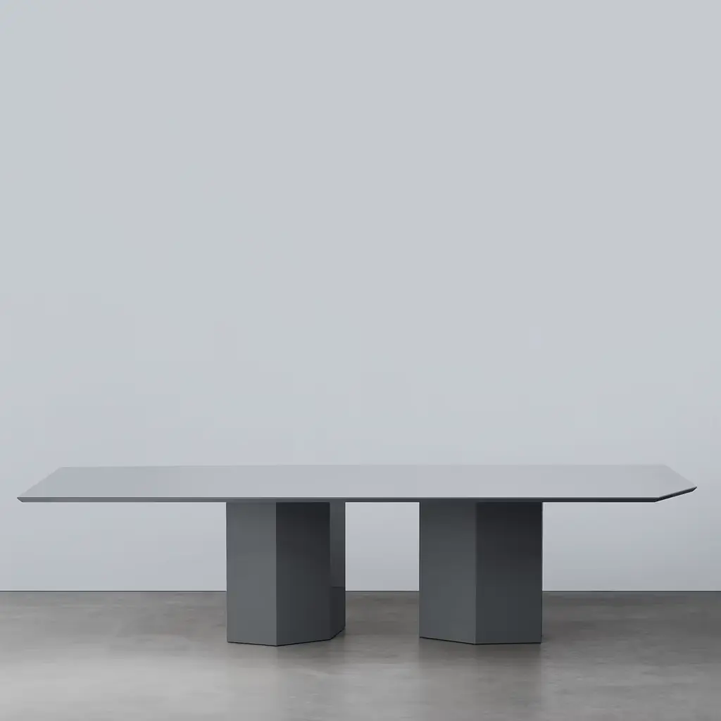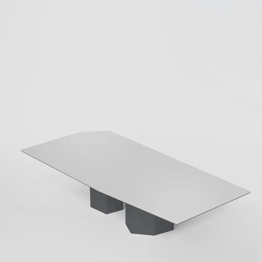 The Monith 280 Dining Table by Artefatto Design Studio is a centerpiece that embraces imperfection with its asymmetrical legs and uniquely shaped top. Finished in Glossy Blue Cenere lacquer, it features an Extra Clear Mirror top that adds depth and intrigue. Its distinctive design tells a story of past experiences and new beginnings, making it a captivating addition to any dining space.