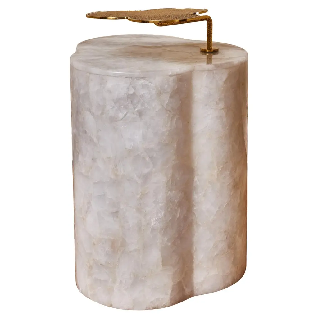 "A reflective surface becomes a gateway to another planet: vanity finding a new dimension. Naia is an artwork with a double function: its mirror is attached to a unique veined marble circle, like the surface of an alien world, while the semi-circular frame is the orbit around which a new concept of beauty revolves." Table mirror with brass structure: polished base and brushed curvature. Rotating plate in polished Honey Onyx with a supermirror steel surface. Variation Details: Table mirror with brass structure: polished base and brushed curvature. Rotating plate in selected polished marbles with a supermirror steel surface.