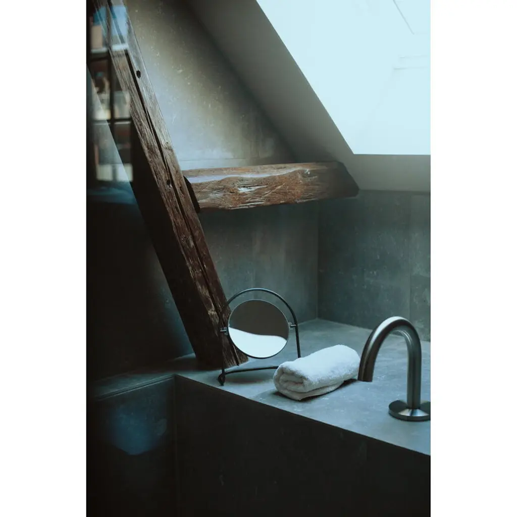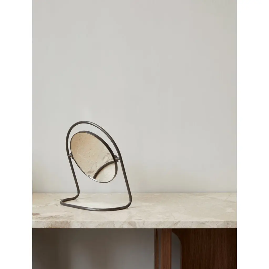 Audo Copenhagen’s Nimbus table mirror, designed by Krøyer-Sætter-Lassen, was created based on the Danish design duo’s idea of a framed mirror whose frame would not distract from the mirror itself. The simple and beautiful Nimbus is surrounded by a delicate, halo-like brass frame attached to the sleek base with hinges. The mirror’s name, Nimbus, was inspired by Greek mythology: the word nimbus referred to the glowing halo or corona surrounding deities. Loving the form but looking for function? Nimbus has both: it has a regular mirror on one side and a magnifying mirror on the other, so you needn't squint when shaving or applying makeup.