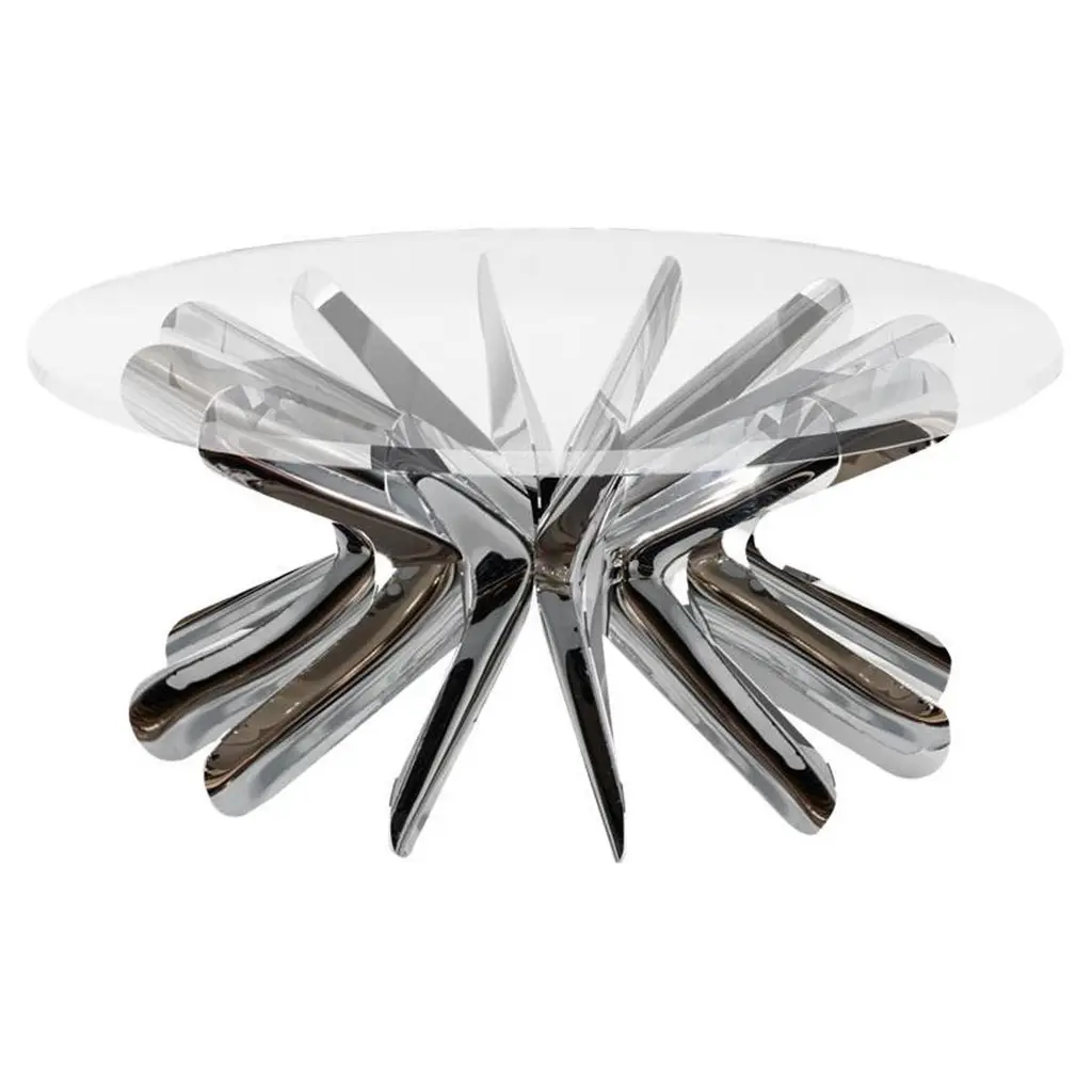 Take a wooden frame, cover it in aluminium and then work its surface, “scrunch” it by hand to achieve a crimpled profile. This is the process at the core of Tab.ulino and Tab.ulone, as well as all the Tab.u collection, stools and tables with absolutely distinctive lines.Tab.ulino and Tab.ulone, are wheel-shaped tables embellished by mirror-effect crystal tops that amplify the shine coming from the frame, chrome or gold according the to desired finish. They feel at ease in the most contemporary spaces but can provide a touch of refinedness to more conventional environments.The family is complete with the addition of Tab.u stool, Tab.u mirror and the Tab.u Luce pendant lamp.