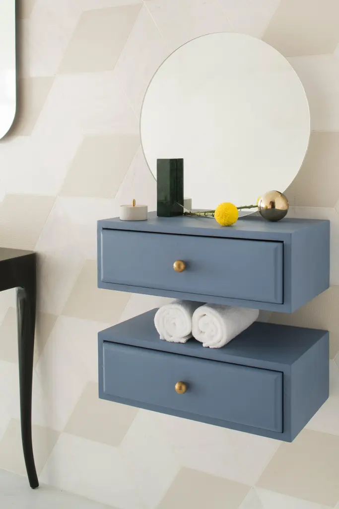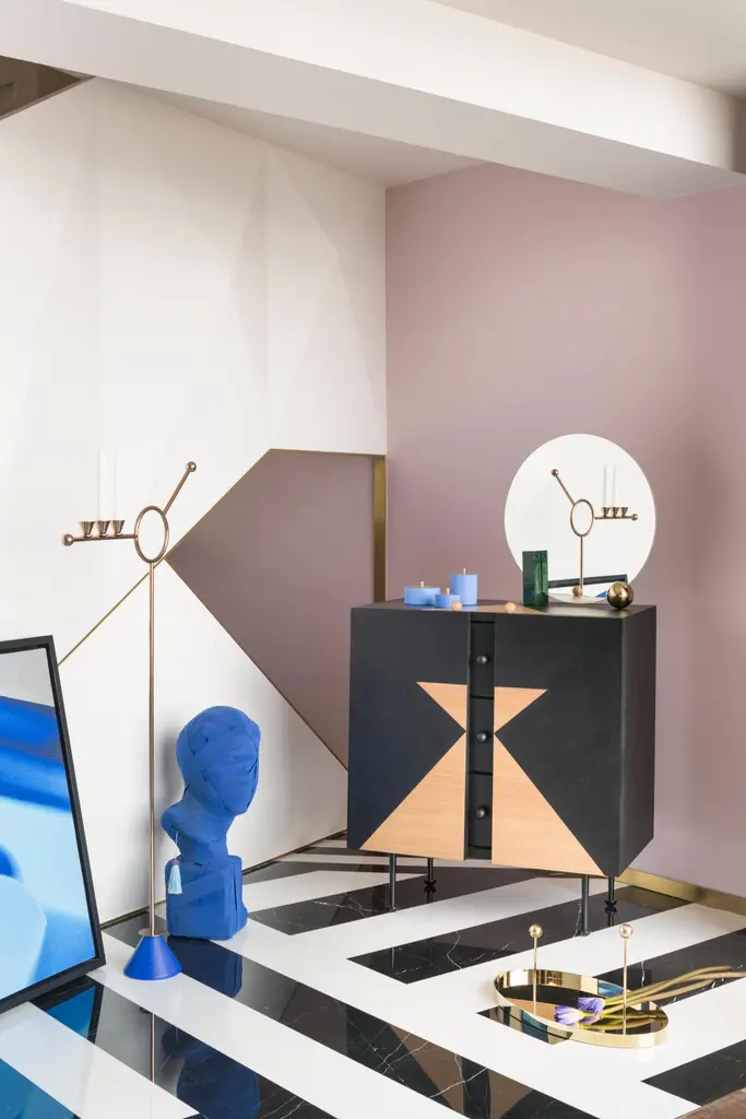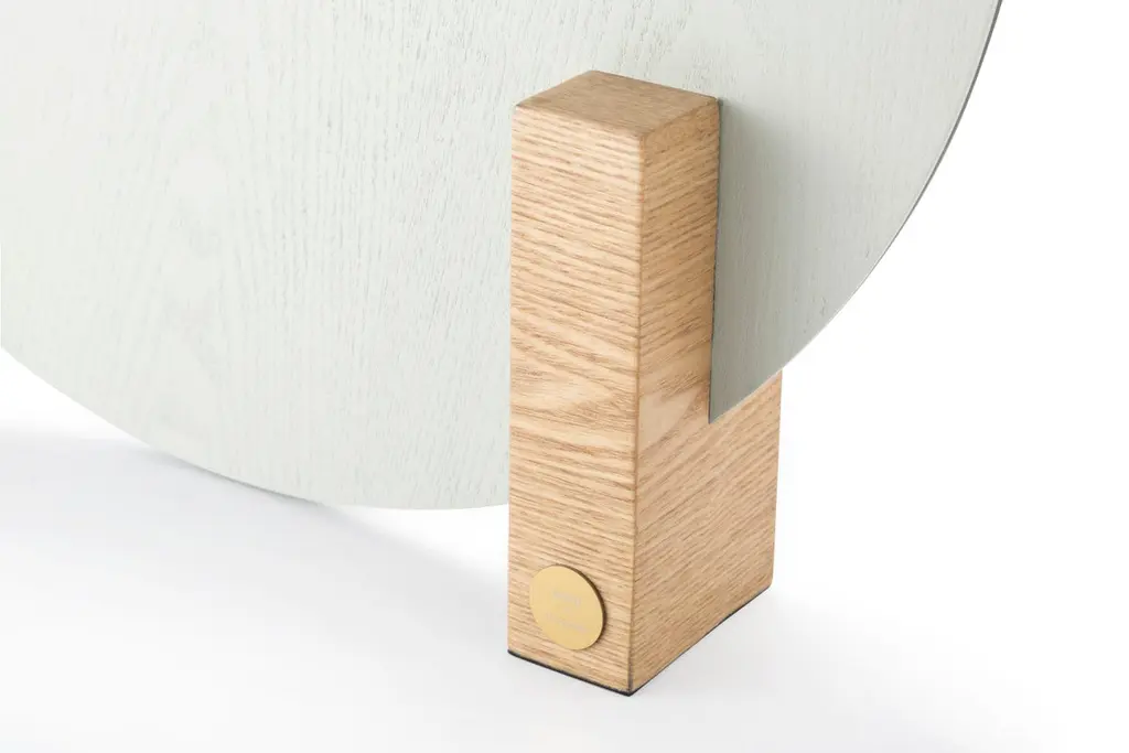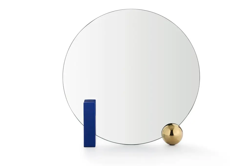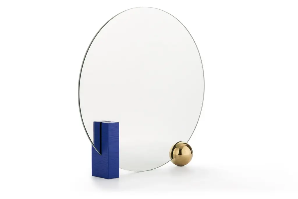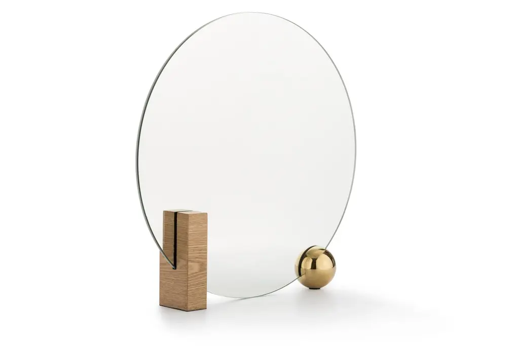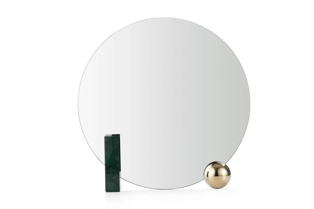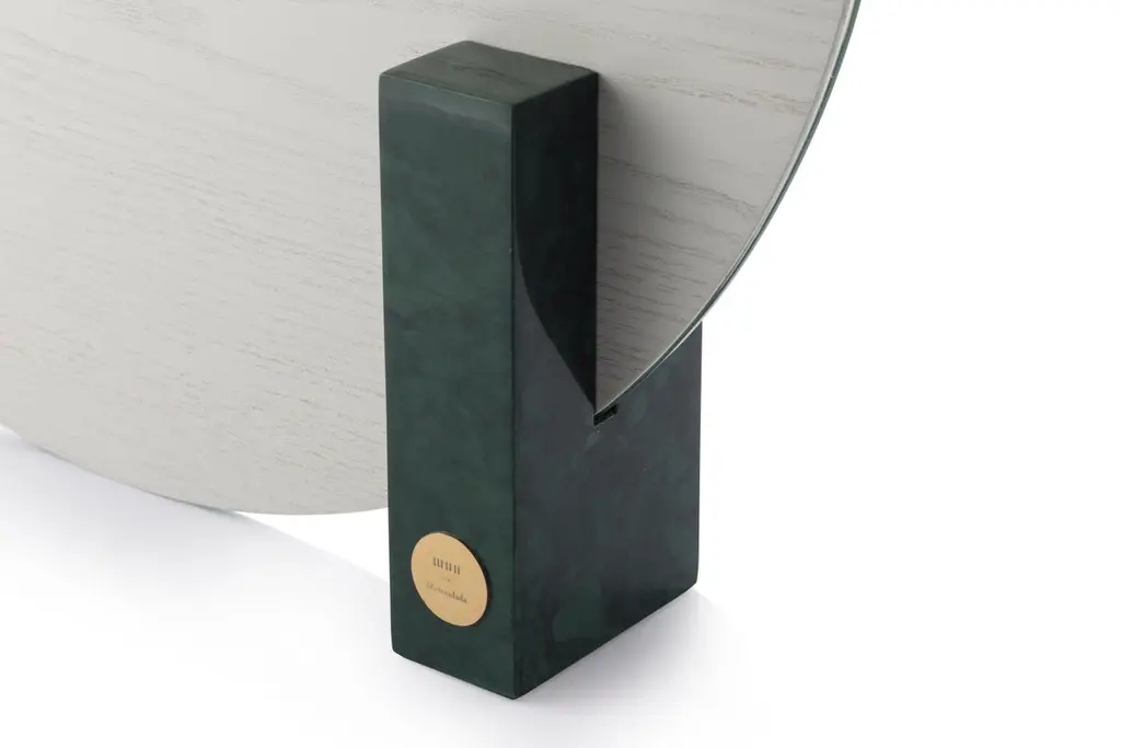 Design by WUUMeasures: Table mirror W 50, D 9, H 50 cmRectangular block in ash veneer painted metal or green marbleRound ball-plated metal coated with glossy gold finishBack mirror in colored-stained ash veneer, celadon colorClear mirrorThe name of this piece has been chosen as a nod to Oscar Wilde’s most famous character. Looking for Dorian is shaped by a central round mirror that is supported on one side by a glistening rectangular wood-looking block and on the other one by a round glossy metal ball. Three elements, three basic geometric shapes, three reflective surfaces that bring structure, strength and limpidity to the piece. With dainty lines and a subtle color combination of celadon and gold, the mirror is yet also softly infused with romanticism. Sophisticated, eccentric, poetic, looking for Dorian is a real Dandy.