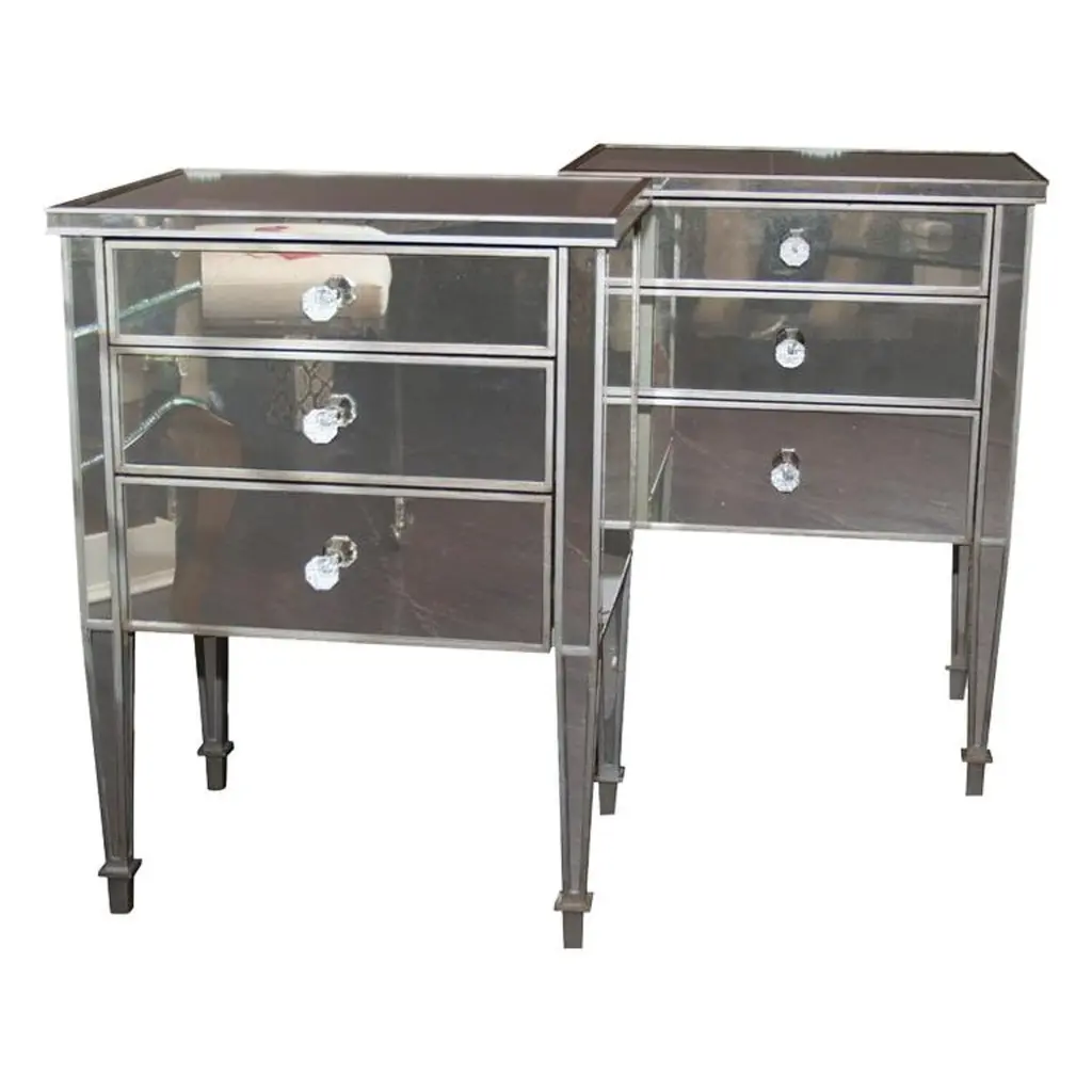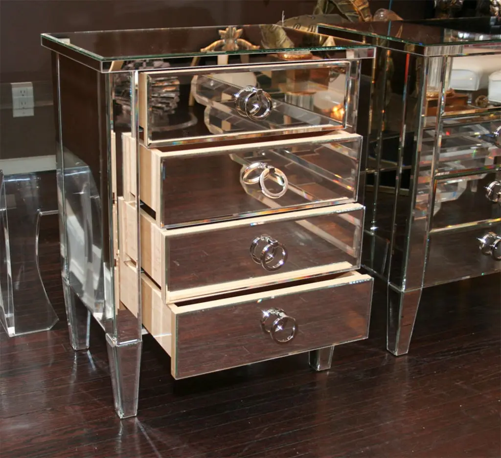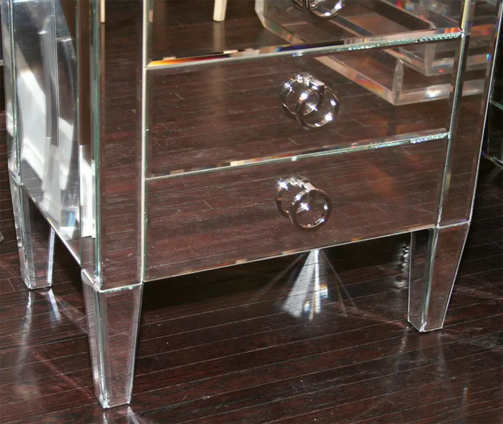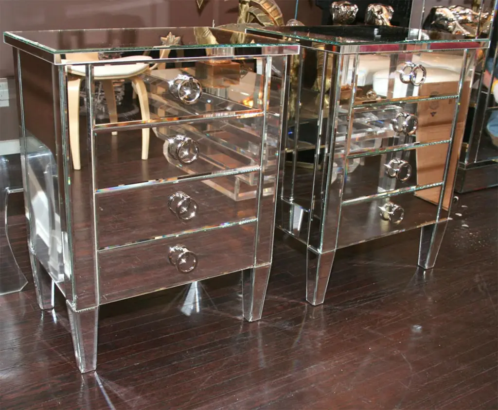 Pair of custom 4-drawer mirrored end tables. Customization is available in different sizes, finishes and hardware.