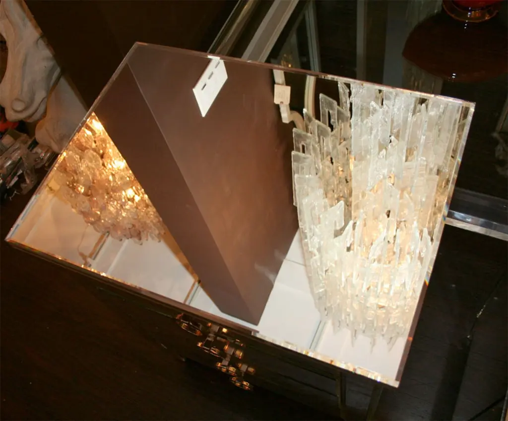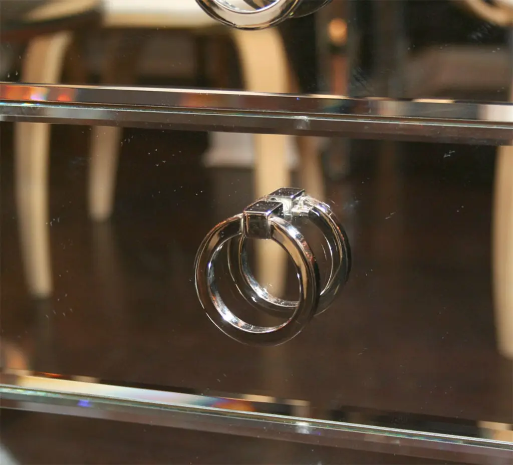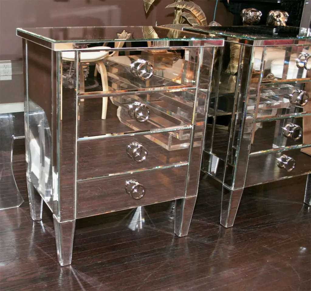 Pair of custom 4-drawer mirrored end tables. Customization is available in different sizes, finishes and hardware.