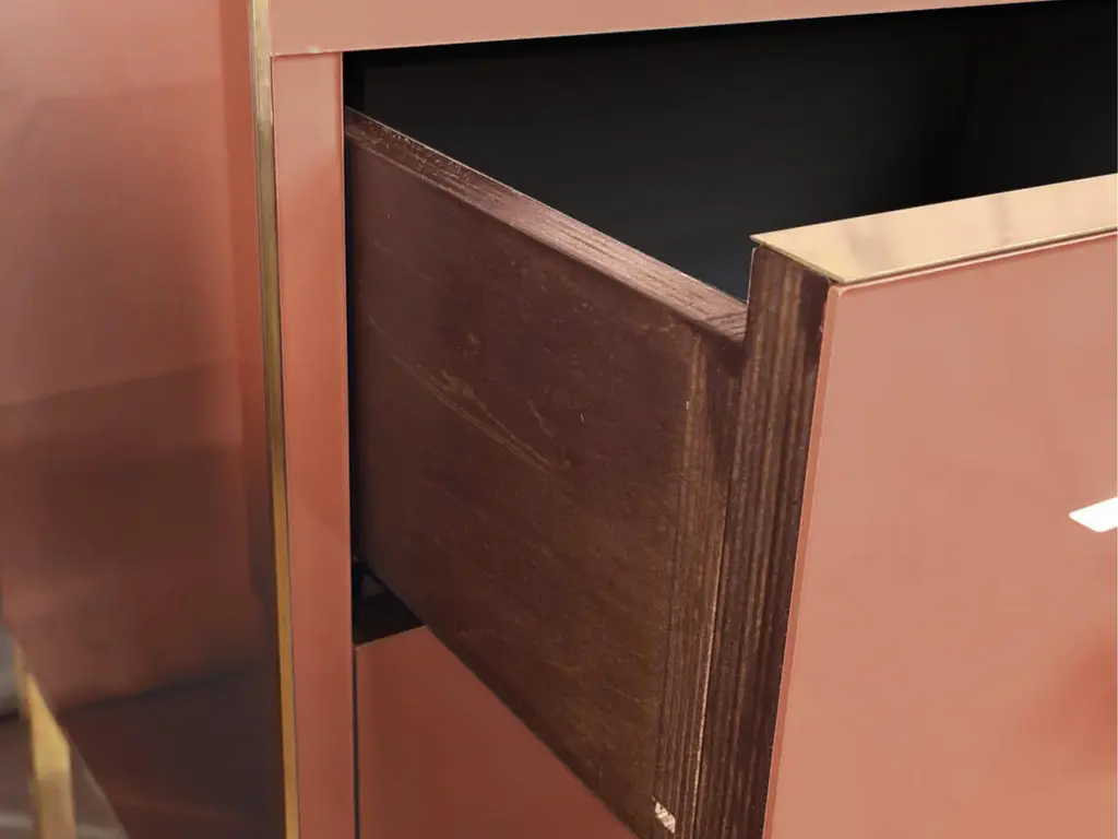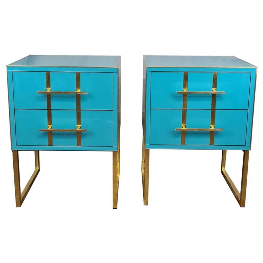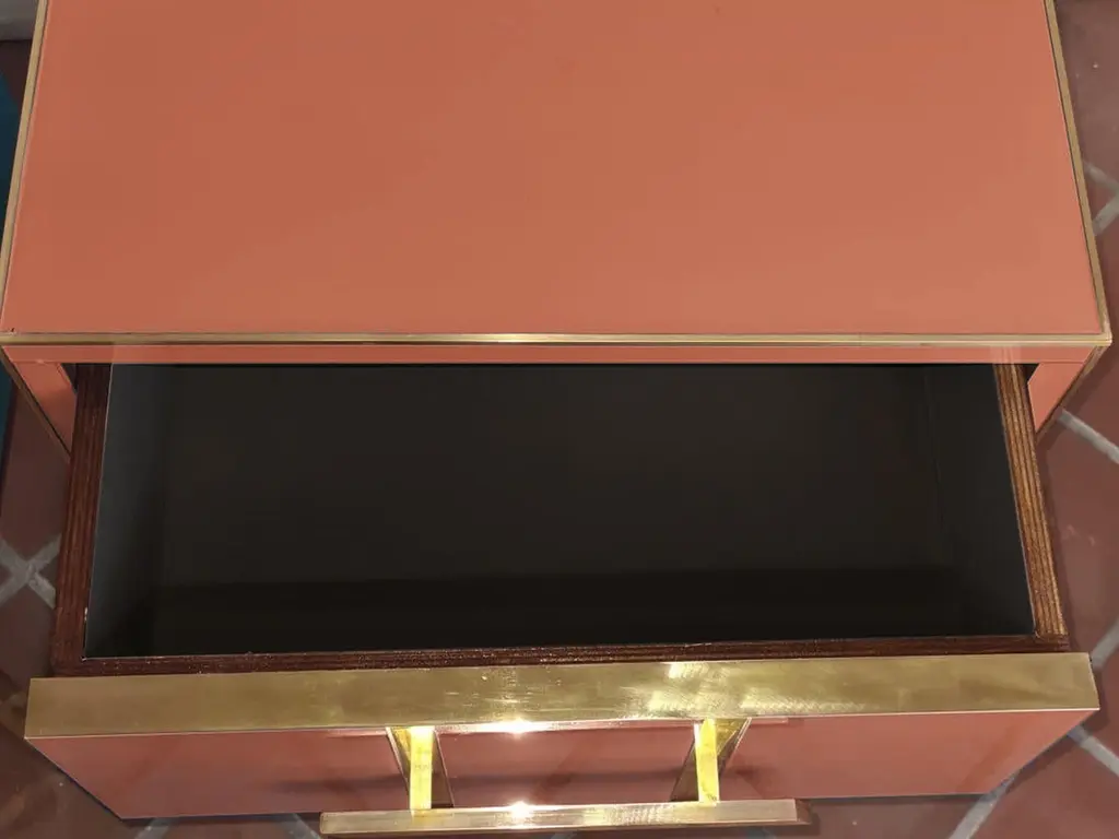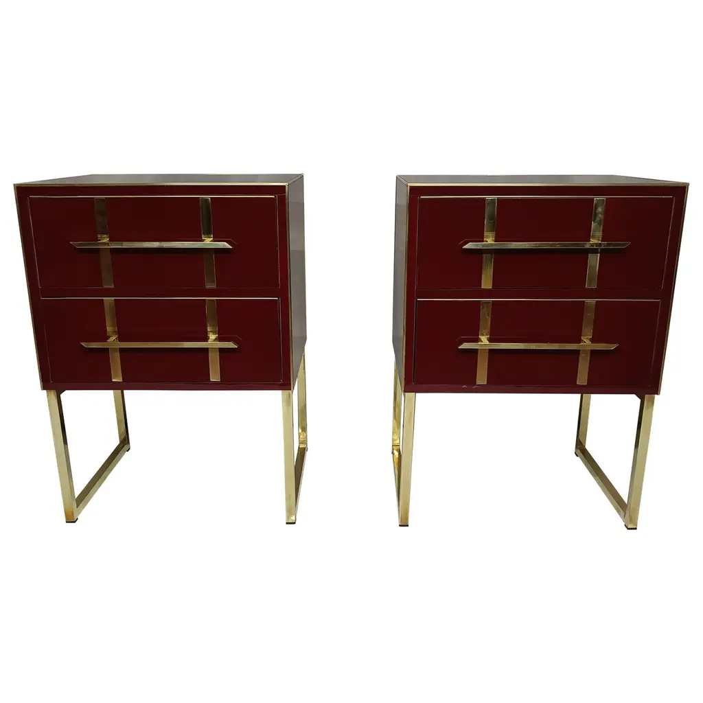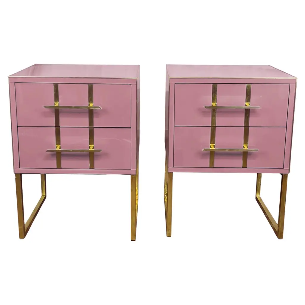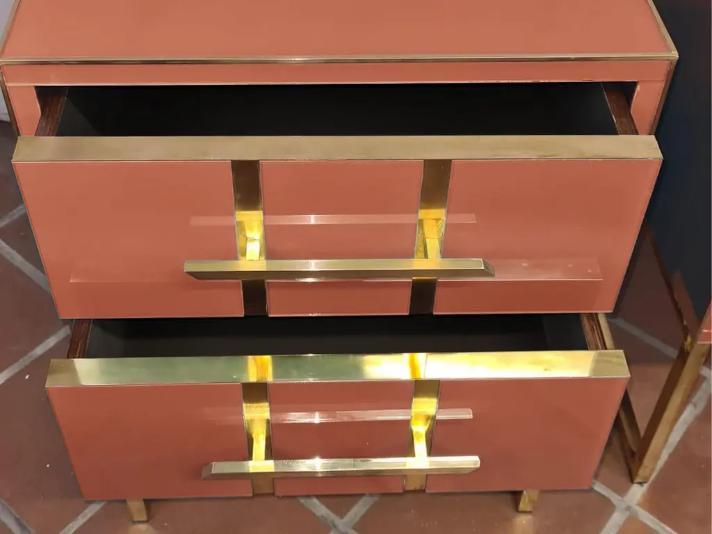 This pair of Birch side tables elegantly captures the essence of 1950s style with a modern twist. Made of solid birch and embellished with red beige mirrored glass, these side tables feature refined vertical brass inserts along the drawers, enhancing their luxurious appearance. Handcrafted details, including precision-cut brass handles, not only ensure functionality but also add a touch of sophistication to any bedroom decor.Brass feet provide stability and create a cohesive look with brass accents on the drawers. Ideal for those looking to enrich their space, these nightstands blend sophisticated aesthetics and practicality, making them a perfect addition to a mid-century modern decor.