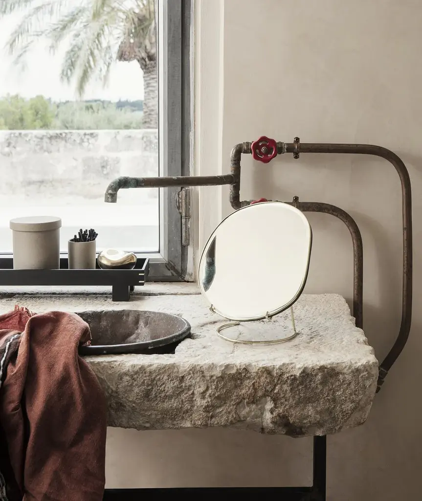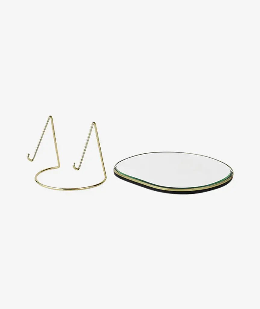 Set on a slender, detachable metal stand, the shape-shifting Pond mirror is cut in an asymmetrical silhouette for an intriguing take on a classic design. Inspired by free-flowing movements of water, the organically-shaped mirror is made to sit on any surface – from a bedroom dressing table or hallway console to a bathroom shelf – it is an elegant way to reflect your daily routine.