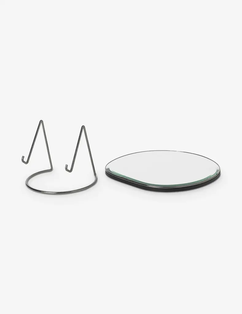 The Pond mirror's organic silhouette is encased in a slim metal frame and stand, offering a hint of dimension and contrast in any setting. This striking tableteop mirror is a stunning piece that adds artistry to any tabletop. Perfect for a dresser or for quick look-checks at your home workspace.