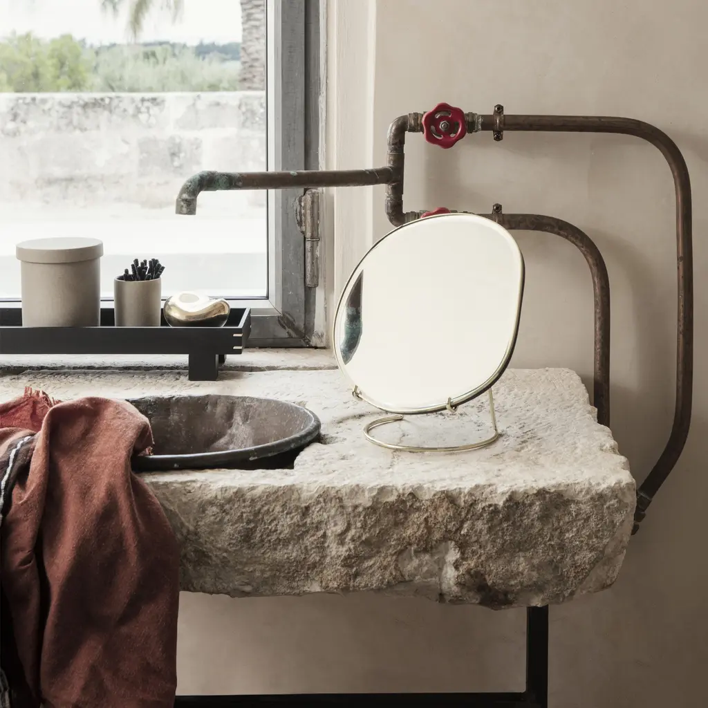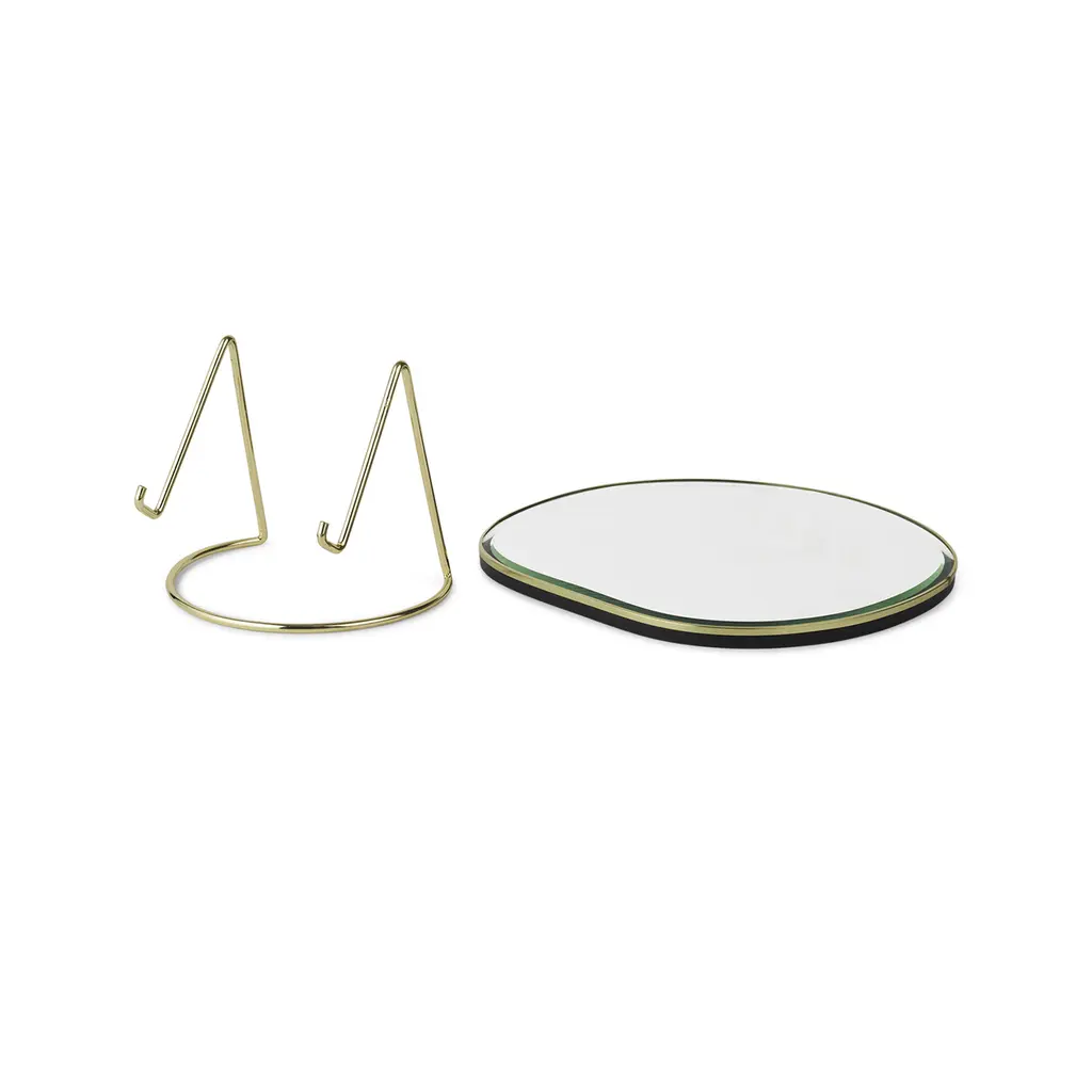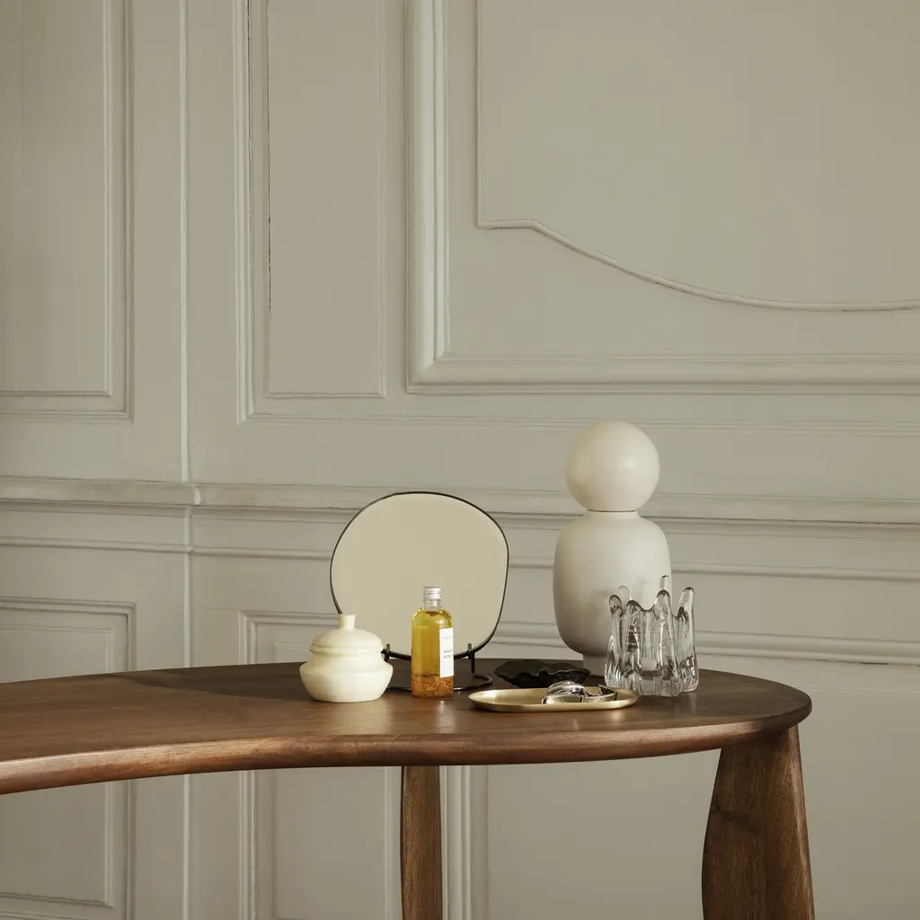 The Ferm Living Pond mirror features a slender, detachable metal stand, offering a unique and flexible design. Cut into an asymmetrical silhouette, this mirror presents a fresh twist on traditional forms, drawing inspiration from the fluid movements of water. Its organically-shaped profile allows it to adapt beautifully to various settings, whether placed on a bedroom dressing table, a hallway console, or a bathroom shelf. This versatile mirror not only serves as a functional piece for reflecting your daily routine but also adds an elegant touch to any space.