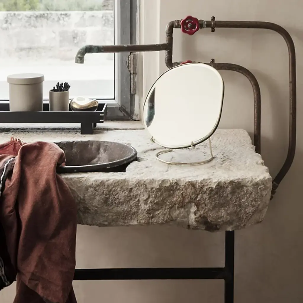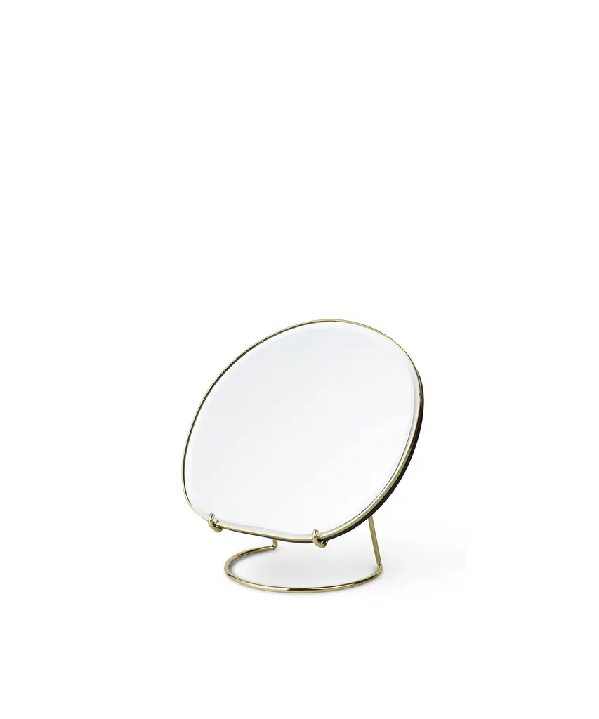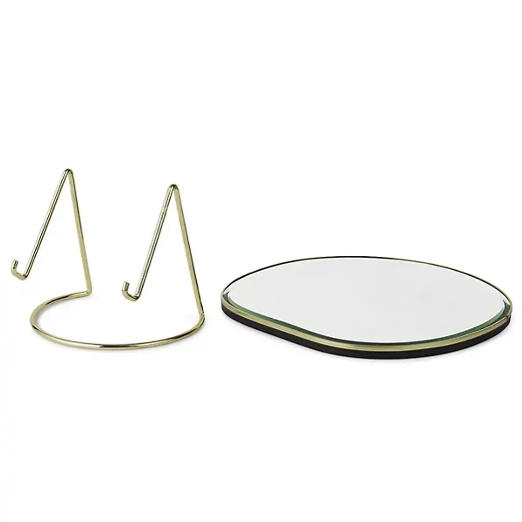 The Pond Table Mirror from Ferm Living shows how everyday objects can incorporate natural forms while maintaining their basic purpose. The asymmetrical shape sits on a removable metal stand, allowing for various positioning options. MDF backing supports the mirror glass, while a brass-plated zinc frame provides clean edges. The design adapts to different settings—from dressing tables to bathroom counters. The detachable stand allows for different display options or easy storage.