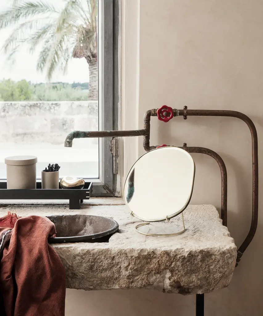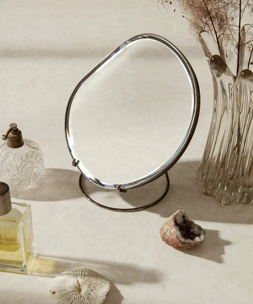 Set on a slender, detachable metal stand, our shape-shifting Pond mirror is cut in an asymmetrical silhouette for an intriguing take on a classic design. Inspired by free-flowing movements of water, the organically-shaped mirror is made to sit on any surface – from a bedroom dressing table or hallway console to a bathroom shelf – it is an elegant way to reflect your daily routine. Designed and produced by the Copenhagen-based studio Ferm Living.