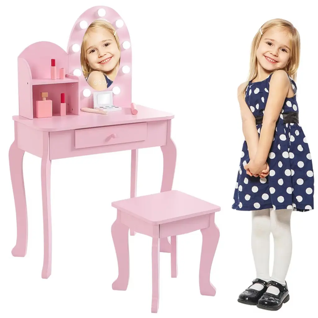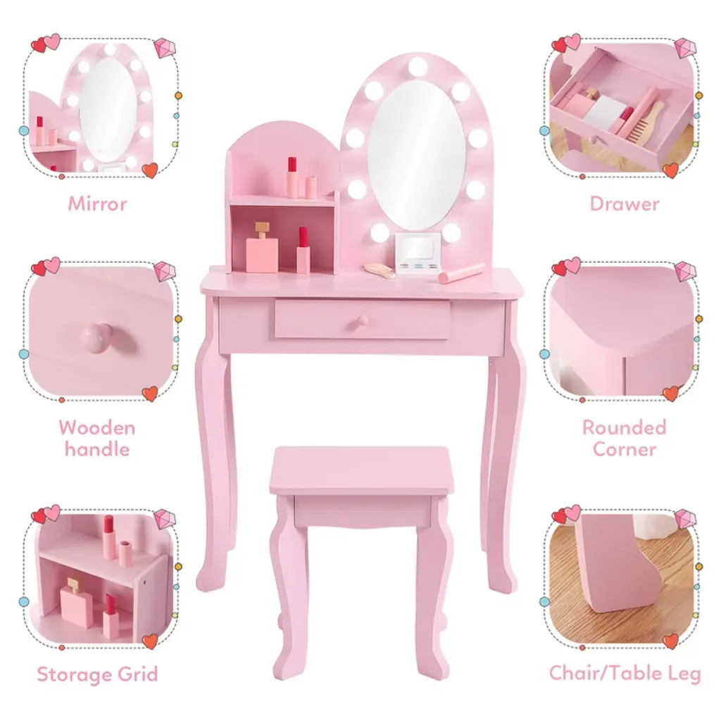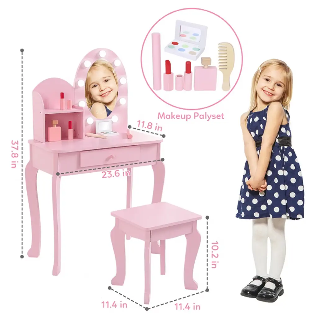 Princess Vanity Set For Girls - Kids Makeup Table With Touch Lights, Mirror, Stool, And Wood Playset