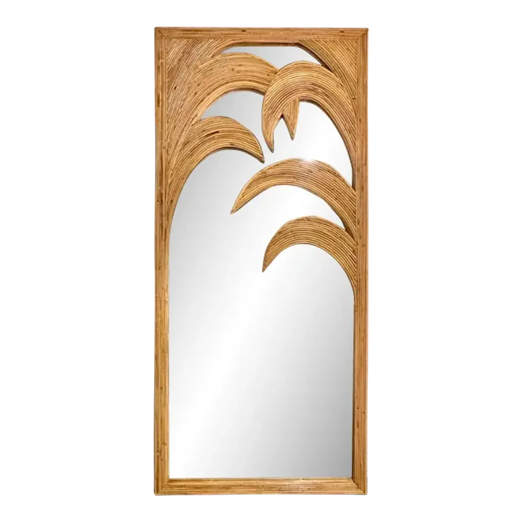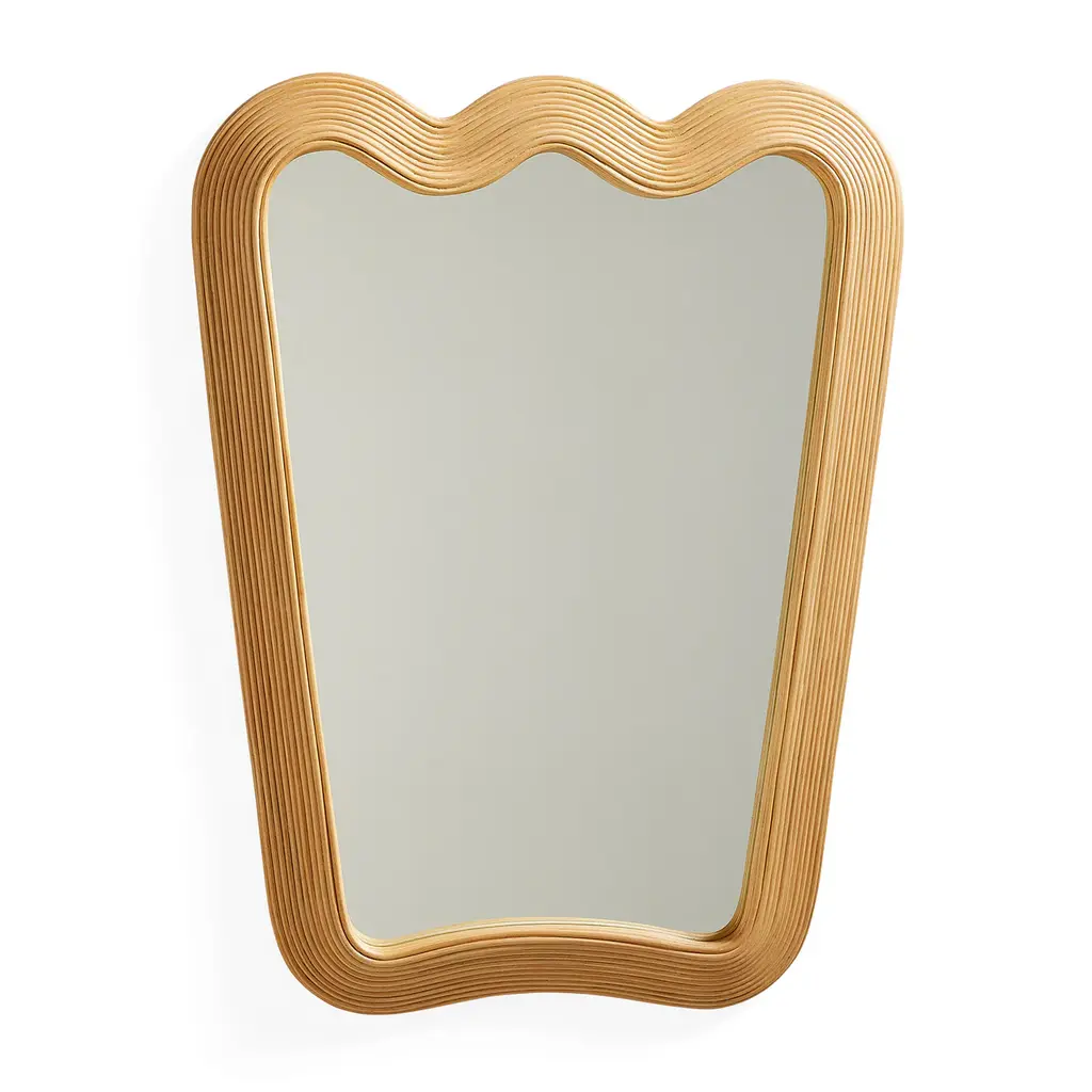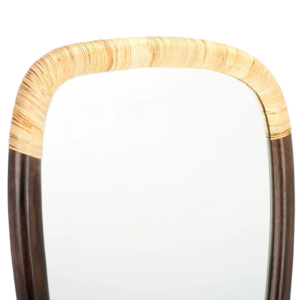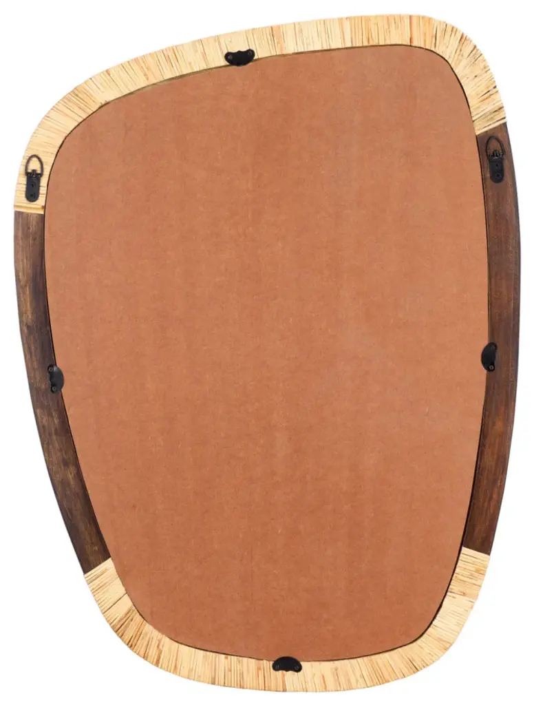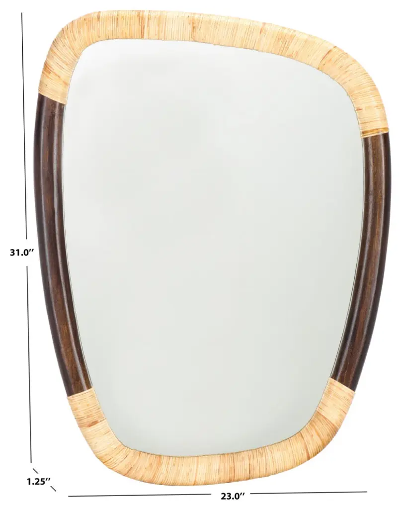 Liven up your decor with our charming and richly textured Rupa mirror. The natural textures and artisanal appeal of our handmade mirror offer inviting drama and elegance. With softly curved edges and an asymmetric shape, the mirror lends organic quality and interest to any corner. Cane is beautifully wrapped around its rounded frame. It creates a stunning contrast with its deep brown Mango wood frame. Offering elevated warmth and style, our mirror adds stunning dimension to your entryway table, console, or mantel. It can amplify natural light and offer the perfect spot for style checks and touch-ups.