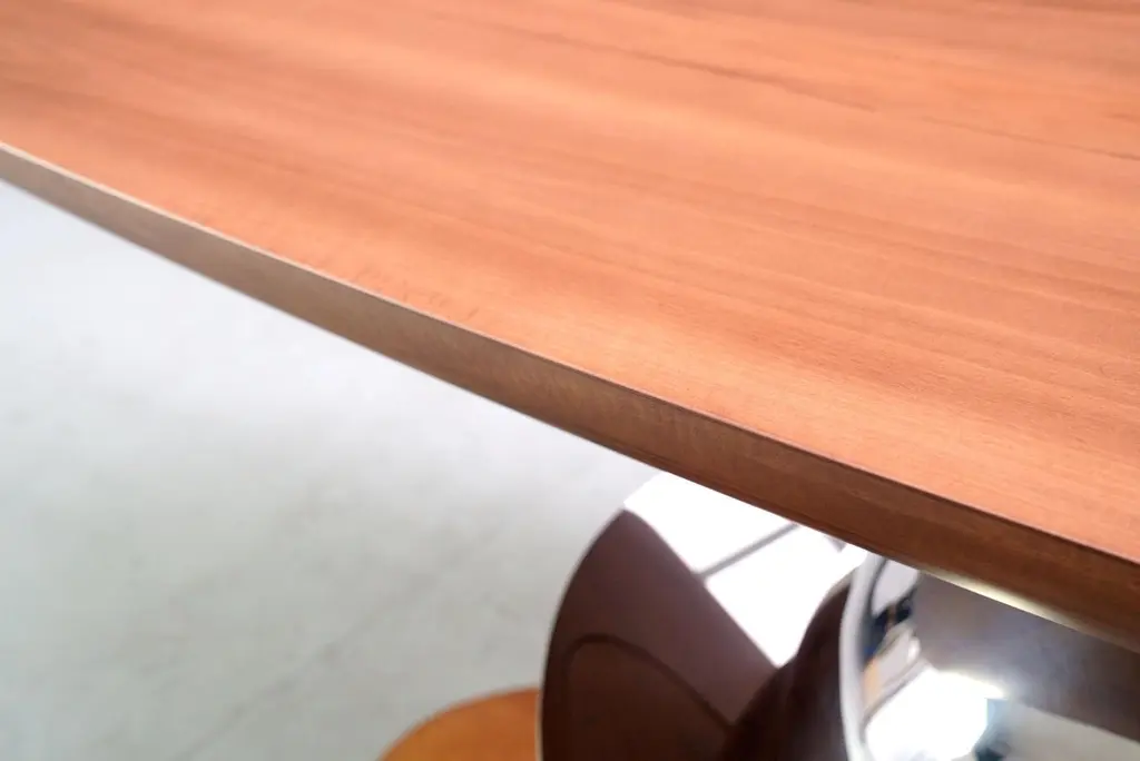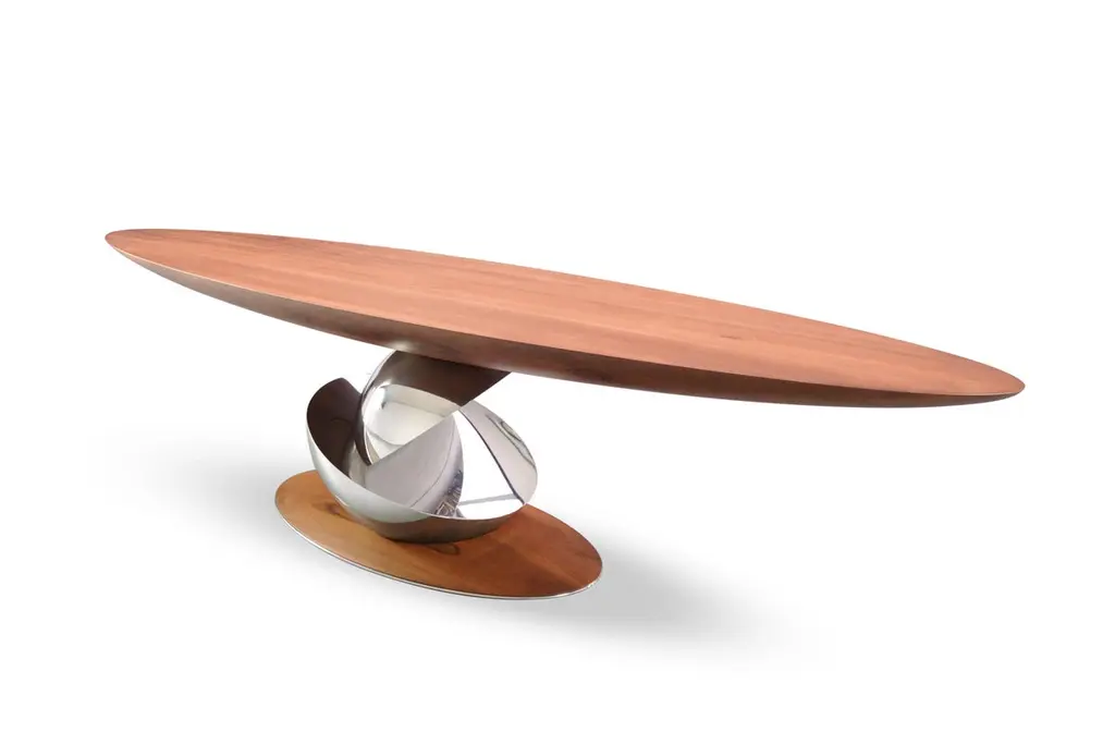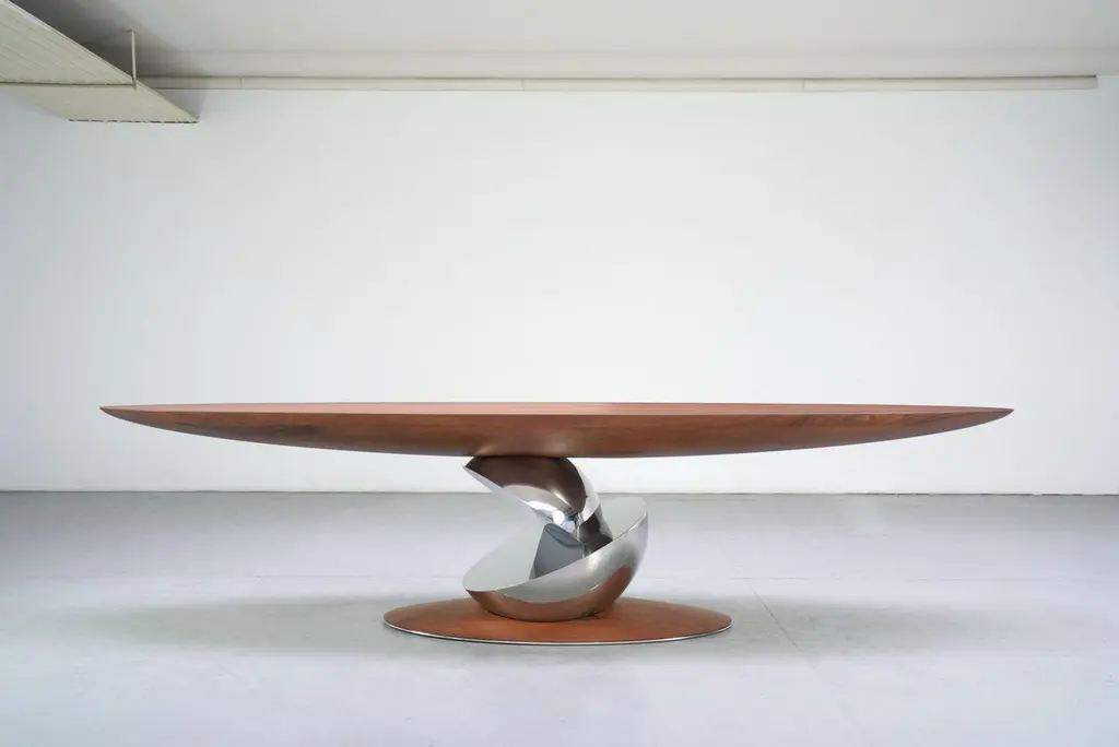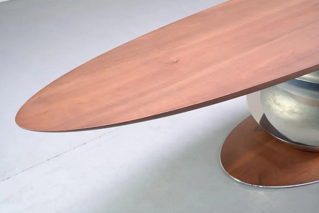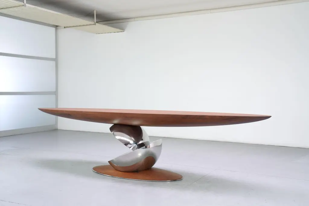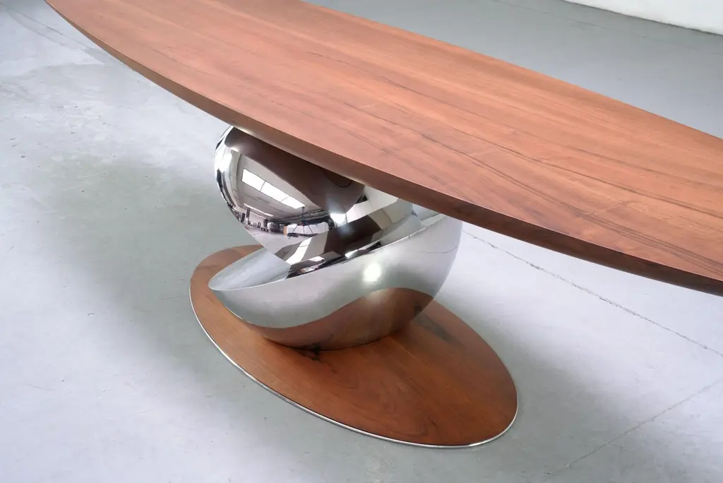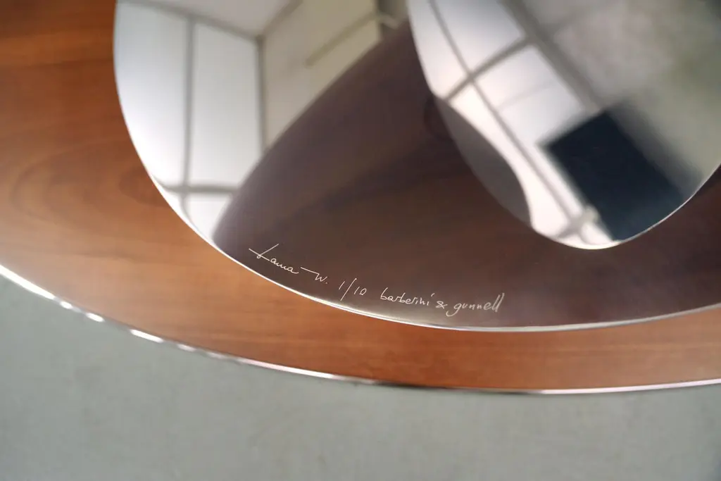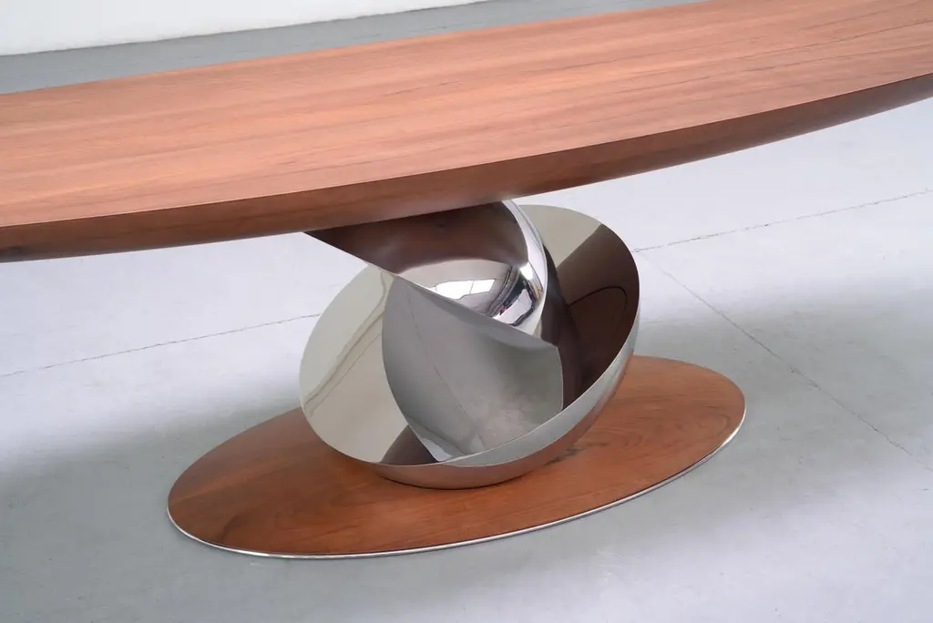 Balanced between stability and movement, light yet sharp, dynamic and suspended—these adjectives best describe the sensation one feels when admiring the 'Lama Wood' console. It appears sculpted by the wind or shaped by the perpetual flow of water.Two stainless steel hemispheres support the top, creating the illusion of an ethereal, almost magical suspension.A piece that seamlessly combines the perfectly smoothed surface of solid European Nut wood, finished with an open-pore treatment to preserve its natural feel, with the brilliance of mirror-polished stainless steel, so luminous that it seems to dissolve into the space.The sculptural 'Lama Wood' console is crafted in a limited edition of only 10 pieces, making it a rare and exclusive addition to any high-end interior.Limited Edition of 10 pieces. Can only be bought by collectors who already own 5 artworks by Barberini & Gunnell.Materials: Solid European Nut, stainless steel.Dimensions: L 360 cm (141.7 in), W 82 cm (32.3 in), H 86 cm (33.9 in). Dimensions are customizable.Each table is hand signed and numbered by the artists (engraved), 100% handmade in Italy and comes with a “Certificate of Authenticity”.The artworks by Barberini & Gunnell are regularly shown at international art fairs, such as PAD London, PAD Genève, PAD Monaco, Salon Art and Design New York, Art Miami.IMPORTANT INFORMATION REGARDING SHIPPING:Please contact us for an independent shipping quote as we provide high quality shipping at competitive prices due to our frequency of shipping, relations with international shipping companies and the possibility to organize directly from Italy.We take care of the entire customs procedure and paperwork. On request we organize a white glove delivery and installation of the artwork inside of the property of the client. All shipments are ALL-RISK insured.We carefully pack all artworks in strong wooden crates to ensure safe transport. This service is done directly in our atelier and is complimentary. All of our artworks travel with a shock watch system in order to monitorate rough handling by shippers and movers.