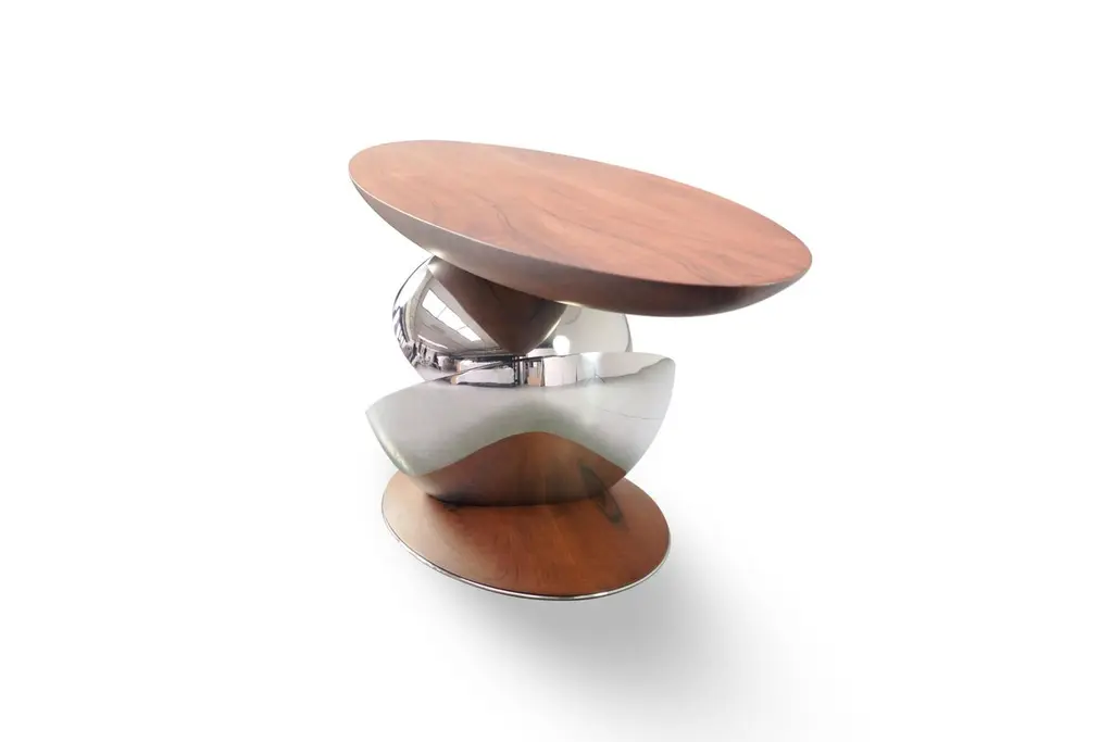 Sculptural Console Table, Walnut Wood And Polished Mirror Steel Limited Edition