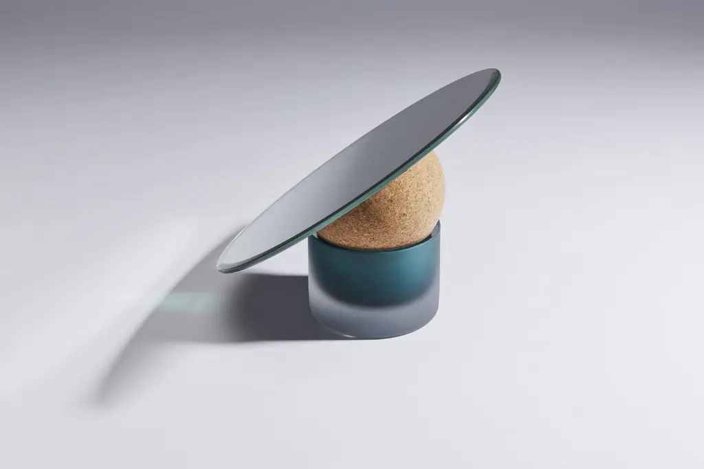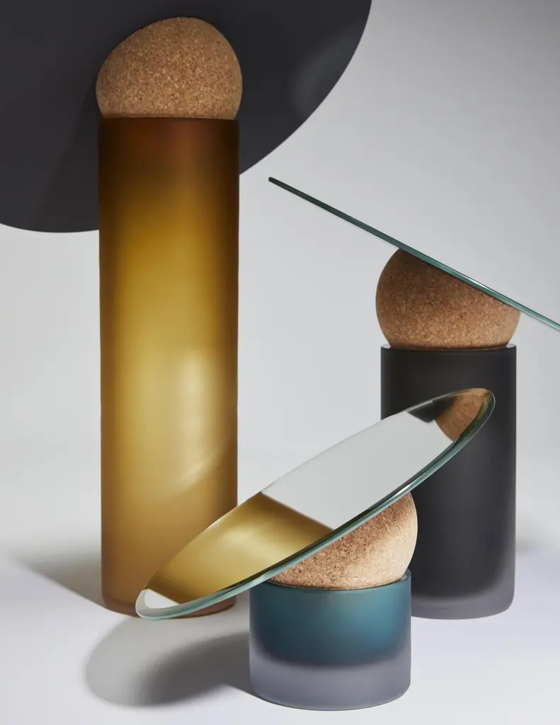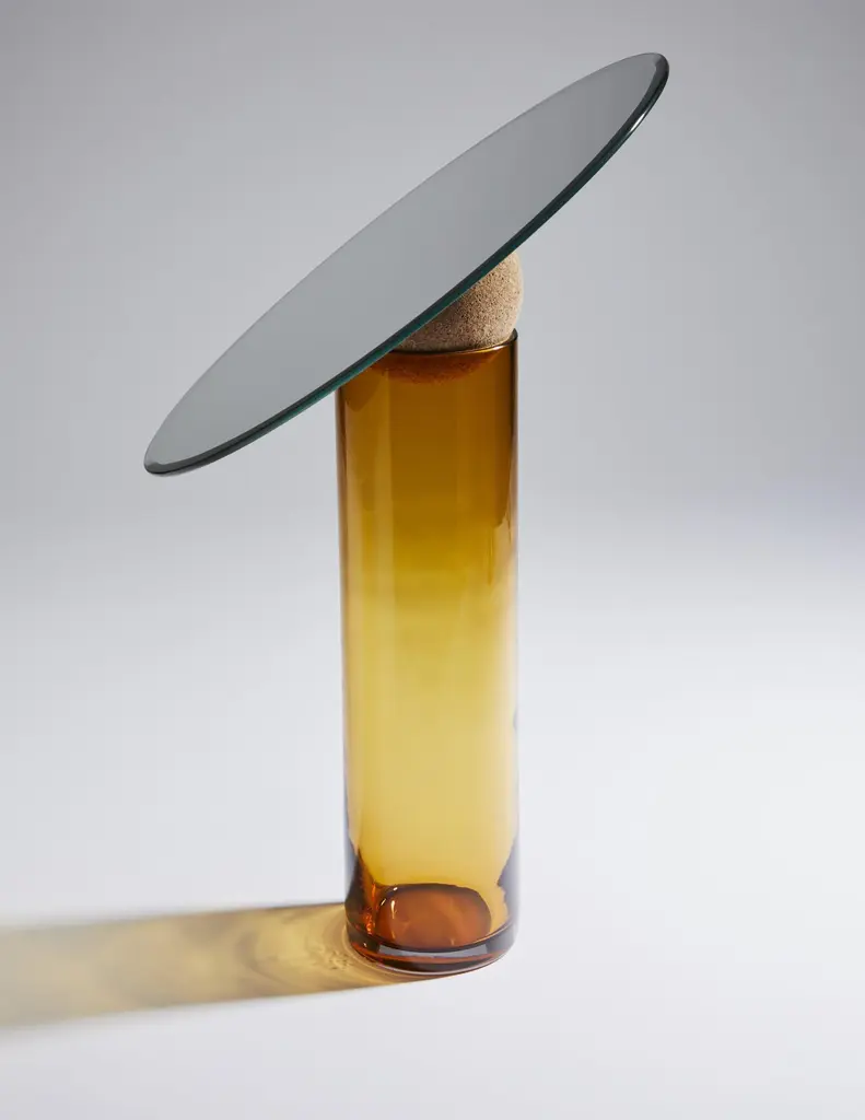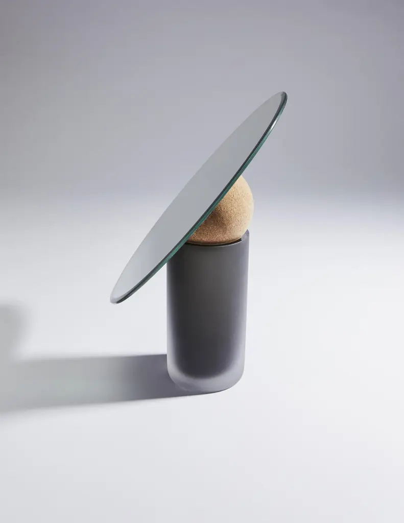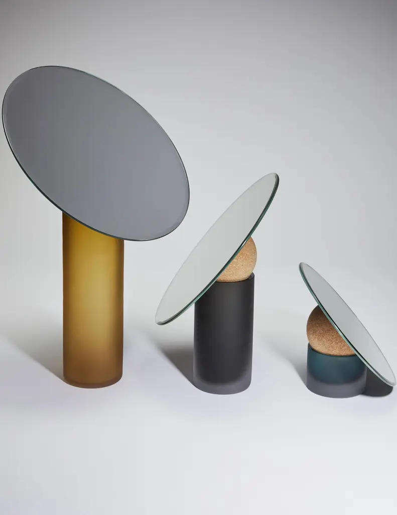 A set of 3 astra table mirrors by Clemence BirotDimensions: Ø 34 x 50 cm; Ø 30 x 33 cm; Ø 24 x 20 cm.Materials: mirror, glass, cork. Clemence Birot started her career in Copenhagen, Denmark, and discovered a design practice closely related to craftsmanship. The latter plays an avant-garde role. Motivated by a free artistic practice and enriched by its know-how, it dictates the exploratory and innovative dynamic in the design process.Thus in the design studios she worked for, she frequently collaborated with artisans for the product development (tableware, interior accessories). Their know-how led her to the constant research of a unique result where the material is respected and despite technical challenges always in focus. The material itself occupies this central place throughout all the project. Back in France, she hold on to this collaborative approach with craftsmen, whether for the initial phases of creation or for bespoke pieces production.At a time of mass production, the product origin is often vague, far from our territories and our values.Today, Clemence wishes to go further in this process of enhancing hand intelligence and unique know-how, while producing ethically and locally. In this spirit she develops a range of objects in small series, with clean shapes, through which she claims this attachment to natural and sustainable materials, a timeless design far from industrial standard. All these objects are manufactured in France or in Europe, as close as possible to the places of the raw materials production, by craftsmen with outstanding know-how.
