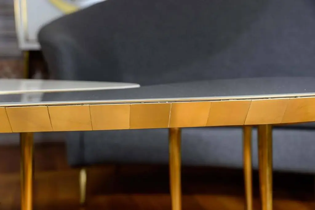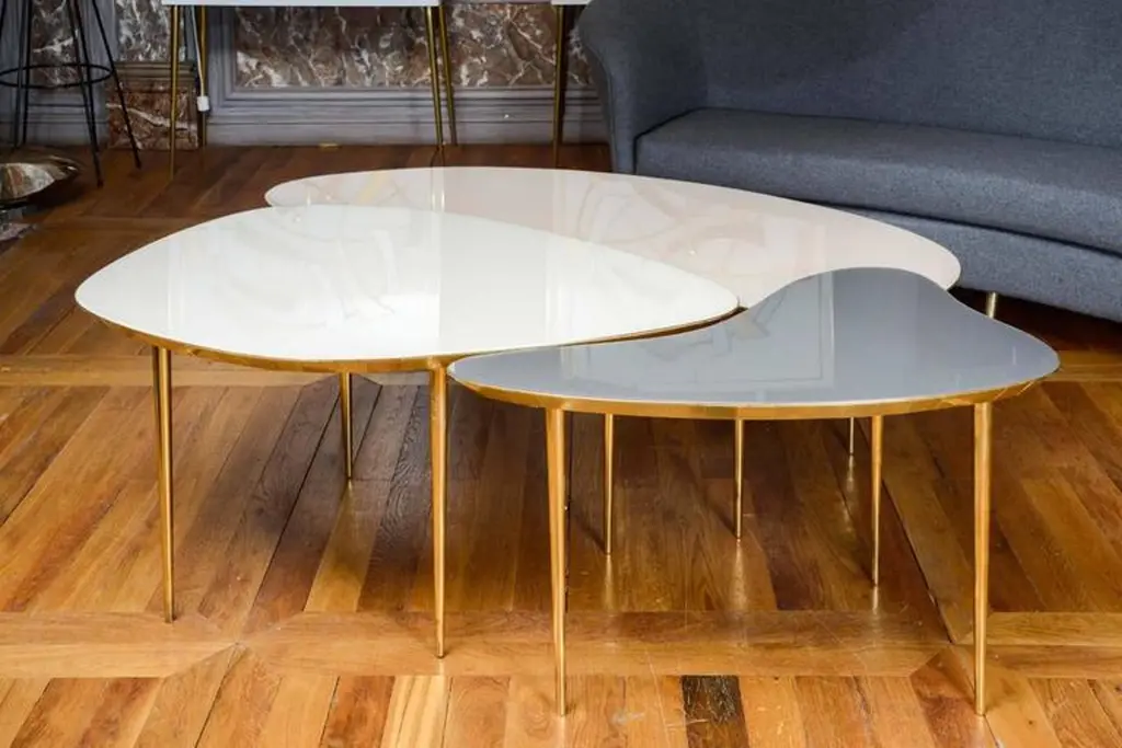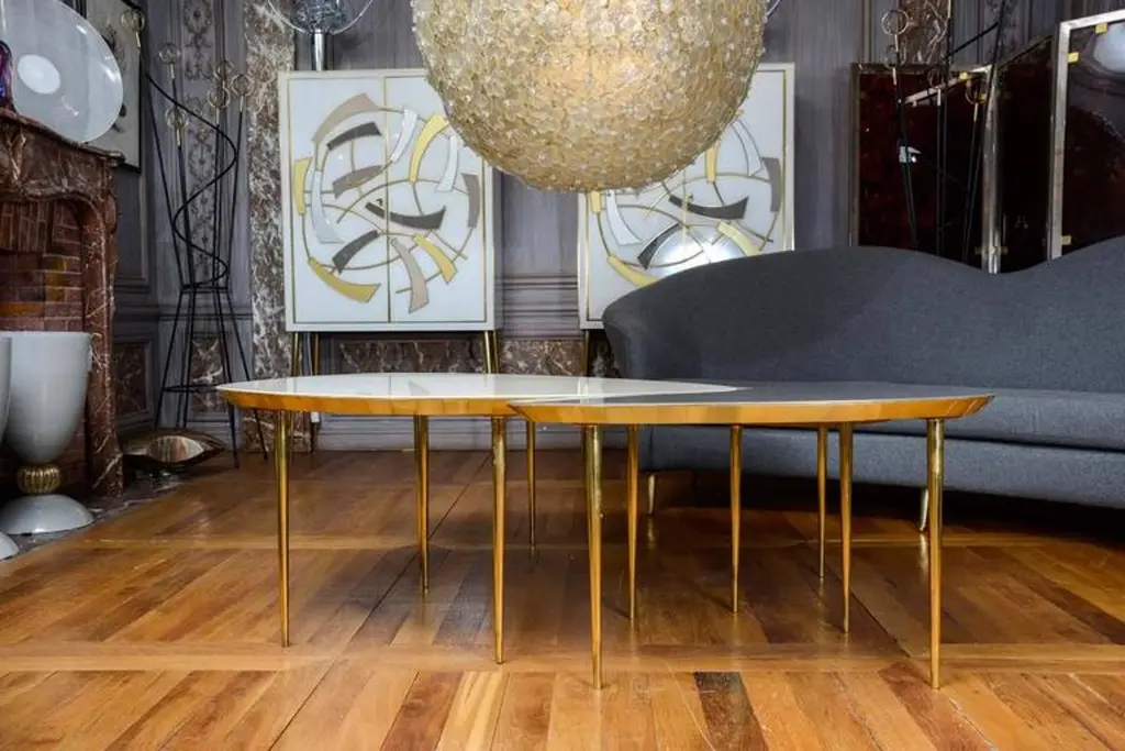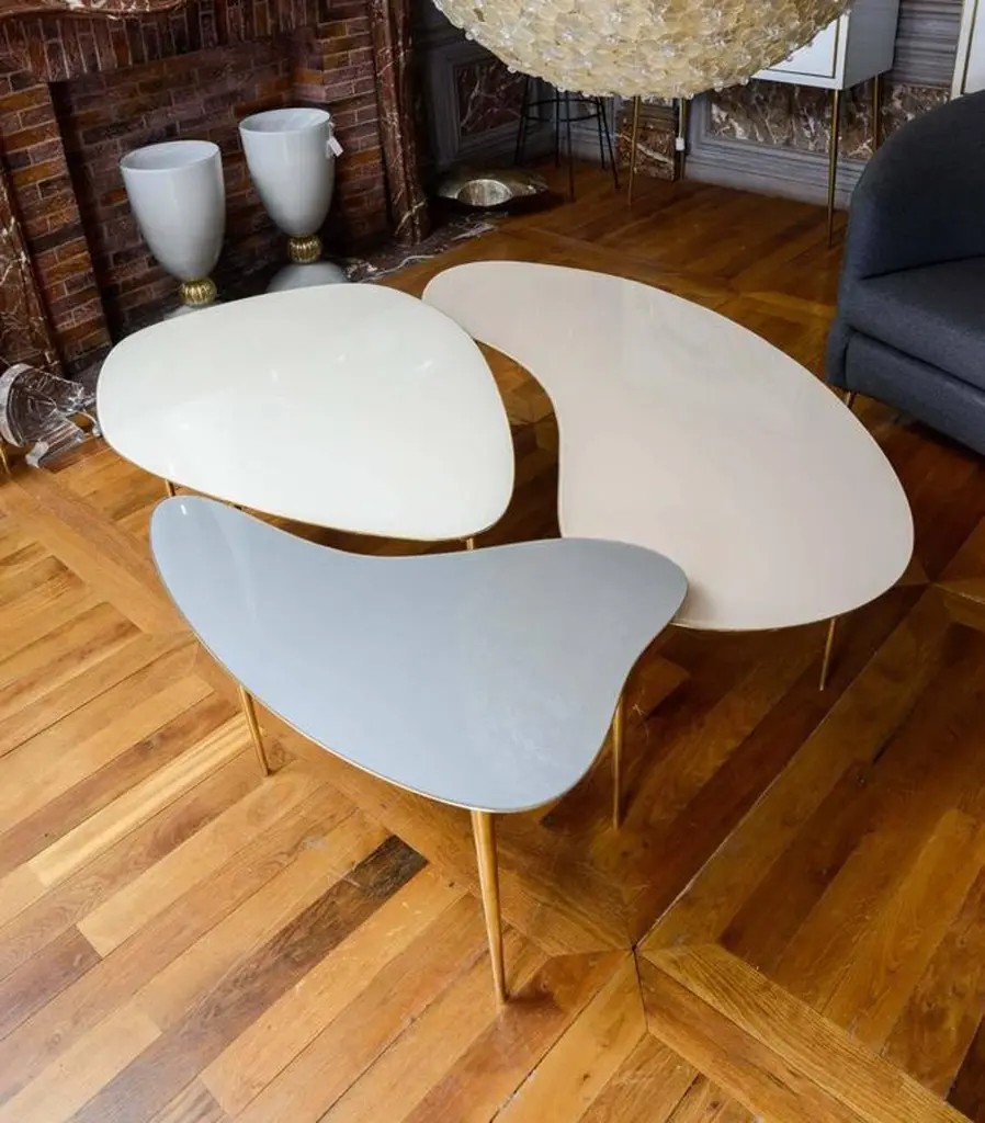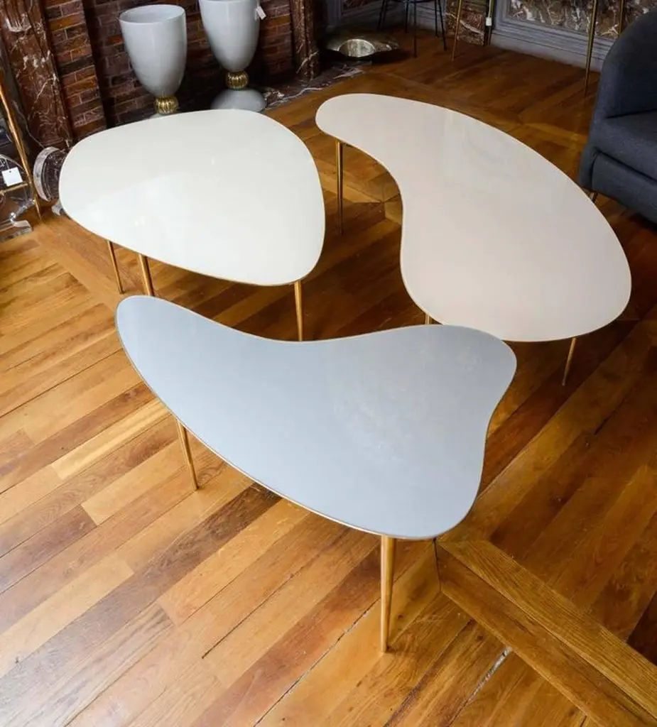 Set of three tables with colored glass top, brass base, crated by Studio Glustin. Several colours for the tops are available on request, delivery delay one month.Dimensions:137 x 53 x H 43 cm,99 x 69 x H 49 cm,77 x 48 x H 49 cm.