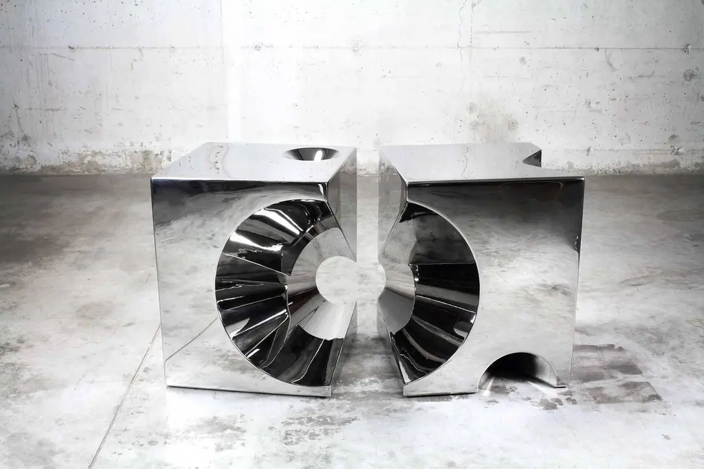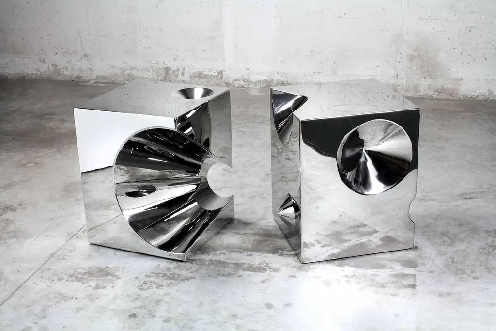Side table "Get Lost!" made of mirror polished stainless steel, colored golden via a particular procedure. The coloring is not a varnish but penetrates the steel and therefore is very resistant. This side table can be used as a stool.Peter Marino selected an sculptural bench of the Get Lost! family for the new flagship store Dior in London.Side table dimensions: L 45 W 45 H 57 cm. Dimensions are customizable. Each side table is hand signed and numbered by the artists ( engraved), 100% handmade in Italy and comes with a “Certificate of Authenticity”.Get Lost in the depth of the cones, mirror polished in order to create a thousand reflections, dream & think!But watch out when sitting down, the pointed cones could be dangerous “Get Lost!”.The artworks by Barberini & Gunnell are regularly shown at international art fairs, such as PAD London, PAD Genève, PAD Monaco, Salon Art + Design New York, ArtMiami.IMPORTANT INFORMATION REGARDING SHIPPING:Please contact us for an independent shipping quote as we provide high quality shipping at competitive prices due to our frequency of shipping, relations with international shipping companies and the possibility to organize directly from Italy.We take care of the entire customs procedure and paperwork. On request we organize a white glove delivery and installation of the artwork inside of the property of the client. All shipments are ALL-RISK insured.We carefully pack all artworks in strong wooden crates to ensure safe transport. This service is done directly in our atelier and is complimentary. All of our artworks travel with a shock watch system in order to monitorate rough handling by shippers and movers.