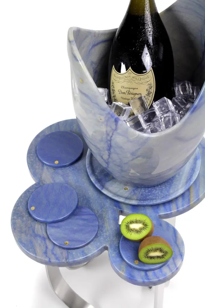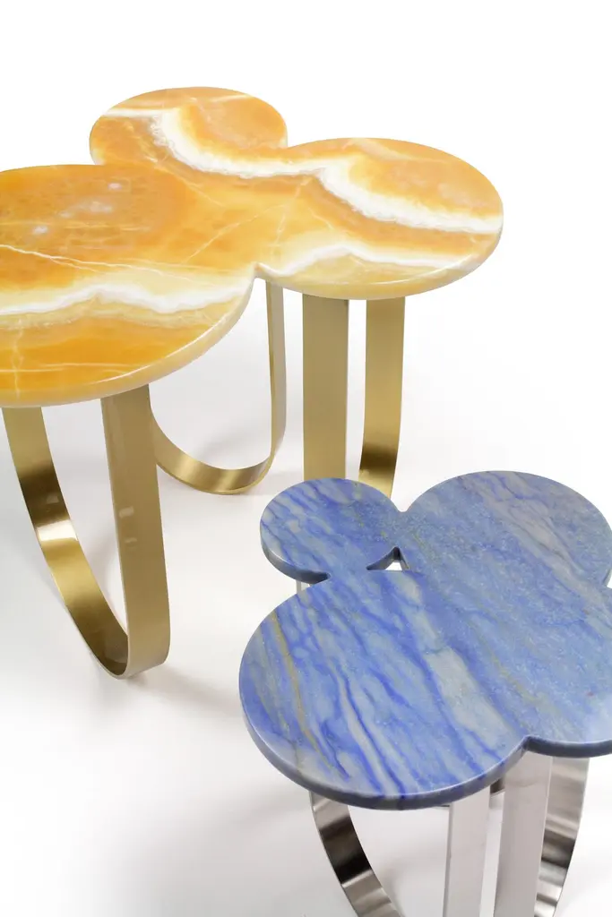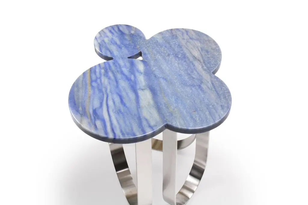 The 'Cloud' is a spectacular side table with structure in mirror polished stainless steel and top in Azul Macaubas quartzite. The mirror-like finishing of the stainless steel creates different perceptions of this particular material and allows interesting reflections of light. Side table dimension: L 46 x W 44 x H 40 cm. Dimensions are customizable. Limited Edition of 45.Each table is hand signed and numbered by the artists (engraved), 100% handmade in Italy and comes with a “Certificate of Authenticity”.We wanted to kidnap a cloud, slice it into thin sheets like it's done with blocks of marble.After, we take the central slab with the most beautiful pattern.To keep the cloud from escaping, we tied it on to weights, disguising them as light, golden legs.Now, that the cloud is fixed to the ground forever we dressed her in the colour of Azul Macaubas which rested for millennia in the depth of heavy mountains.The cloud has become a table and nobody will ever unmask it.The artworks by Barberini & Gunnell are regularly shown at international art fairs, such as PAD London, PAD Genève, PAD Monaco, Salon Art + Design New York, ArtMiami.IMPORTANT INFORMATION REGARDING SHIPPING:Please contact us for an independent shipping quote as we provide high quality shipping at competitive prices due to our frequency of shipping, relations with international shipping companies and the possibility to organize directly from Italy.We take care of the entire customs procedure and paperwork. On request we organize a white glove delivery and installation of the artwork inside of the property of the client. All shipments are ALL-RISK insured.We carefully pack all artworks in strong wooden crates to ensure safe transport. This service is done directly in our atelier and is complimentary. All of our artworks travel with a shock watch system in order to monitorate rough handling by shippers and movers.