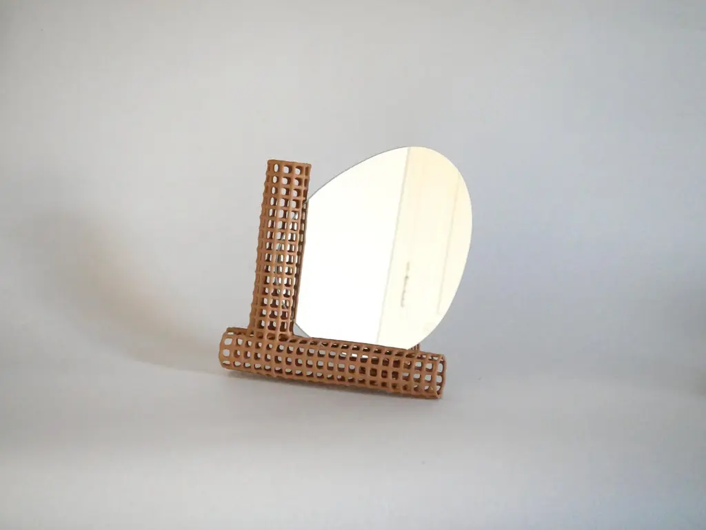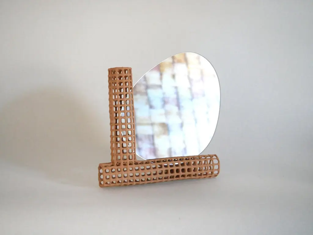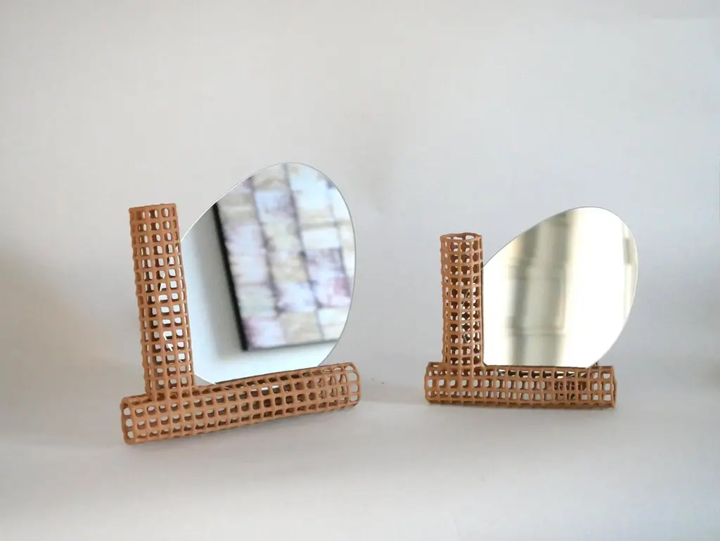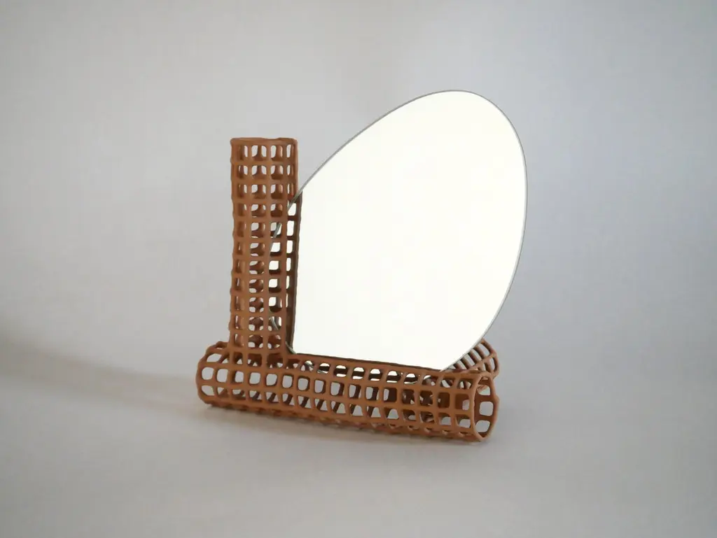 Small Chevalet Table Mirror by Dzovag KotchianDimensions: W 24 x D 11 x H 22 cmMaterials: Stabilized Raw Clay, Metal, Mirror. Dzovag Kotchian's work develops through theoretical reflection and artistic research. Experimentation with materials, uses and manufacturing processes occupies a central place in his projects. Since 2023, he has focused on creating objects in stabilized raw earth using a manufacturing process that he developed over several years. The freedom that his manufacturing technique gives him allows him to create airy and light objects that are sometimes organic and sometimes geometric.