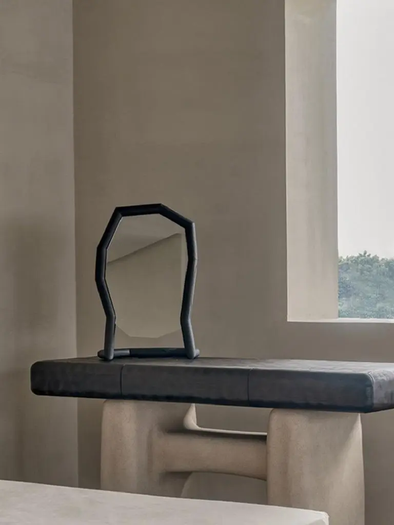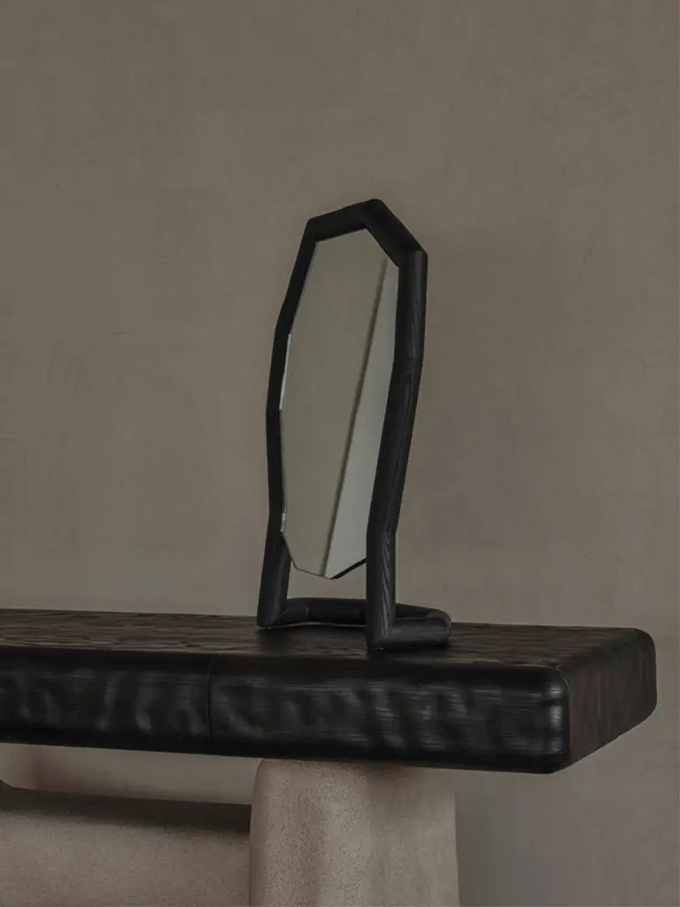Snap Table Mirror by DAaZDimensions: D 15.5 x W 38 x H 58 cm.Materials: Ash wood, mirror.DAaZ Furniture honors the spirit of adventure. We embrace the escape of the ordinary and revel in the magic that’s found in the unexpected. Our artistic ability shines through in our choice of contrasting designs that challenge conventions, tailor trends, and bring out the creative flair in our customers too. Faced with a treasure trove of choices, you are inspired to walk individual paths leading to the unknown, unveiling new sights, enveloping you in the scent of nostalgia.We bring to your home more than just beautiful design, but unique fragments of life stories. After all, what is your home but a blank canvas on which to celebrate your own journey with the people you love.