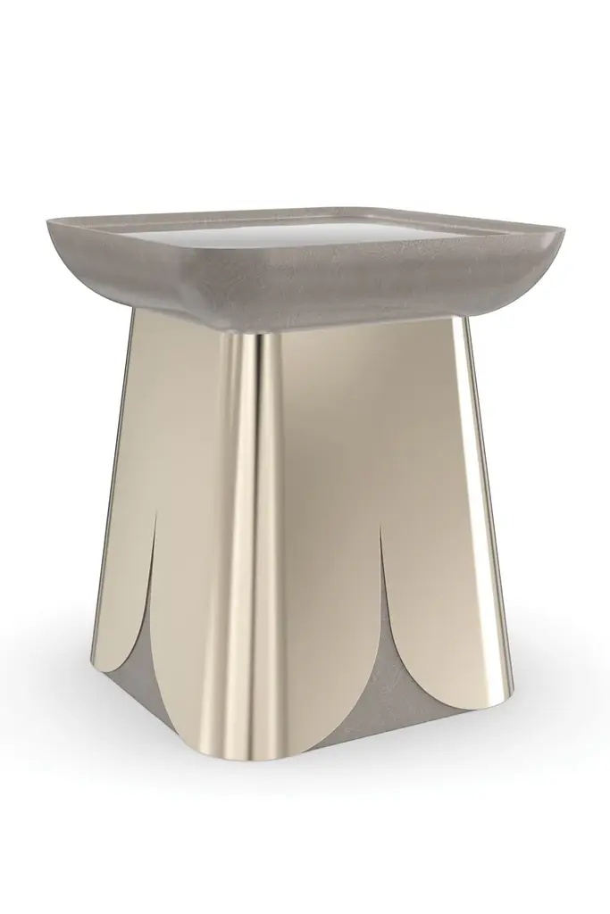 At the pinnacle of form and function, this reflective end table takes inspiration from the arcing paths traveled by celestial bodies. Dazzling the eye and playing up light: a shimmering mix of mirror with polished gold metal and a Charcoal Leaf finish. Style with our softly curved Clipper sectional and Zenith cocktail table for a glamorous yet elegant aesthetic.