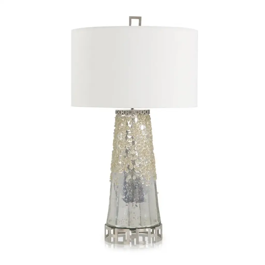 This silvered glass table lamp glistens and gleams with glass fragments encased in clear enamel with a custom designed base of open squares in bushed stainless steel.