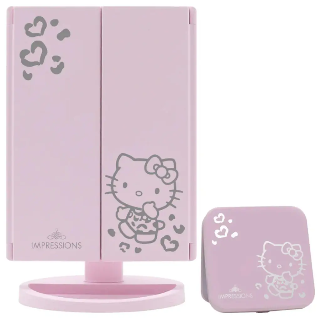 Impressions Vanity Hello Kitty Supercute Trifold Compact Bundle. The lighted compact Mirror with Magnification requires 4 CR2032 3V lithium batteries and 1x and 2x magnified top mirror. Catch every detail with the Hello Kitty Trifold LED Tri Tone Makeup Mirror with Magnification and the Supercute Compact Mirror. LED Tri Tone Makeup Mirror with Magnification comes with front facing soft touch sensor switch with dimming function simply tap to turn on and off or hold down to dim or brighten and also the trifold LED Tri Tone have three adjustable mirror panels including magnified close up mirrors The three mirrored panels of the trifold mirror are easily adjustable to your unique makeup lighting needs. Tri tone lighted makeup mirror includes 2X and 3X Magnification side panel. You can plug into USB at home or install batteries and go cordless, perfect for travel. 4 x AAA batteries required, not included. The Hello Kitty Supercute Compact Mirror adds all the cuteness and magnification while on vacation or on your way to work. Specially curated to have you covered from any angle or location! Available in Pink, White or Black.Features:LIGHTWEIGHT DESIGN: Our desk mirrors are designed with lightweight acrylic. So easy to move over the door. These smart cosmetic makeup vanity for lighting will give you the true travel experienceSOFT TOUCH SENSOR: The cute Hello Kitty compact holds a soft touch sensor to turn on or off and Hold down to adjust the brightness. The Hello Kitty Trifold LED Tri Tone Makeup Mirror has it for dimming and turning on and offMAGNIFIED MIRRORS: The magnifying Dual mirrors have 1x and 2x magnified top mirrors on the Hello Kitty Super Cute Compact Mirror. Also, Hello Kitty Trifold LED Tri Tone Makeup Mirror has 2X and 3X Magnification side panelPORTABILITY MADE EASY: Cordless, lightweight, and AA battery powered (not included) this LED vanity mirror with lights is the perfect travel makeup mirror to carry with you to your lockers, dorms, friend''s houses, theatre class, or any table you can turn into your makeup desk