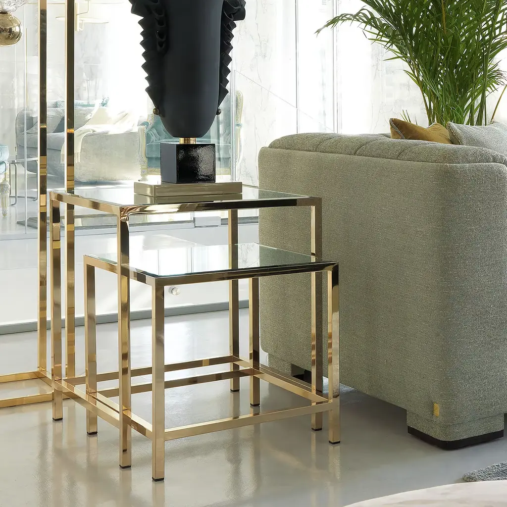 This elegant set of two side tables is an elegant exercise in minimalism and sophistication and will be a versatile addition to any home. Either in a classic or contemporary living room, these two pieces can be displayed separately, or nested one into the other. The square structure is in brass and supports a square mirror top that will strikingly reflect the surrounding light, creating a stunning effect.