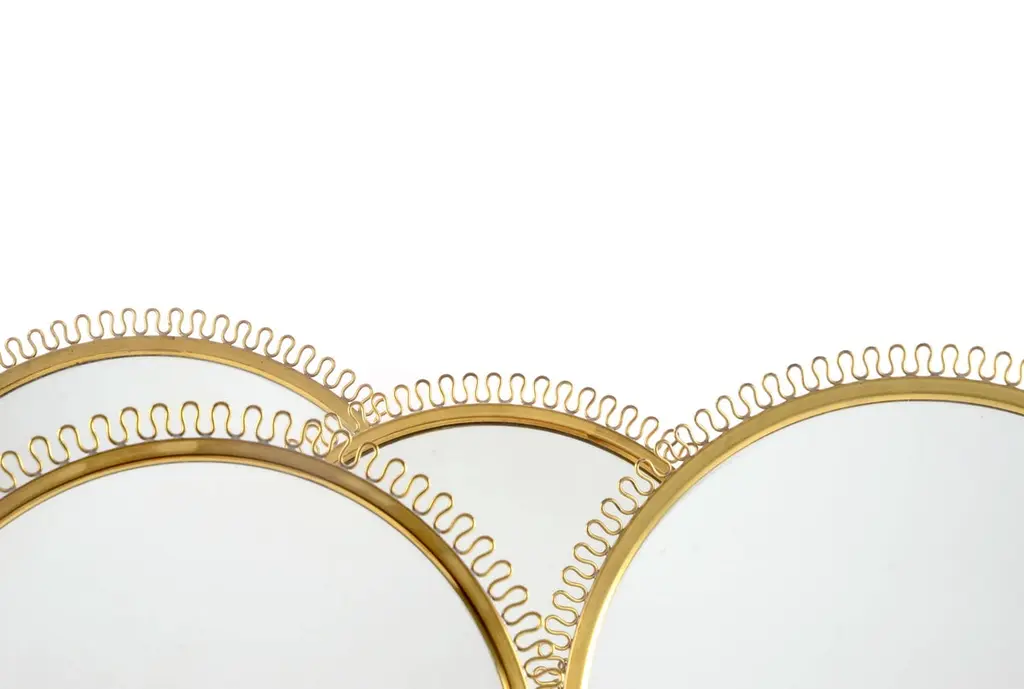 Table mirror in brass designed by Josef Frank for Firma Svenskt Tenn, Sweden, 1950s.Four pieces available, two different sizes.Measures: Height 47, diameter 38 cm 3 500 USDHeight 45, diameter 33 cm 3 800 USD.