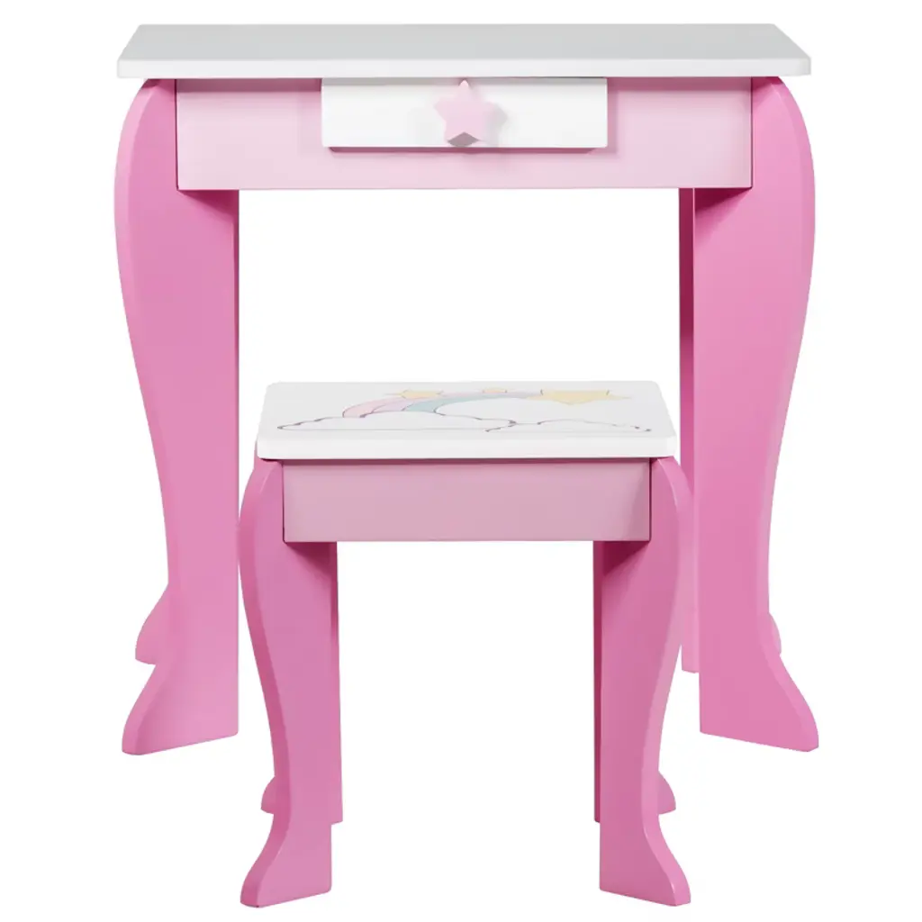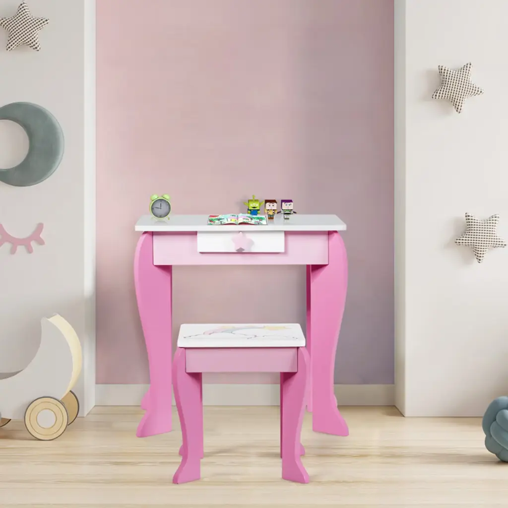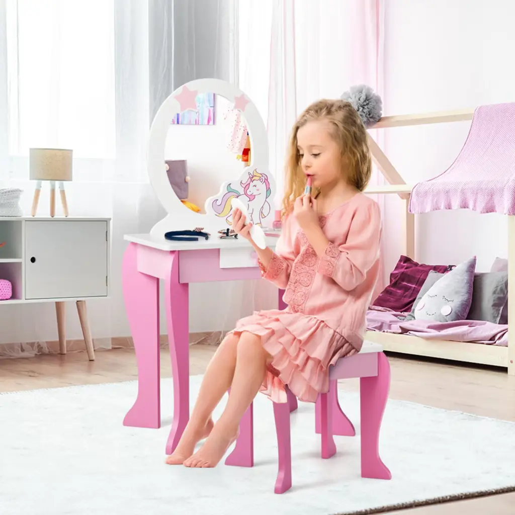 Every girl may have dreamed of being a princess, dressing up face and hair in front of their dresser. Our vanity set, coming with a dressing table and a compact stool, is classic and stylish, catching your kids' eyes and perfectly match their rooms! Constructed of premium MDF board and polished with odourless painting, the makeup table set is sturdy and safe for kids to use. The drawer with spacious space is easy to slide in or out, where kids can conveniently put their little items such as hair clips and makeups. Equipped with a real mirror, kids will see their face clearly and do makeup with ease. In addition, the mirror can be removed to transform the makeup table into a studying desk, which meets your kids' different needs. Without doubt, our vanity desk will be a perfect gift for your little one!FeaturesIncludes a vanity table, a stool, a mirror and a drawerSturdy & secure with high-quality MDF & safe paintingOval mirror with unbreakable glass for better reflectionBuilt-in drawer with star-shaped knob for easy pullingRounded corner and extension feet for added protectionCute outlook with pony printing & pink and white colorsPerfect gift for lovely girls to use it as dresser or deskSpecifications Color: White and Pink Material: MDF Dimension of table: 19" x 14" x 35" (W x D x H) Dimension of stool: 11" x 11" x 11" (W x D x H) Inner dimension of drawer: 10" x 7" x 1" (W x D x H) Net weight: 16.5 lbs Maximum weight of table: 35lbs Maximum weight of stool: 66 lbs Package includes: 1 x Vanity table 1 x Stool 1 x Instruction