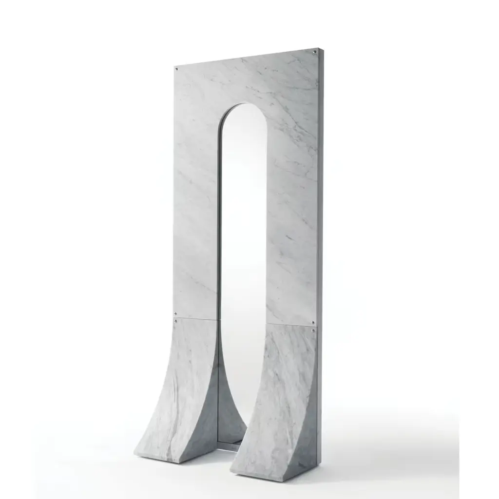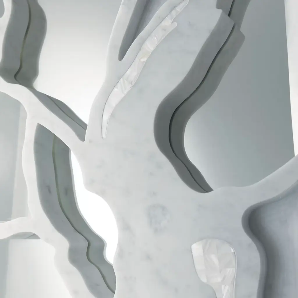 Designed by Gritti Rollo, this elegant double-sided mirror boasts a marble frame featuring an asymmetrical tangle of branches that create a unique interplay of reflections and decorations. The thin frame is enriched with mother-of-pearl inlays, which are a stunning complement to the Carrara marble frame. This elegant piece will make a statement in a modern interior. Other types of marble are available, please contact the Concierge for details.