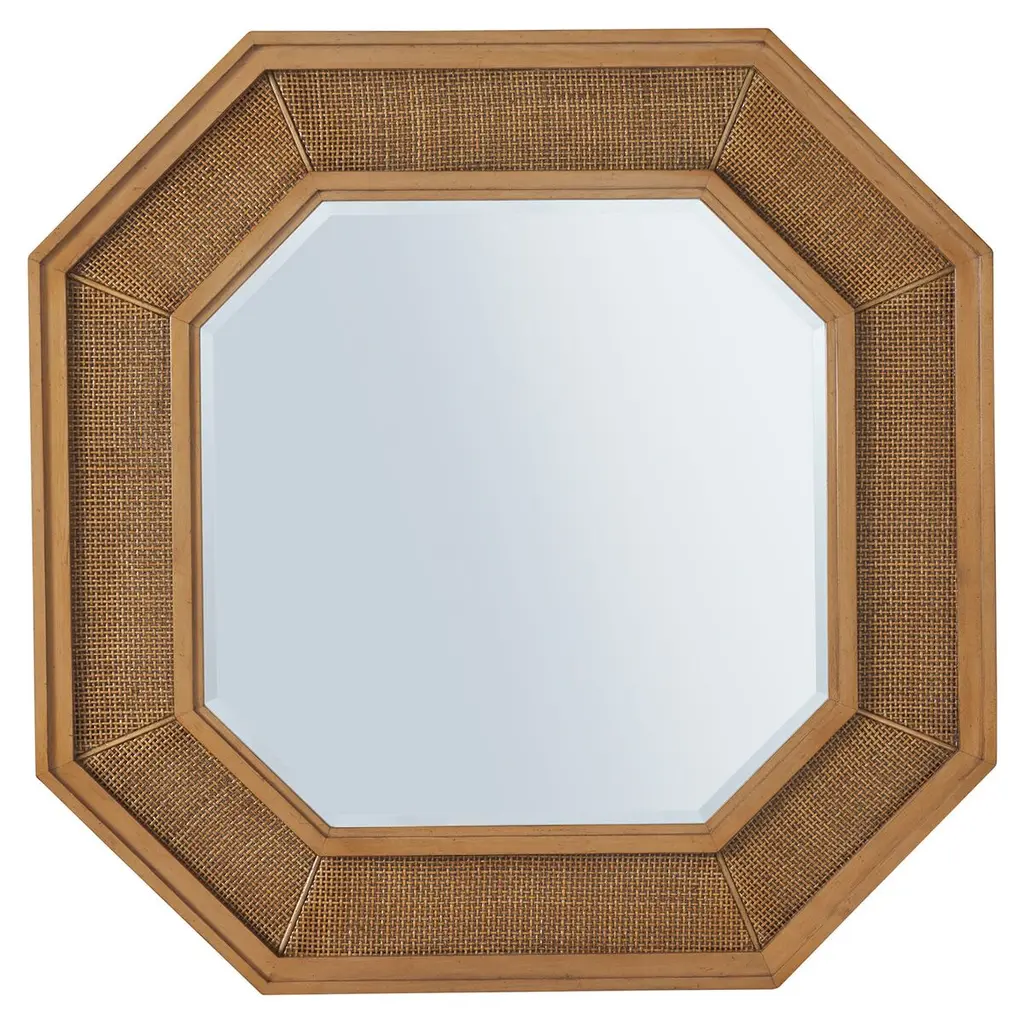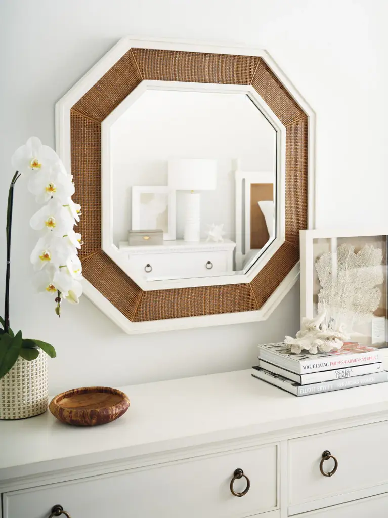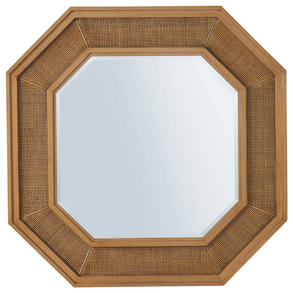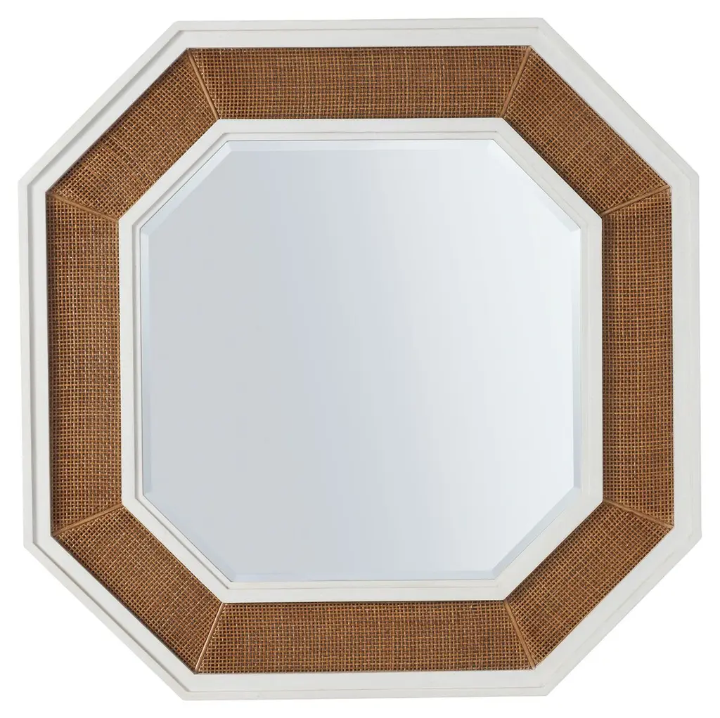 The octagonal mirror features a wooden frame in the white Tides finish with step moldings, and the inset cane around the perimeter in the light nutmeg Table Rock finish. Includes a .75-inch beveled mirror plate.